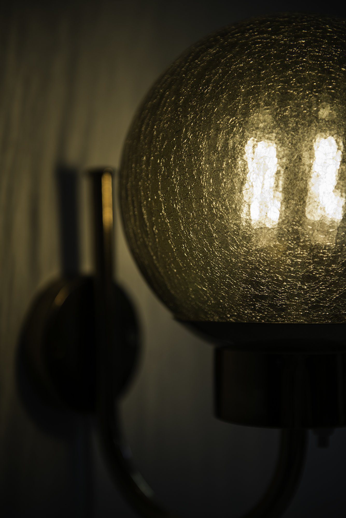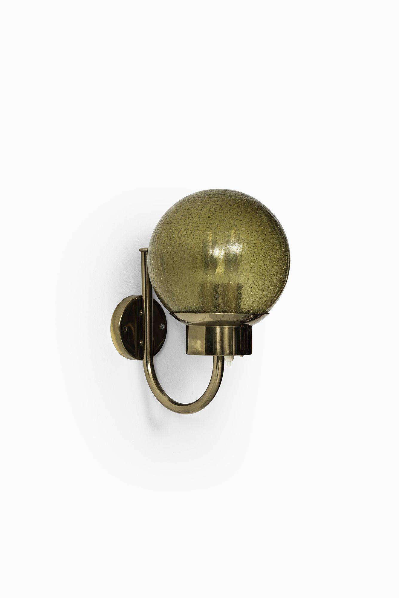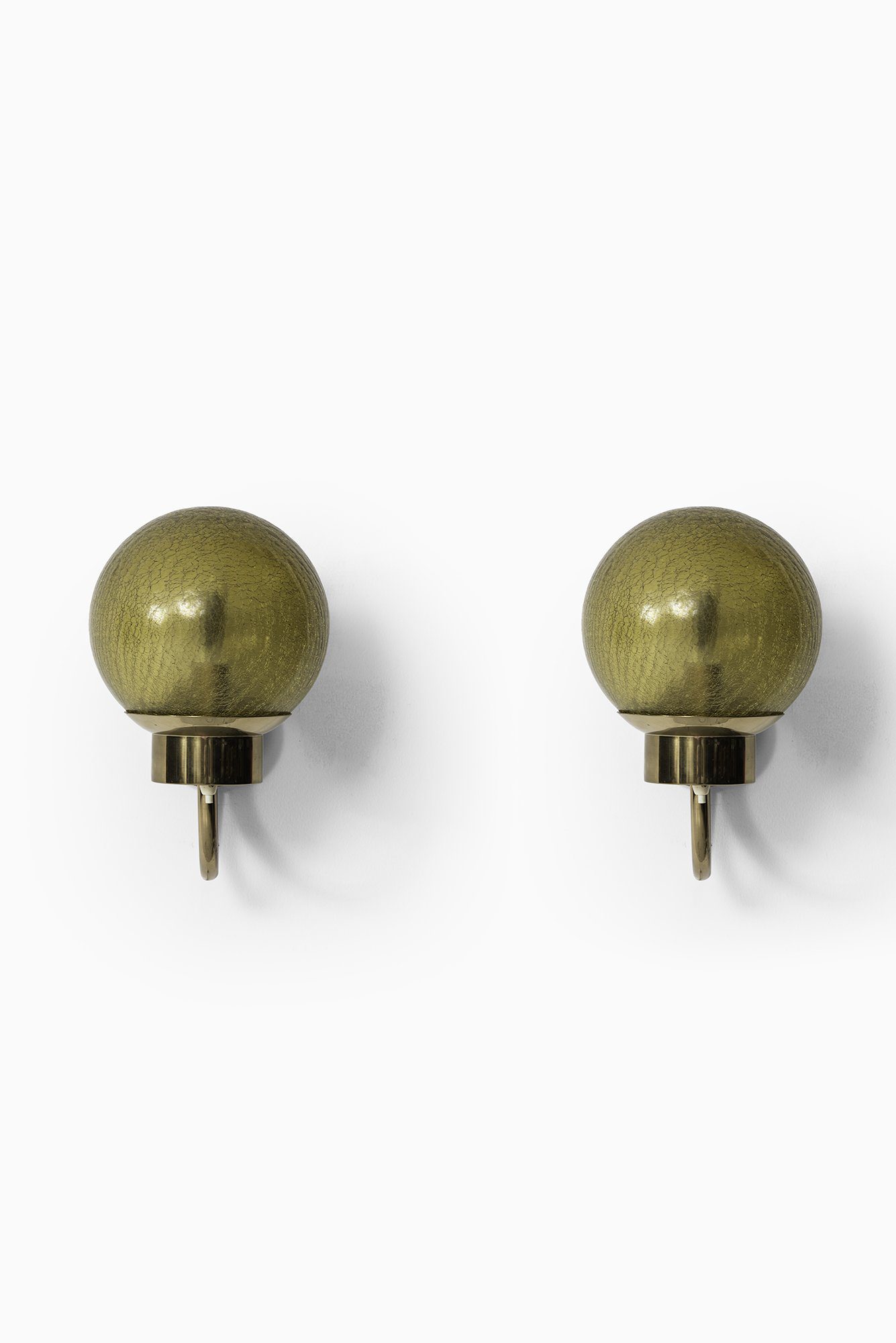 This is a pair of wall lamps, model V-118, produced by Bergboms in Sweden during the 1950s. Each lamp features a curved brass arm with a circular wall mount, supporting a spherical shade in textured amber-colored glass. The glass is characterized by a crackled surface that produces a distinctive light effect, casting soft, patterned reflections when illuminated. The brass retains its original warm patina, which adds depth and character to the overall appearance.
