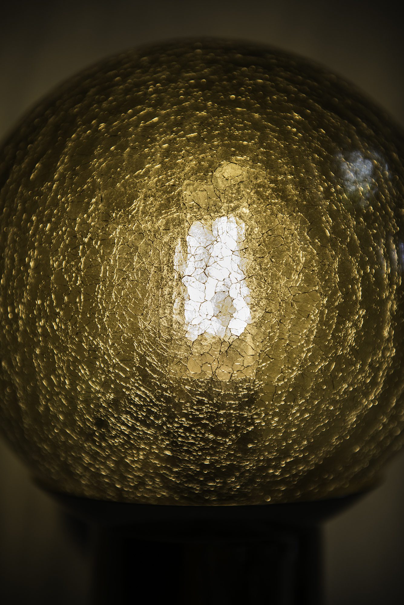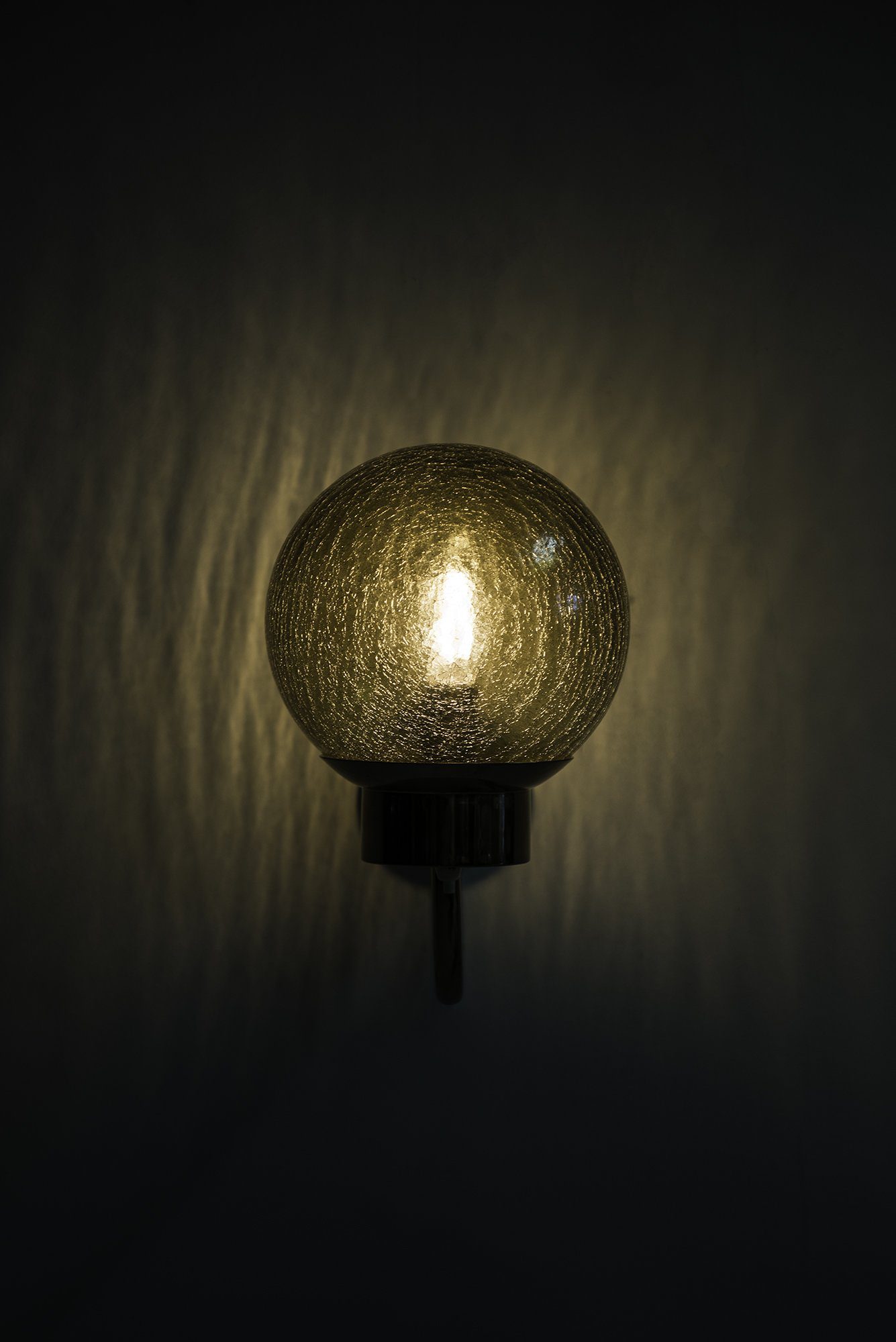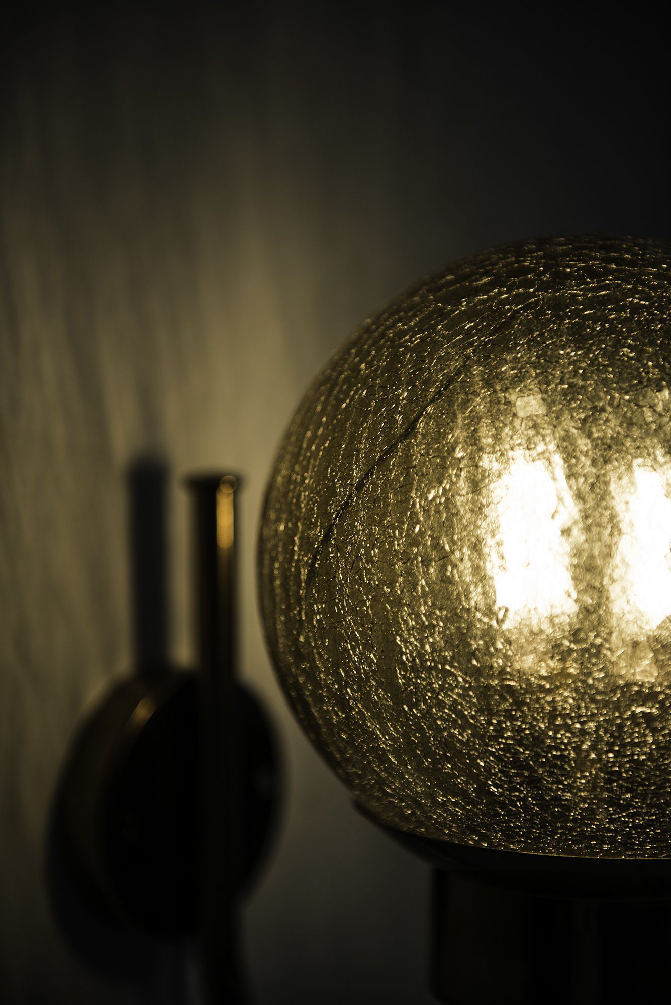 This is a pair of wall lamps, model V-118, produced by Bergboms in Sweden during the 1950s. Each lamp features a curved brass arm with a circular wall mount, supporting a spherical shade in textured amber-colored glass. The glass is characterized by a crackled surface that produces a distinctive light effect, casting soft, patterned reflections when illuminated. The brass retains its original warm patina, which adds depth and character to the overall appearance.