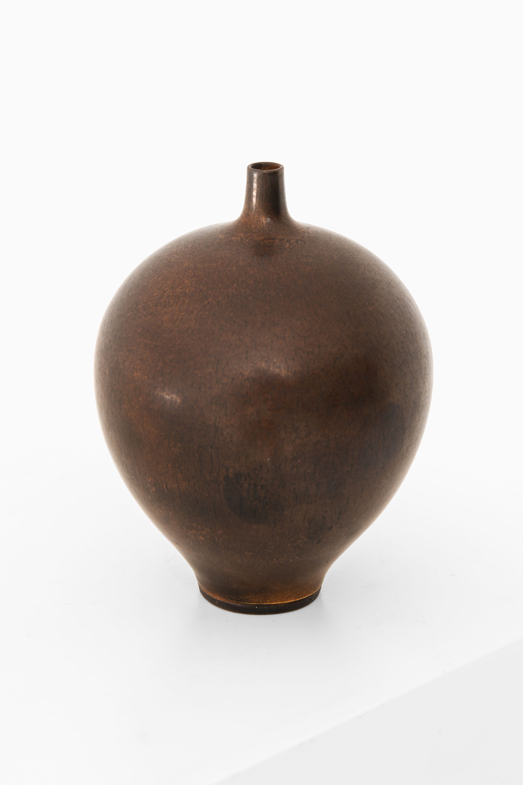 The glaze is a rich, deep brown with nuanced tonal variations, creating a sense of depth and movement on the surface. The finish is semi-matte with a soft sheen that subtly catches the light, emphasizing the curve of the form without becoming reflective or glossy. Friberg was a master of glaze chemistry, and this example shows his hallmark ability to create surfaces that are tactile, controlled, and completely integrated with the form beneath.