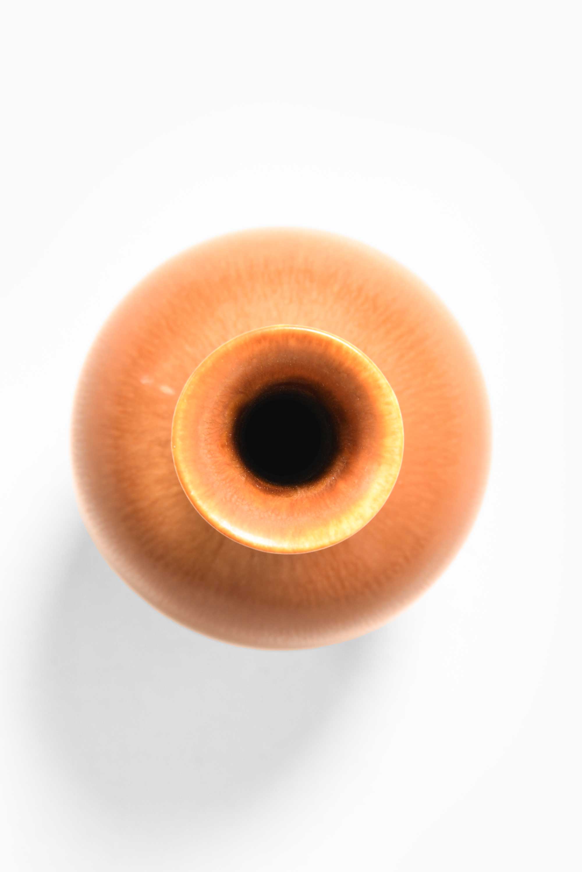 This rare ceramic vase, designed by Berndt Friberg and produced by Gustavsberg in Sweden in 1953, exemplifies the meticulous craftsmanship and refined aesthetic that define Scandinavian studio ceramics of the mid-20th century. The form is characterized by a balanced composition: a rounded body that gently narrows to a slender, elongated neck, which flares subtly at the rim. This elegant silhouette reflects Friberg’s commitment to proportion, symmetry, and the quiet poise of a hand-thrown vessel.