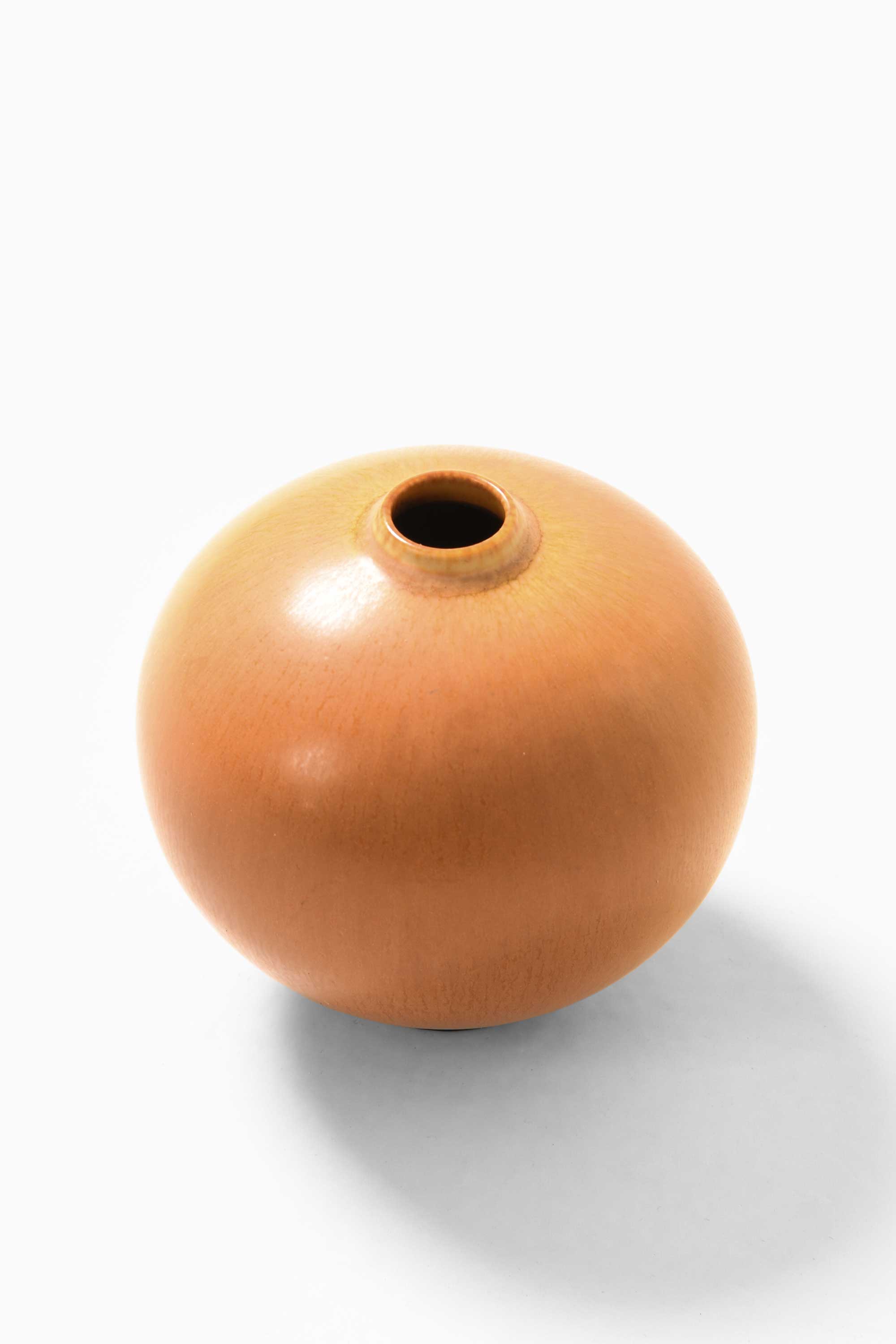 This rare ceramic vase, designed by Berndt Friberg and produced by Gustavsberg in 1958, is an exceptional example of Scandinavian mid-century studio ceramics. Defined by its refined proportions and masterful glazing, the vase reflects Friberg’s singular ability to unite technical precision with quiet, poetic form. It features a near-perfectly spherical body that transitions with measured grace into a short, narrow neck, topped by a subtle, slightly rounded lip. The compact and symmetrical shape conveys balance and restraint, offering a timeless sculptural presence.