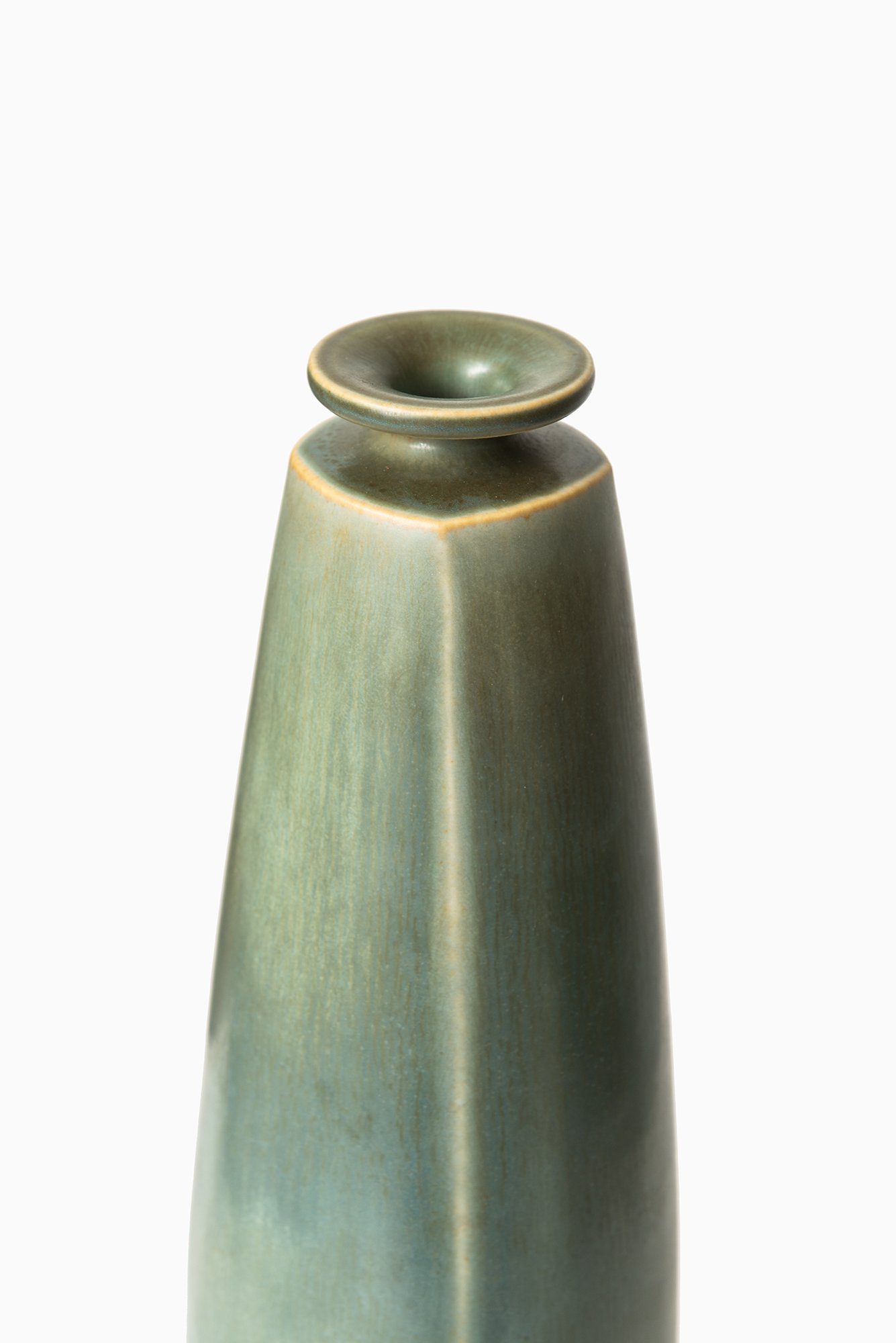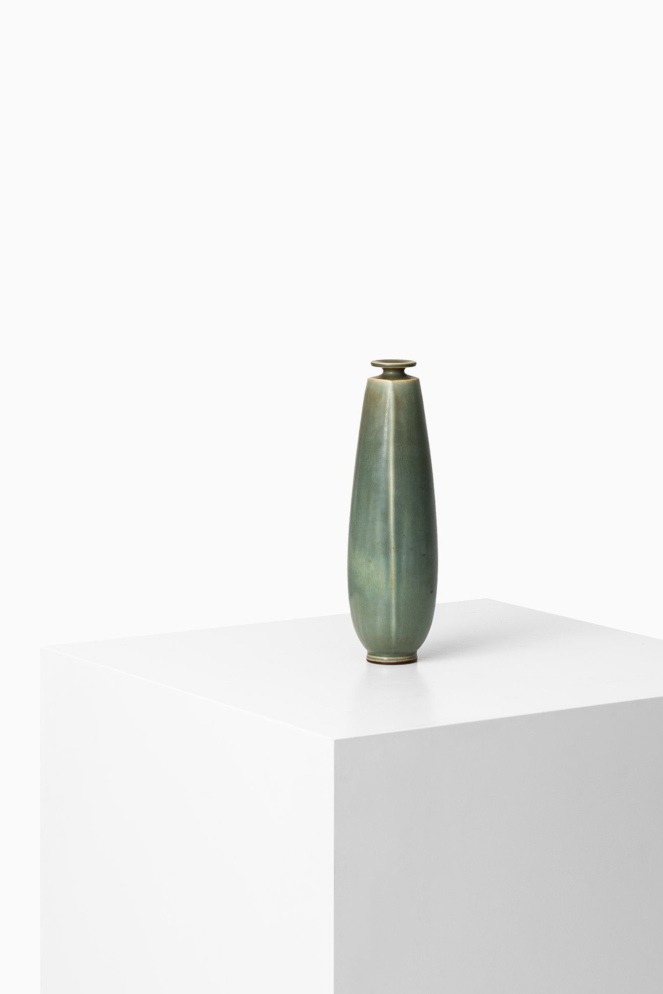 Rare ceramic vase designed by Berndt Friberg and produced by Gustavsberg in Sweden during the 1960s. The piece exemplifies Friberg’s meticulous craftsmanship and technical mastery, displaying his characteristic fusion of precision throwing and subtle glaze work. The vase features an elongated, slightly faceted ovoid form that narrows elegantly toward the neck, culminating in a small flared mouth with a delicately rounded lip.