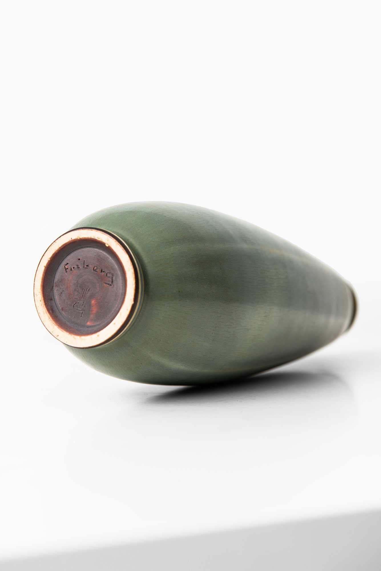 The surface is finished in Friberg’s signature “hare’s fur” glaze, a semi-matte green with fine vertical striations that create depth and movement. Variations in tone—from soft celadon to muted olive—reflect the potter’s exceptional control of glaze layering and kiln atmosphere. The base is neatly inscribed with Friberg’s monogram and the Gustavsberg studio mark, confirming its origin from the artist’s hand-thrown stoneware series.