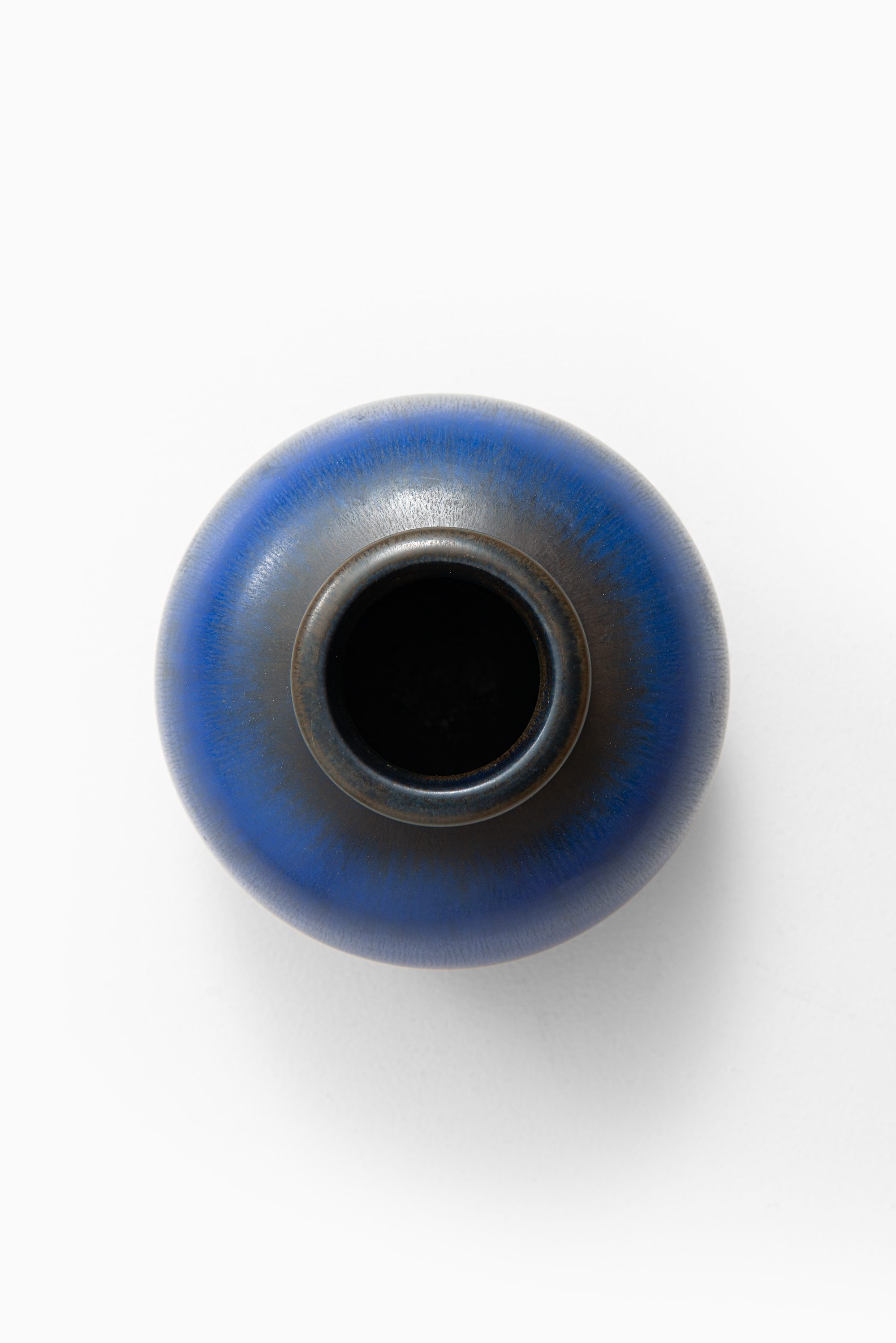 The vase is finished in a rich hare’s fur glaze, a signature of Friberg’s oeuvre. This particular glaze treatment features a deep, luminous blue that transitions into darker hues toward the shoulder and base, with delicate vertical striations suggesting the soft texture of animal fur. The surface reveals subtle movement and depth, enhanced by the matte sheen and fine tactile quality.