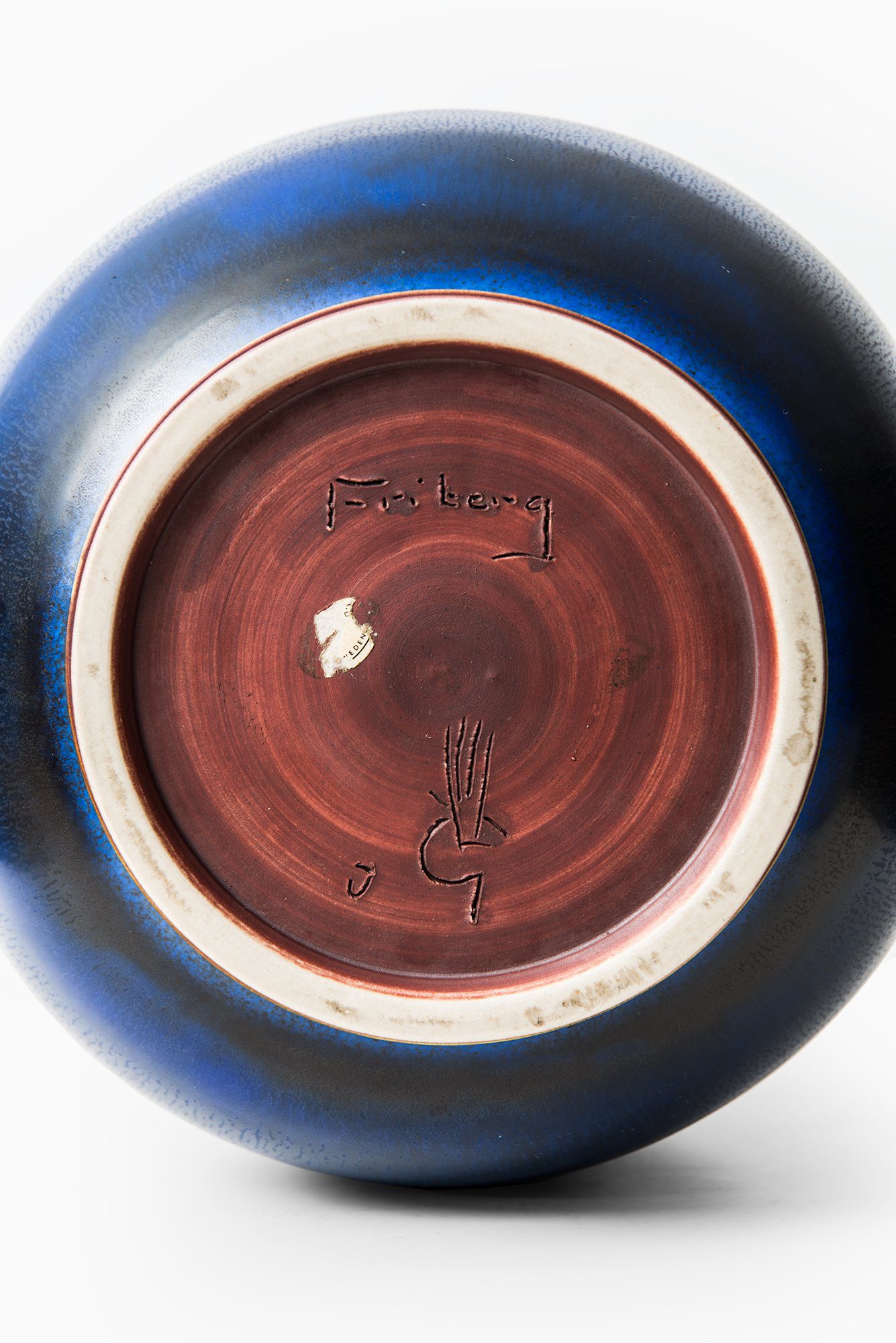 The vase has a soft, rounded form with a broad shoulder and a slightly tapering profile that leads to a narrow, gently flared neck and rounded lip. Its proportions are balanced and harmonious, highlighting Friberg’s mastery of throwing and glazing techniques. The foot ring reveals the reddish-brown stoneware body and is marked with Friberg’s incised signature, the Gustavsberg studio hand symbol, and date code.