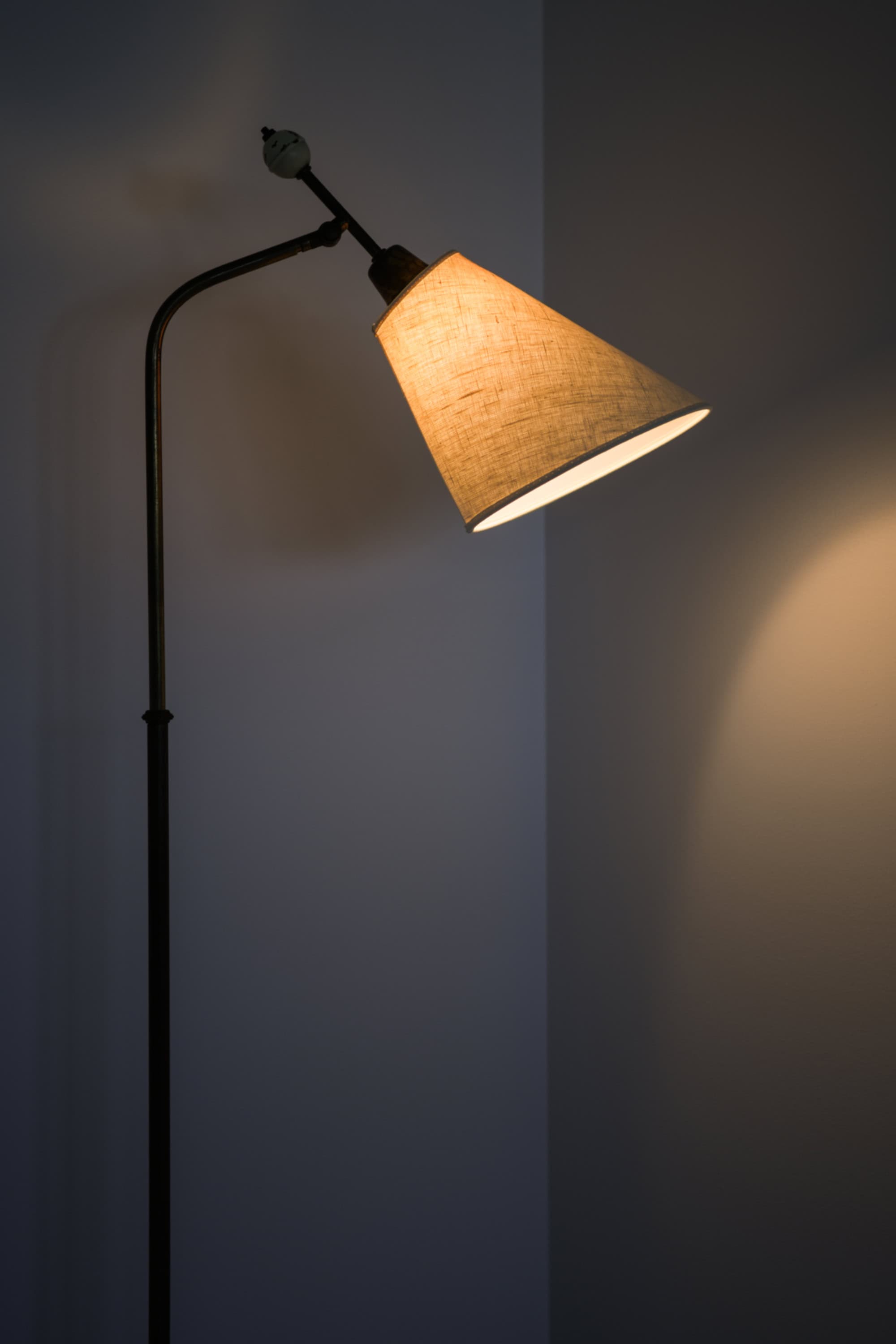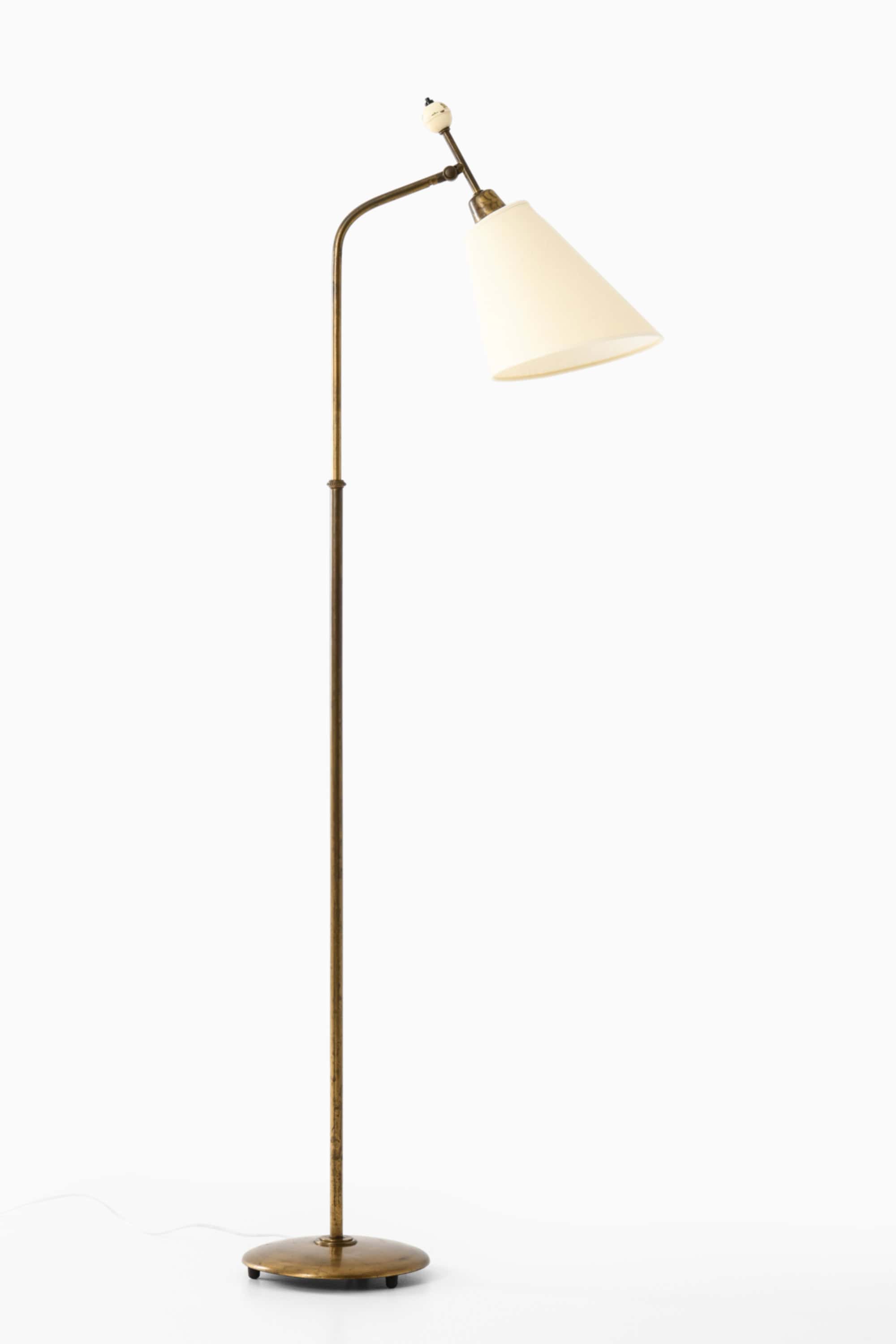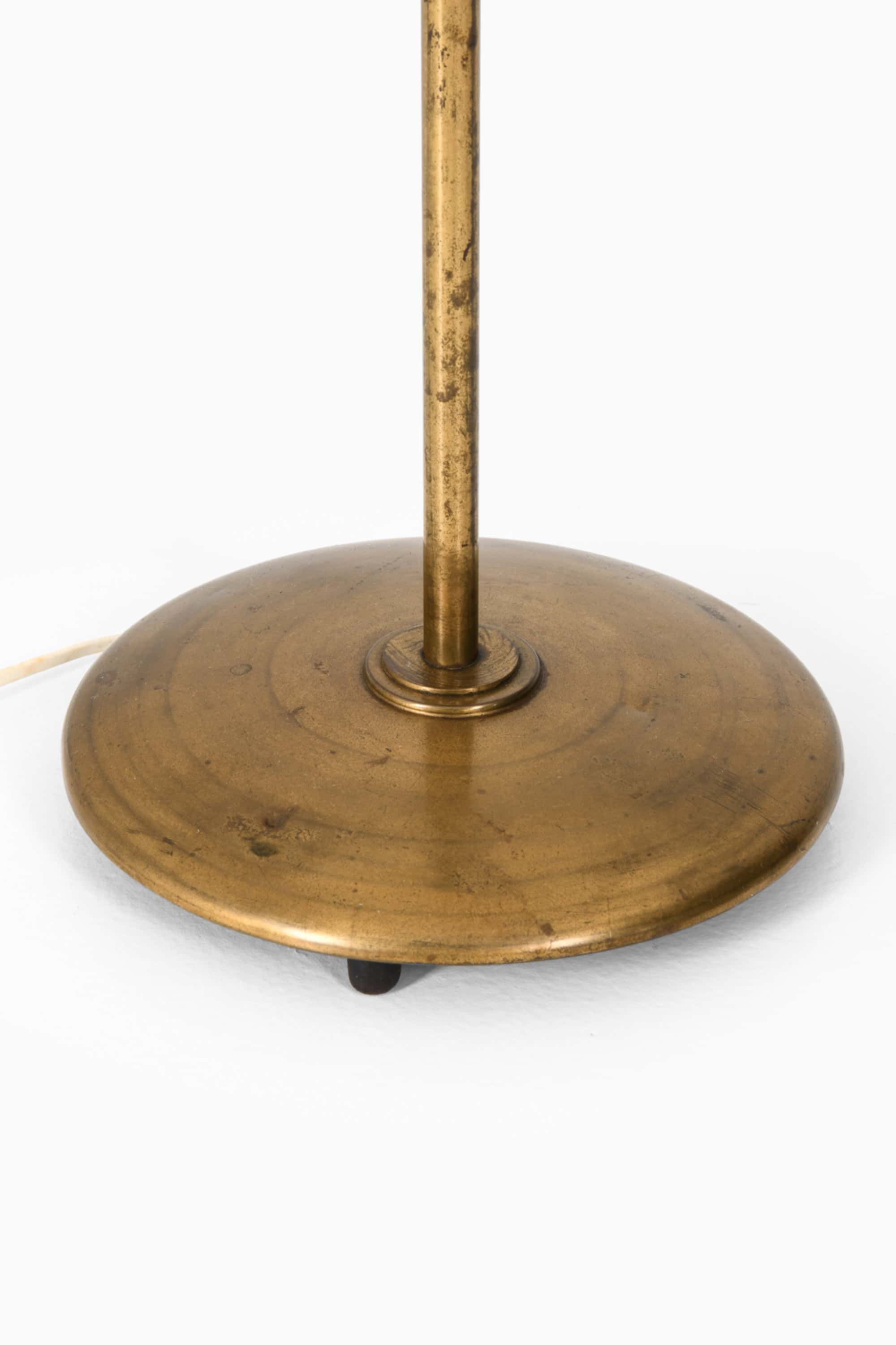 This floor lamp is a rare height adjustable model 31567 designed by Bertil Brisborg and produced by Nordiska Kompaniet (NK) in Sweden during the 1940s. The lamp is constructed in brass with a newly fitted fabric shade, combining the warm, patinated metal with a light-textured textile surface. The silhouette is defined by a slender upright stem, a circular weighted base, and an angled arm terminating in a conical shade, allowing directional illumination.