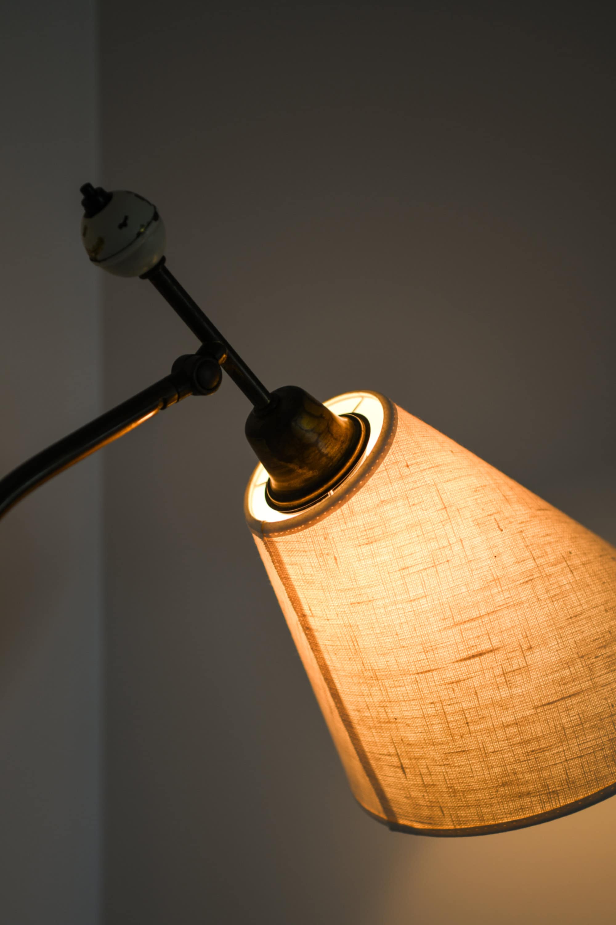 The style of this lamp is representative of Swedish functionalism of the 1940s, emphasizing clean geometric forms, tactile surfaces, and a balance between technical efficiency and visual harmony. The brass structure and textile shade reflect the era’s material palette, while the adjustable construction anticipates later developments in modern task lighting.