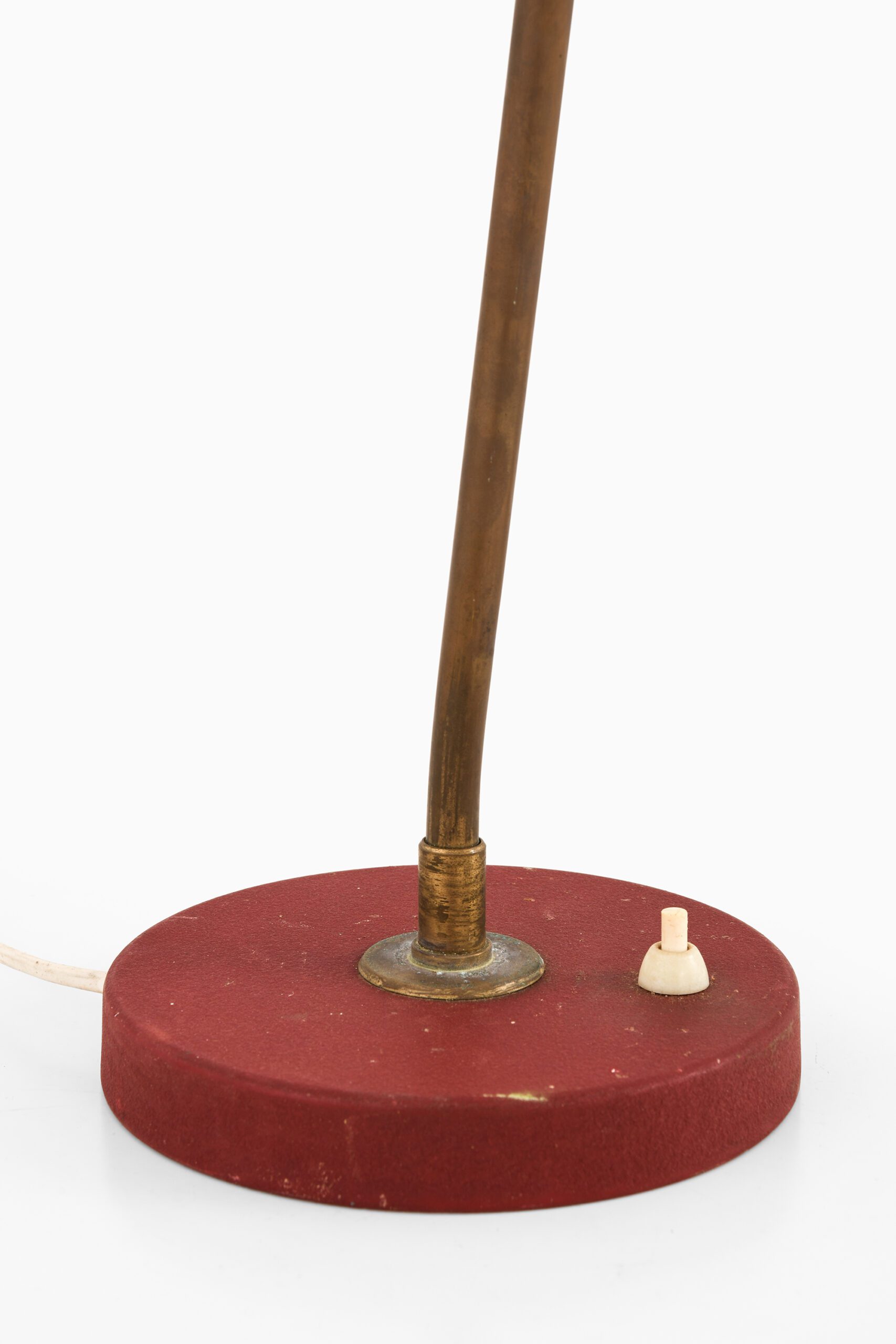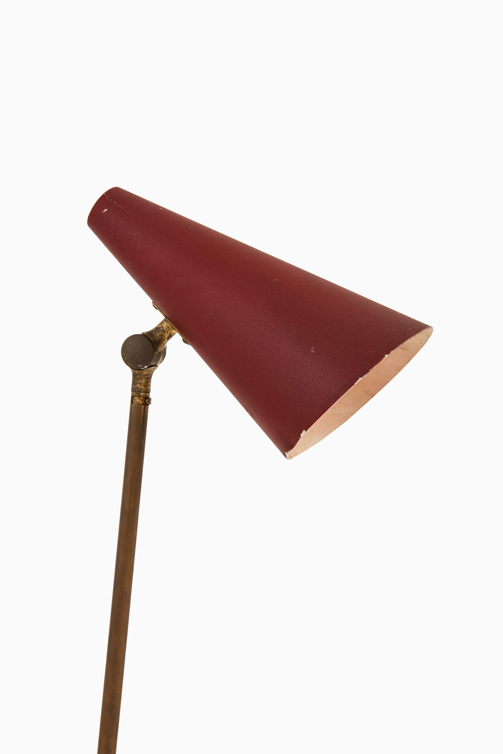 This table lamp, model 33119, was designed by Bertil Brisborg and produced by Nordiska Kompaniet (NK) in Sweden during the 1950s. It features a conical lampshade finished in red lacquered metal, mounted on a slender brass stem rising from a circular base. The lampshade is adjustable, allowing for directional lighting, which makes the lamp suitable for reading or task lighting.