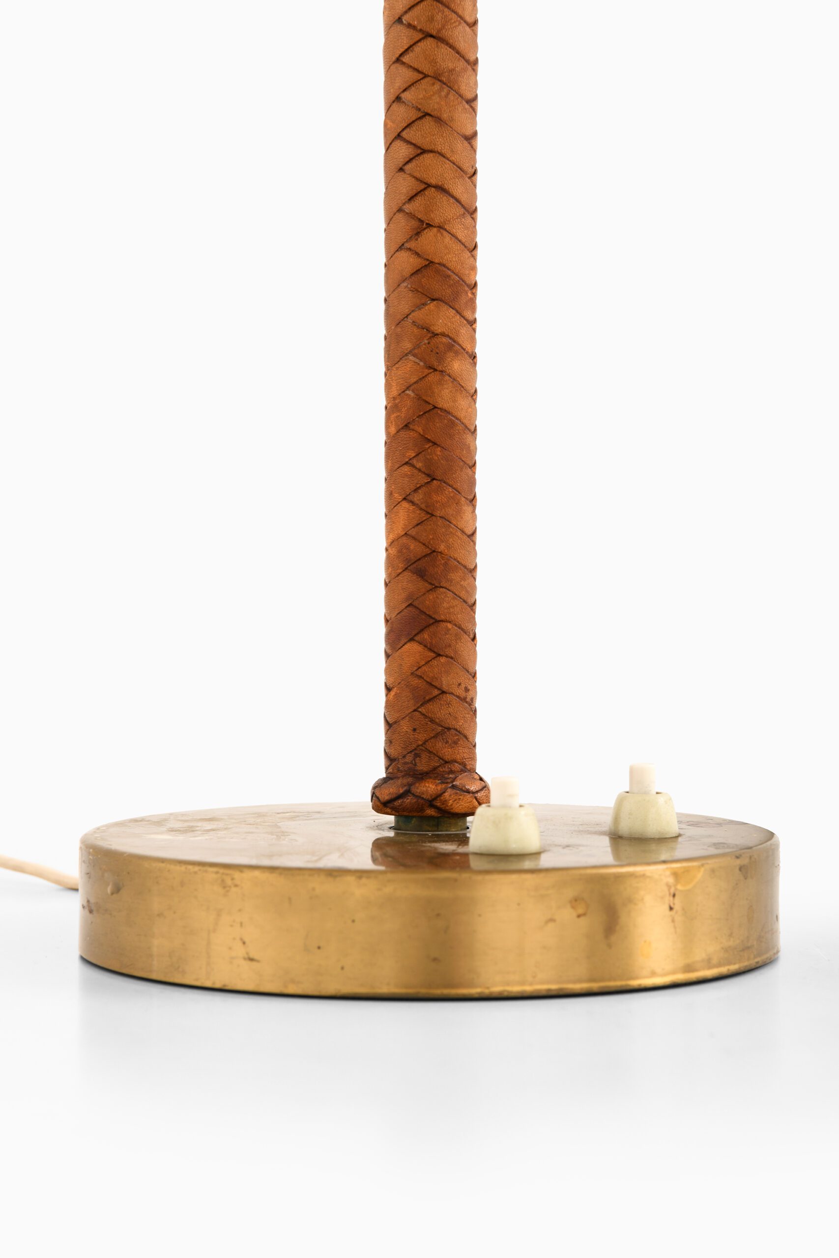 This rare table lamp was designed by Bertil Brisborg and produced by Nordiska Kompaniet in Sweden during the 1950s. The lamp exemplifies mid-century Scandinavian craftsmanship through its thoughtful combination of brass, leather, and fabric materials. The circular brass base supports a slender stem wrapped in braided leather, creating a tactile contrast between the smooth metal and textured natural fiber. The brass elements have developed a warm patina over time, adding depth and character to the piece.