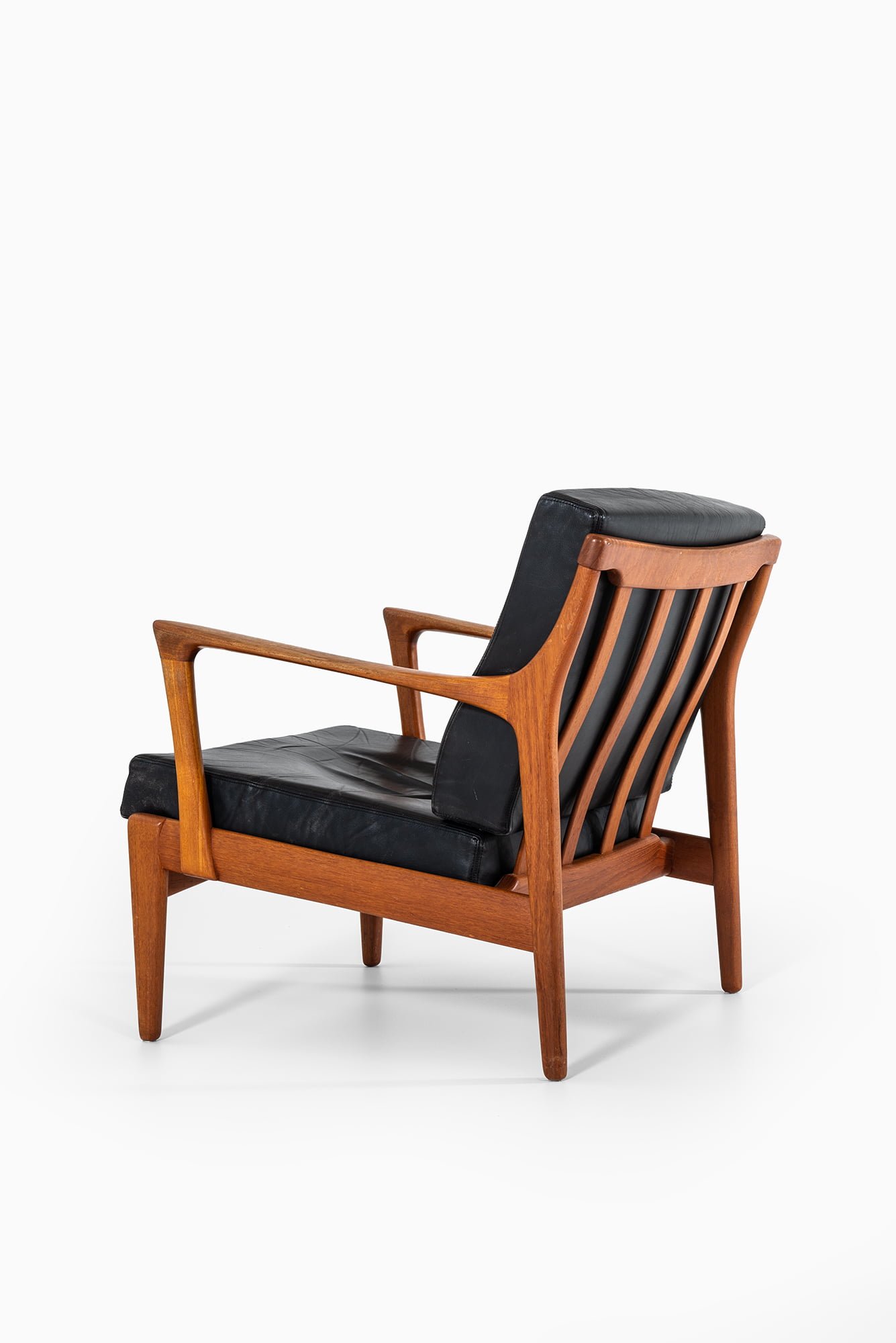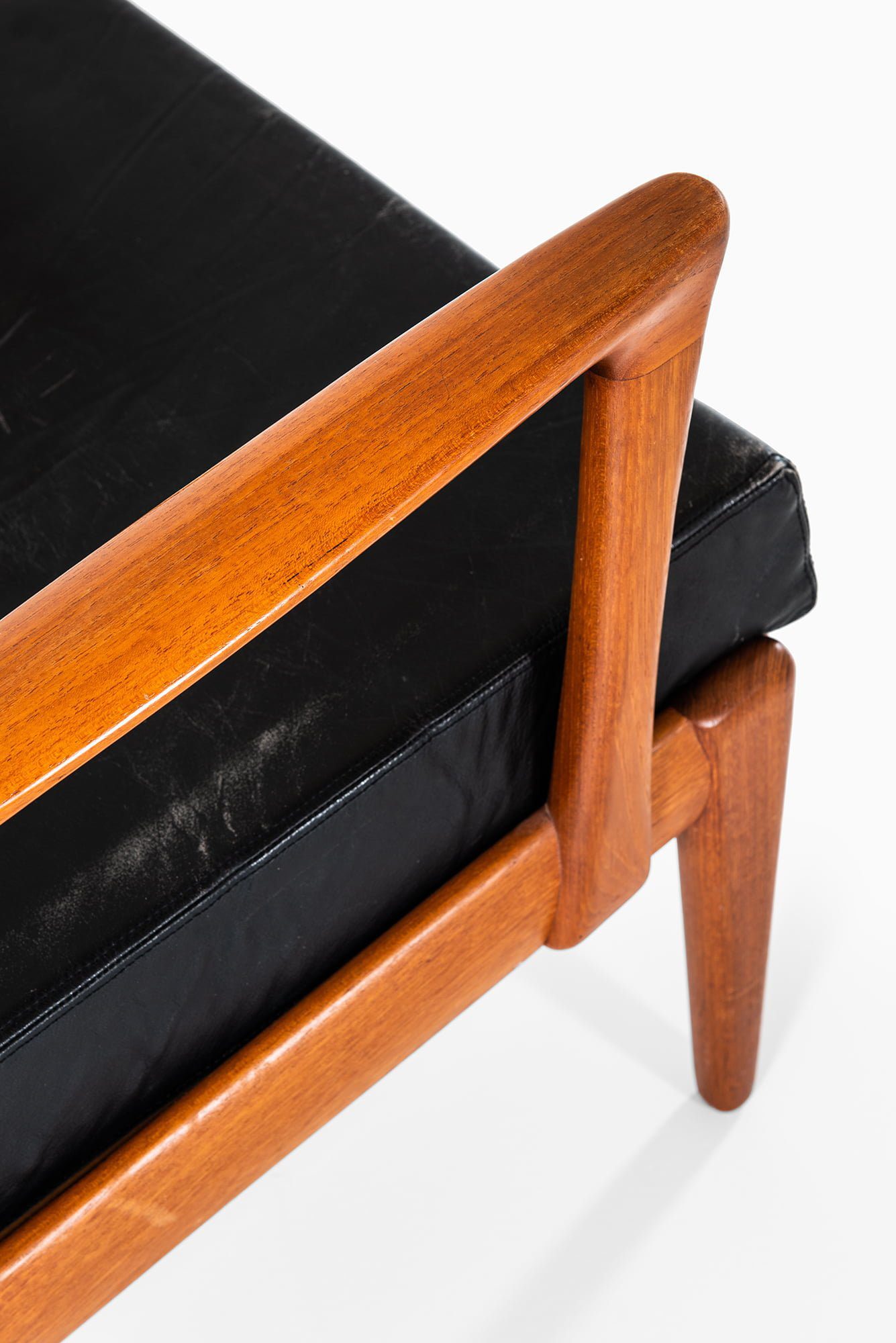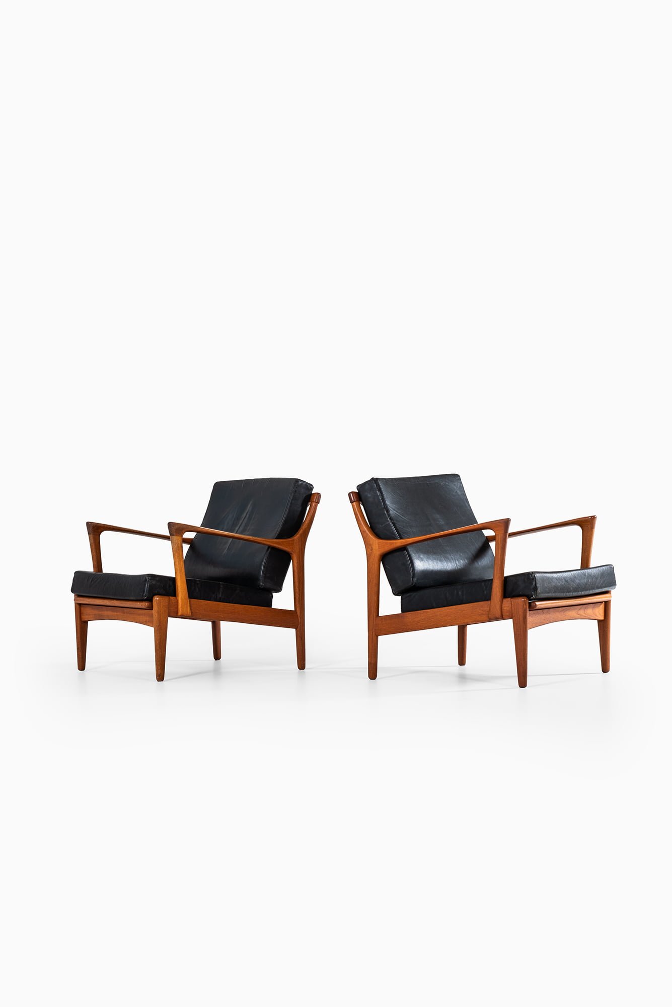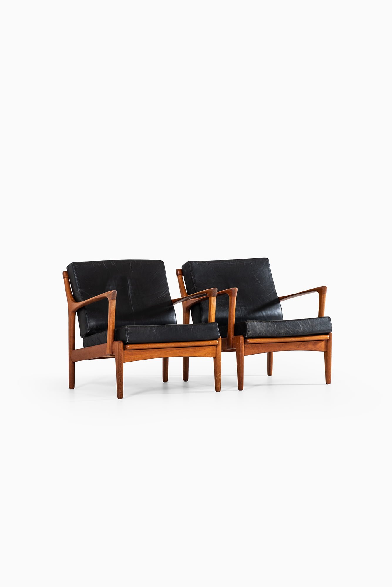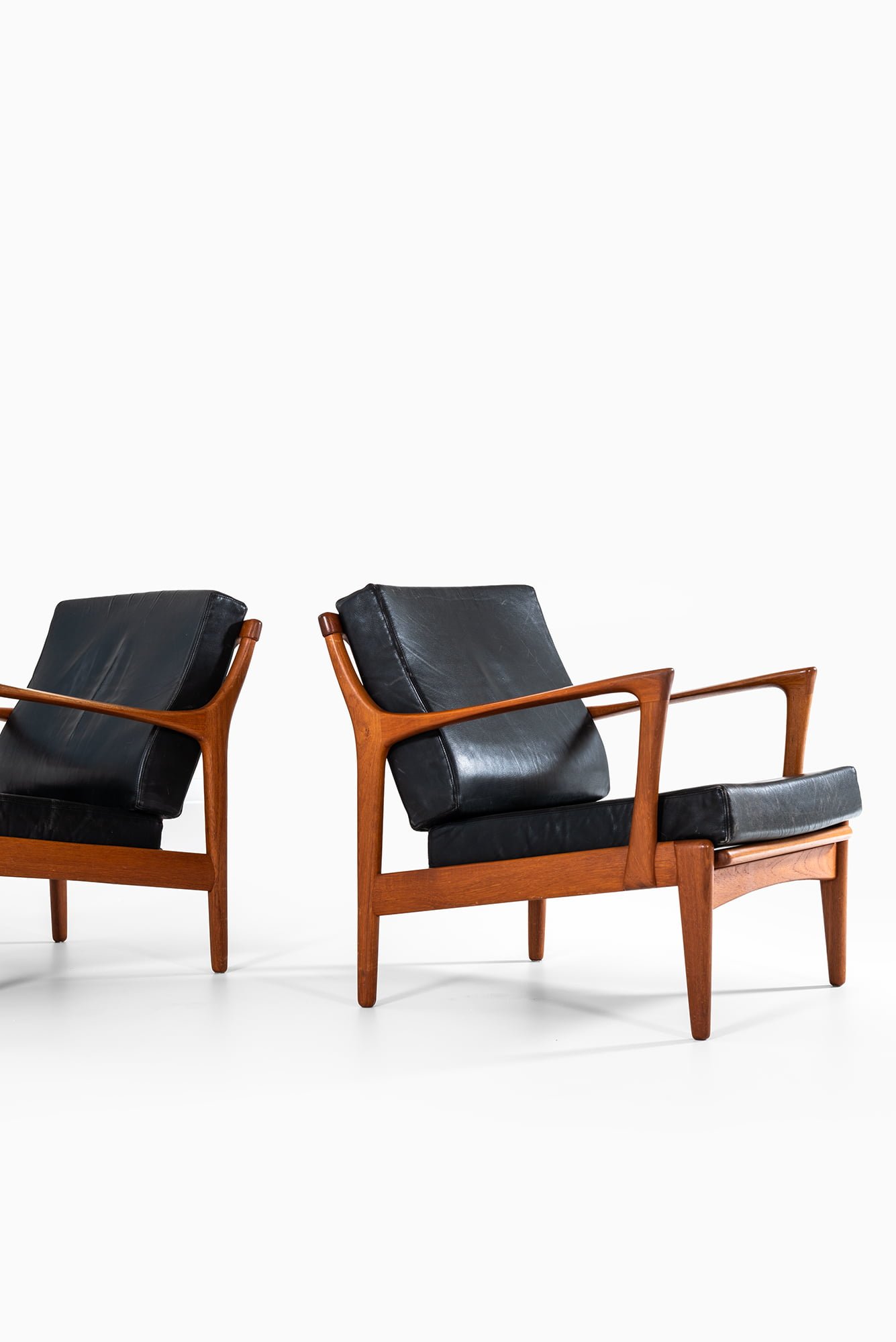 Pair of easy chairs model Kuba designed by Bertil Fridhagen and produced by Bröderna Andersson in Sweden during the 1960s. The frames are crafted in solid teak, characterized by finely sculpted armrests and gently tapered legs that express the refined woodworking typical of Scandinavian mid-century design. The original black leather upholstery remains intact, with visible creases and a natural surface patina that enhance the vintage authenticity of the pair.