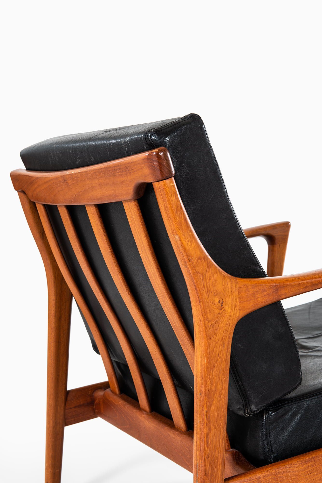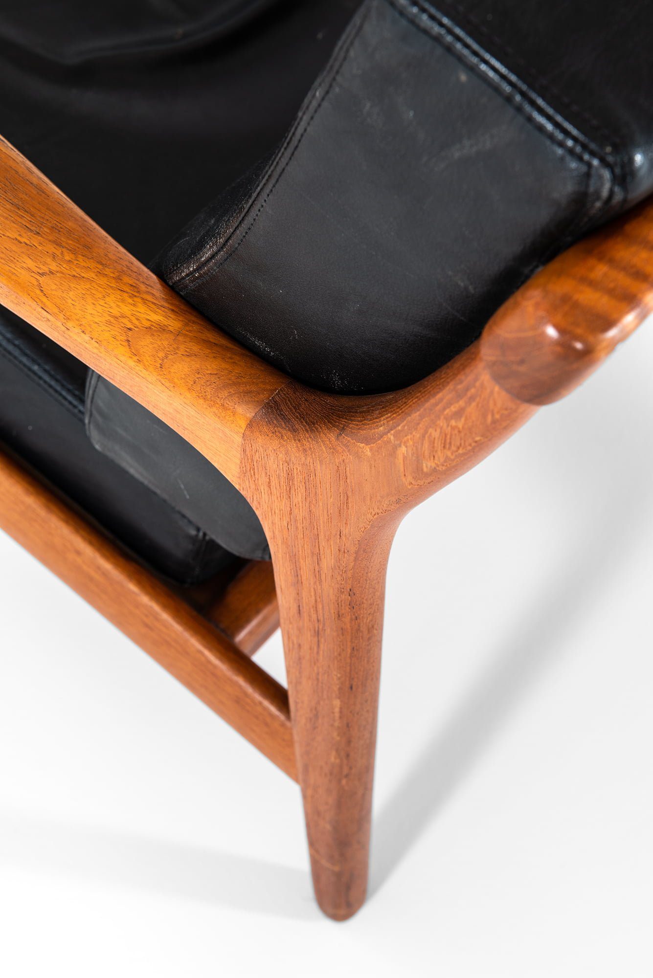 The construction reveals a deep understanding of ergonomic form and proportion, with an open slatted backrest that provides both structure and visual lightness. The teak displays a rich, warm hue and a tight grain pattern, contrasting elegantly with the smooth black leather cushions. The overall composition is both architectural and organic, reflecting Fridhagen’s sensitivity to materials and his mastery of understated detail.