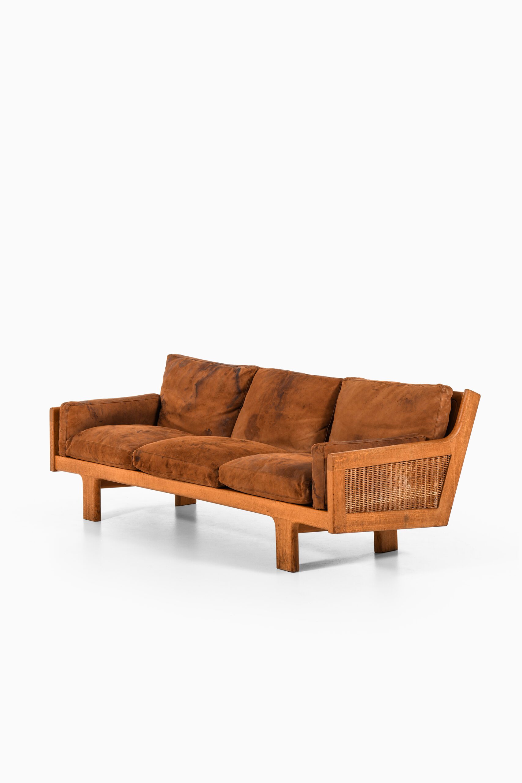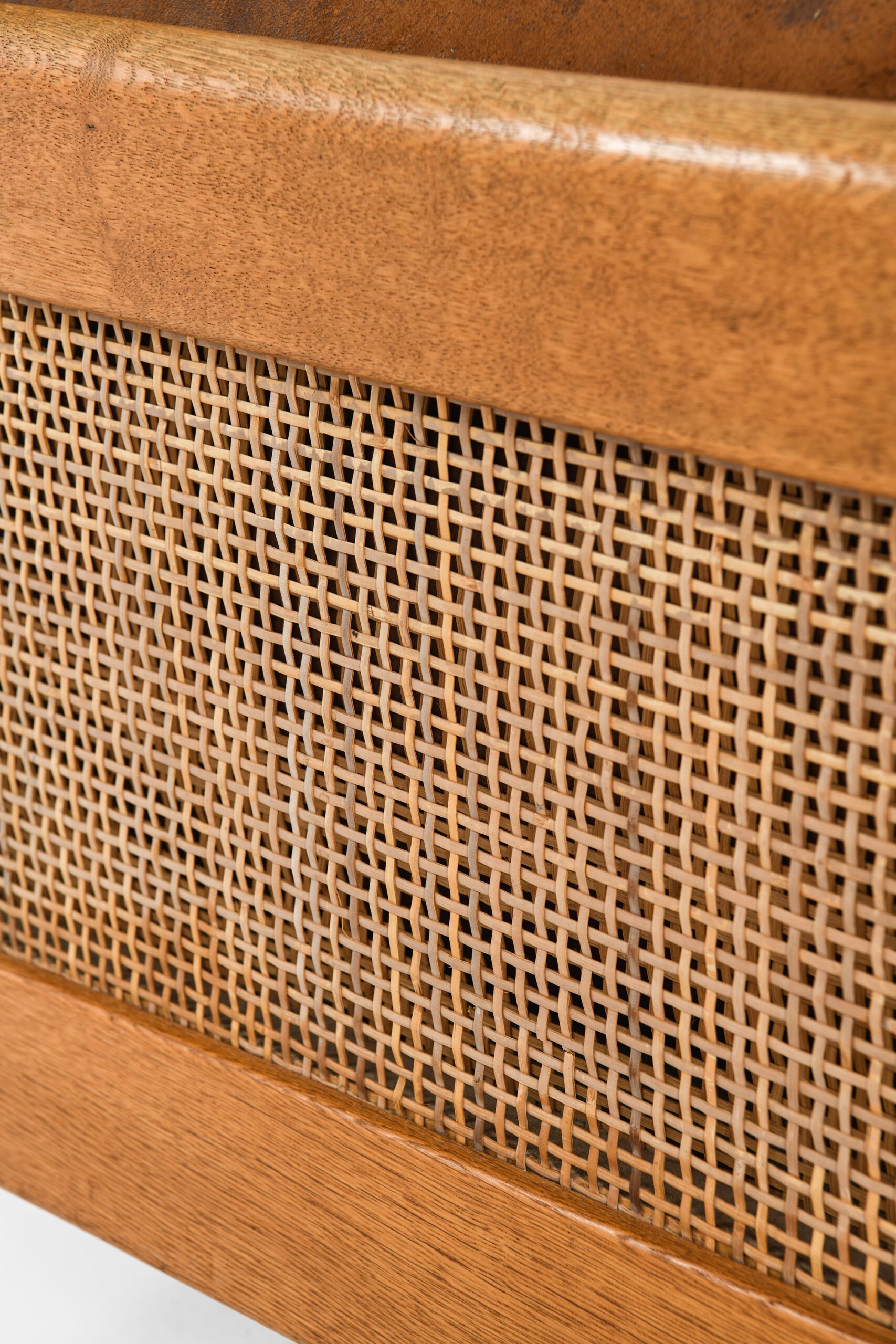This very rare three-seat sofa was designed by Swedish architect and designer Björn Hultén and produced by Haglund & Söner AB in Sweden during the 1950s. The sofa’s frame is crafted from solid oak, finished with a warm, medium-toned stain that accentuates the wood’s natural grain. While the silhouette is predominantly angular, the design is softened by gently curved lines along the backrest and base. The sides and rear incorporate inset cane panels, a detail that reflects the Scandinavian modernist interest in combining texture and transparency. This integration of woven cane within a hardwood frame creates visual lightness and demonstrates a high level of craftsmanship.