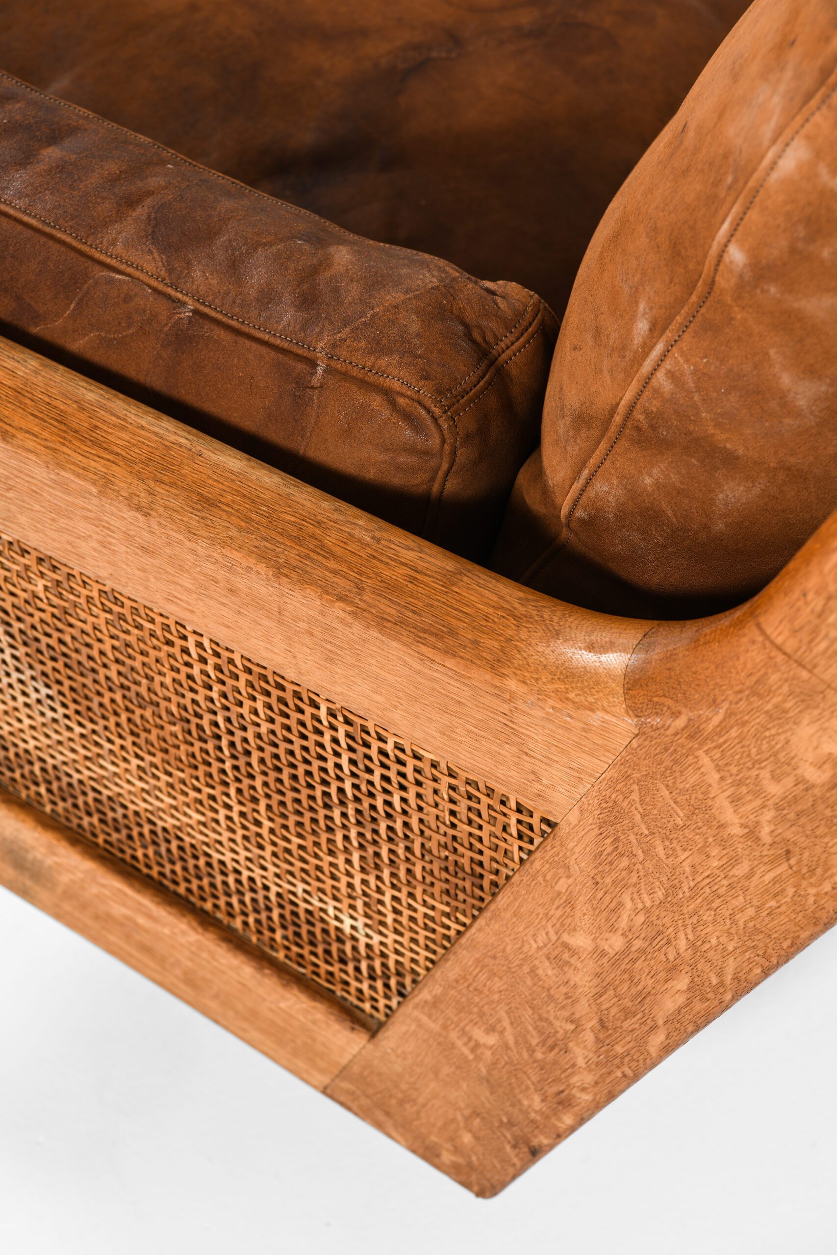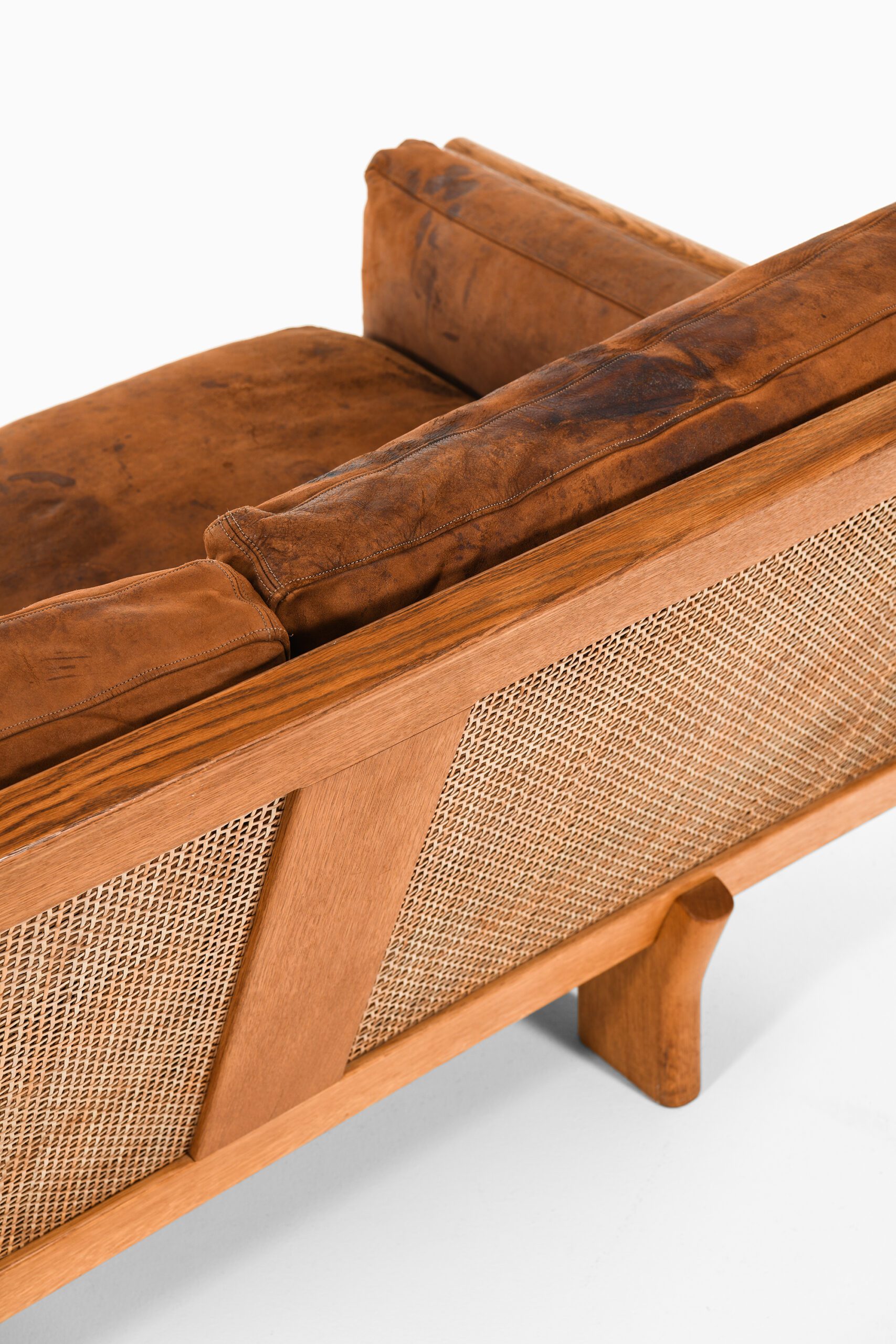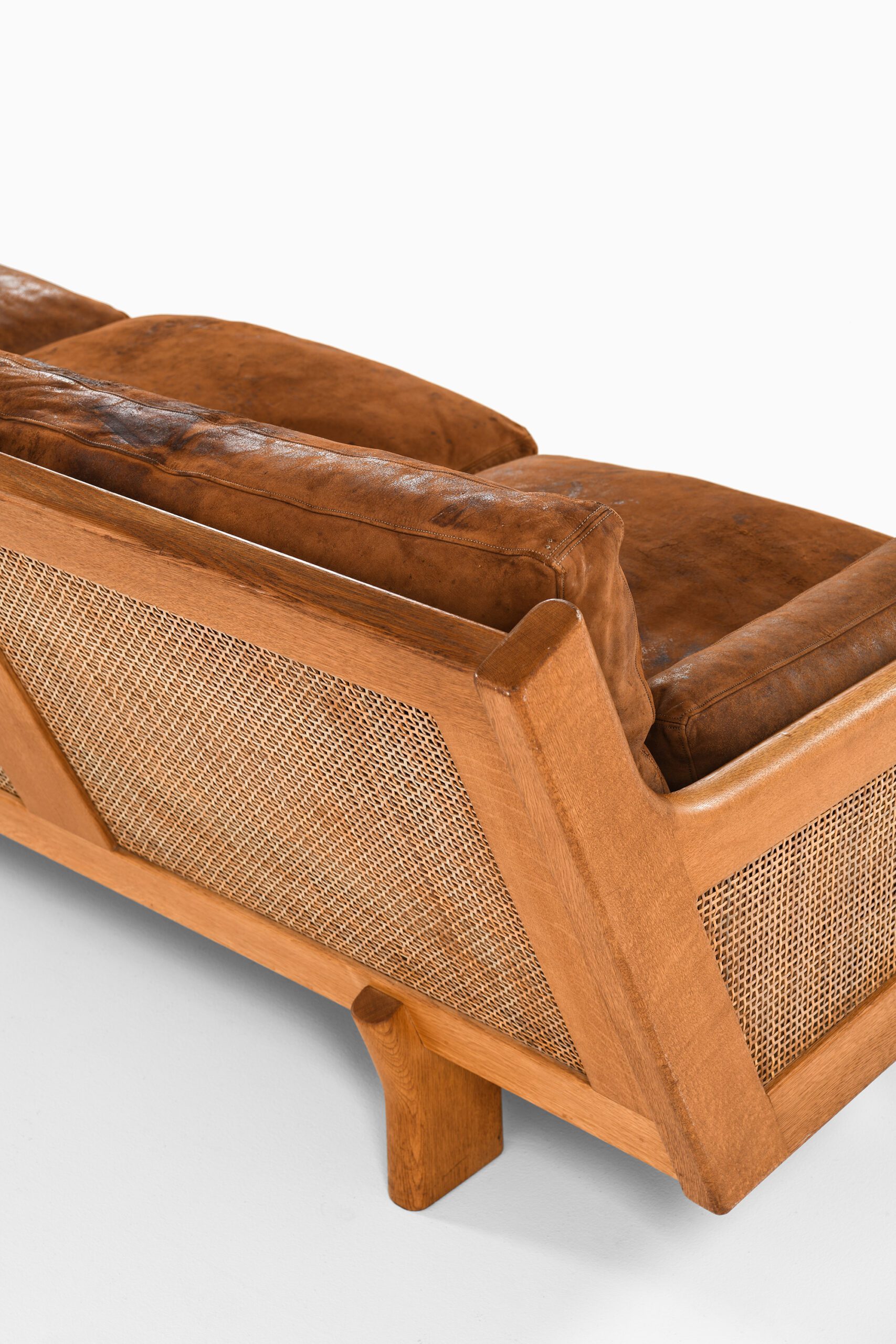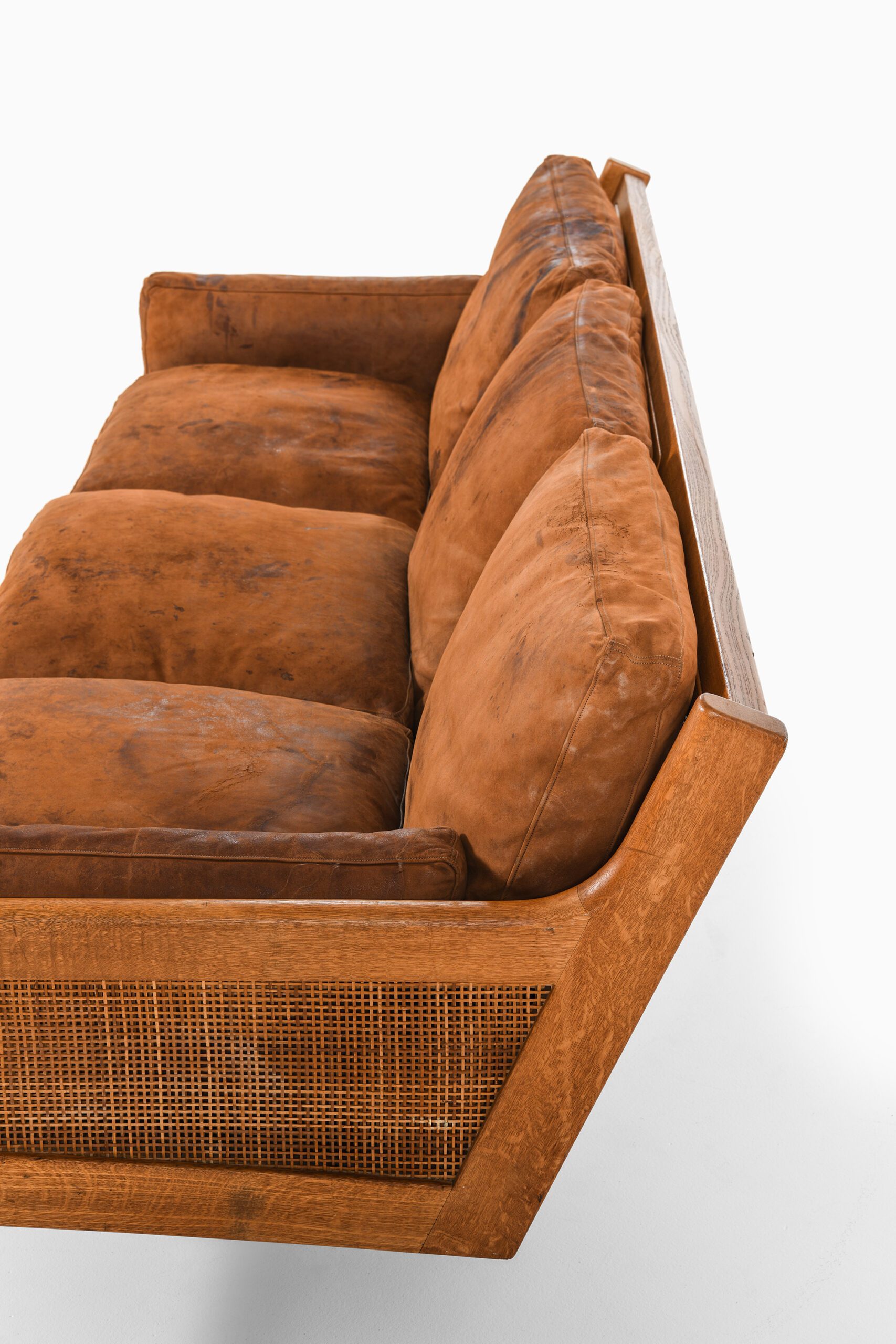 This sofa is in structurally sound original condition, with the oak frame showing minor wear consistent with its age and use. The leather upholstery exhibits pronounced patina and natural aging but remains intact. The cane panels are complete and tightly woven, retaining their original integrity. The dimensions are 210 cm wide, 88 cm deep, and 73 cm high, with a seat height of 41 cm, approximately 82.7 inches wide, 34.6 inches deep, 28.7 inches high, and a seat height of 16.1 inches.