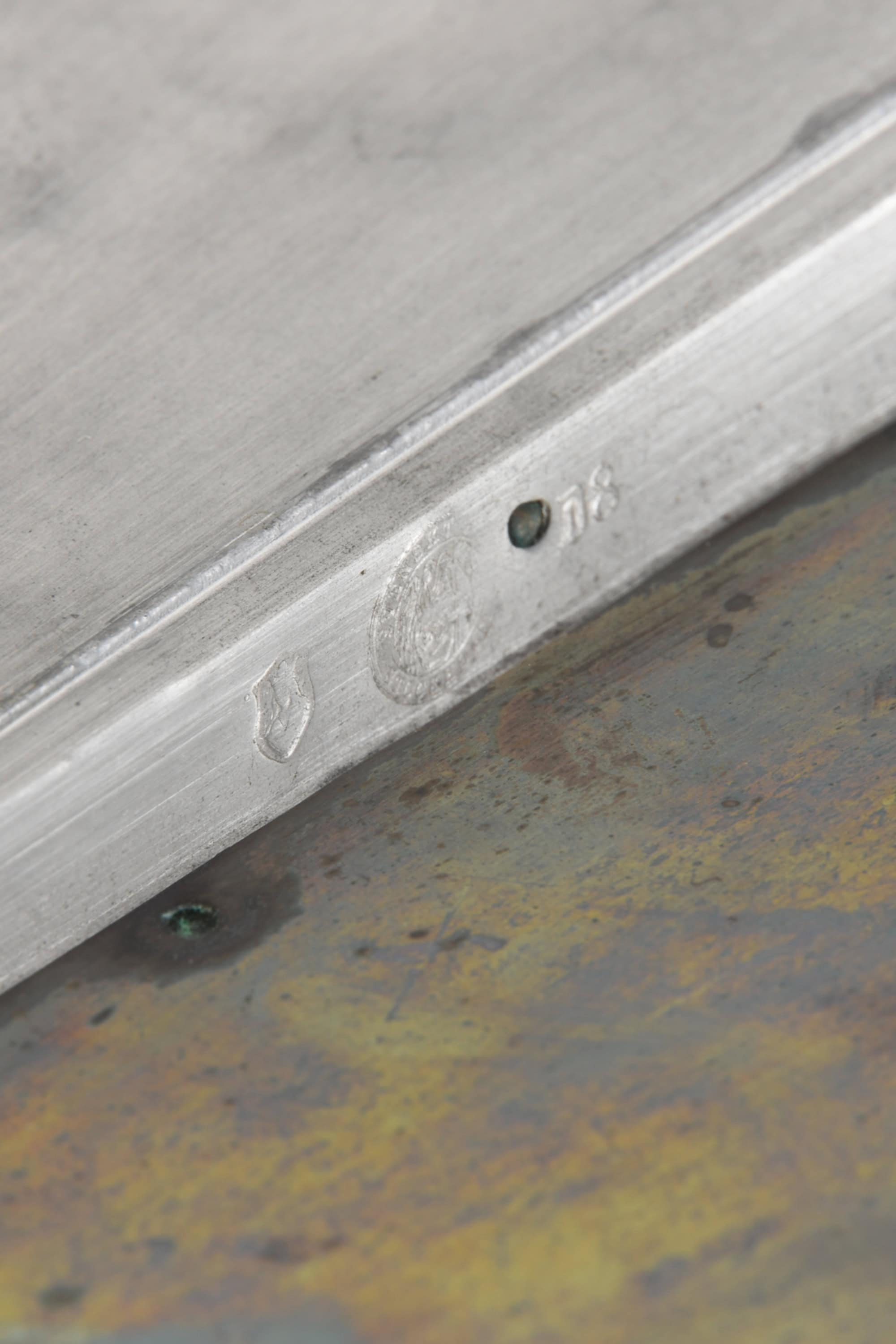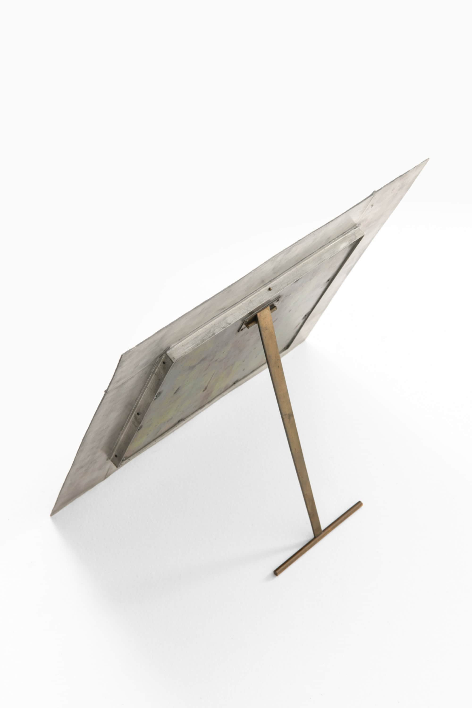 This rare table mirror, designed by Björn Trägårdh and produced by Svenskt Tenn in Sweden in 1930, is executed in pewter with a characteristic textured surface. The rectangular frame is composed of four broad pewter sections, each treated to create a uniform, finely patterned finish with subtle tonal variation. The material displays the soft sheen typical of aged pewter, with visible hand-worked details and natural patina developed over time. The mirror is supported by a simple and functional brass rear stand, attached to a secondary plate that secures the glass within the frame.