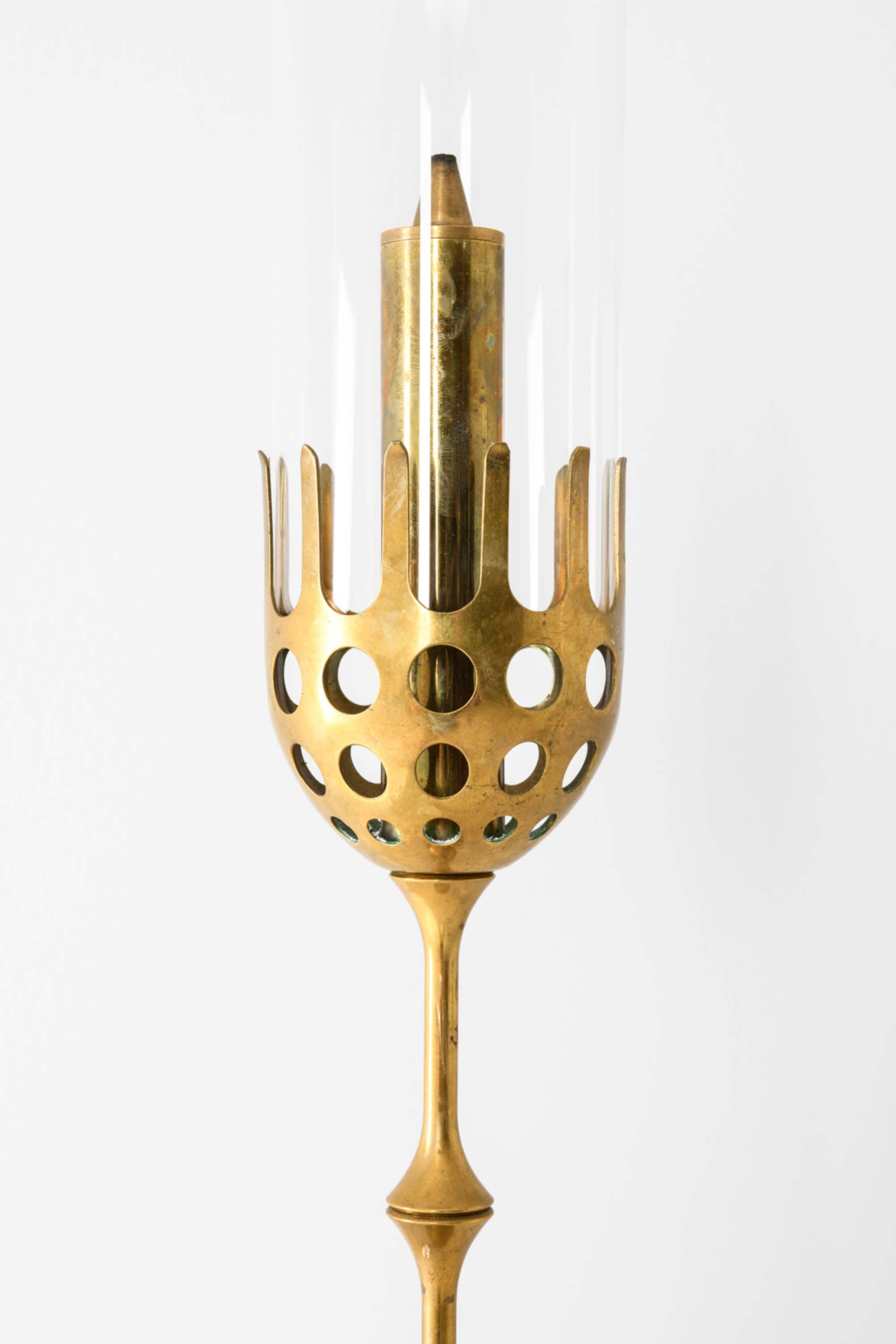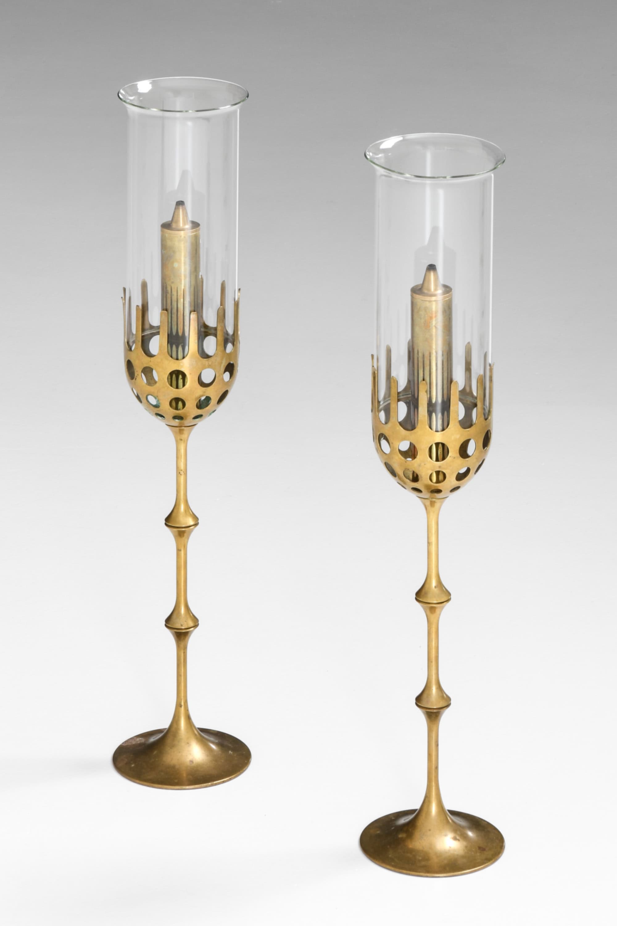 The condition is excellent with minimal signs of wear, consistent with careful use and preservation. The glass chimneys are clear and well-proportioned, complementing the sculptural brass form. The overall impression is one of lightness and refinement, with the tall proportions making these pieces well-suited as a pair for a dining table, mantel, or sideboard.