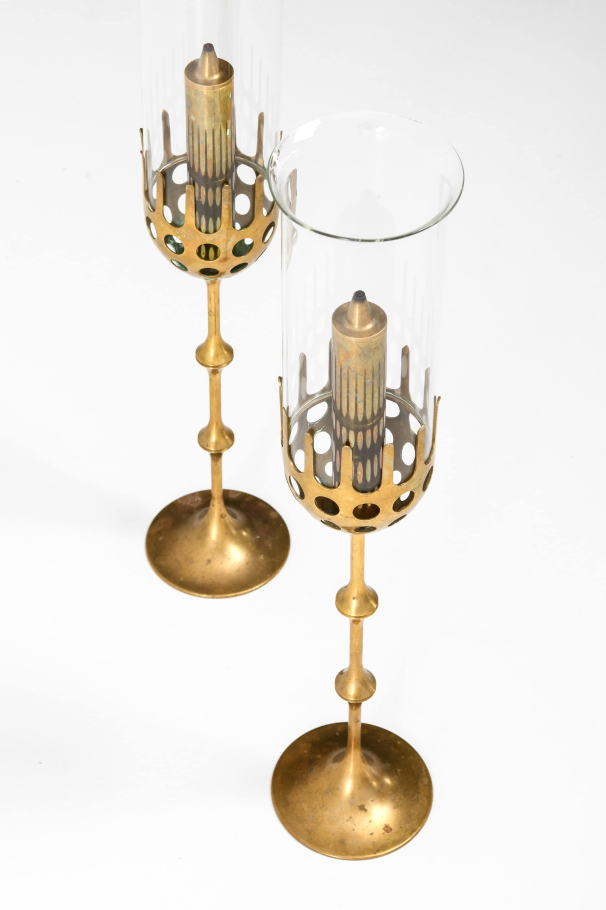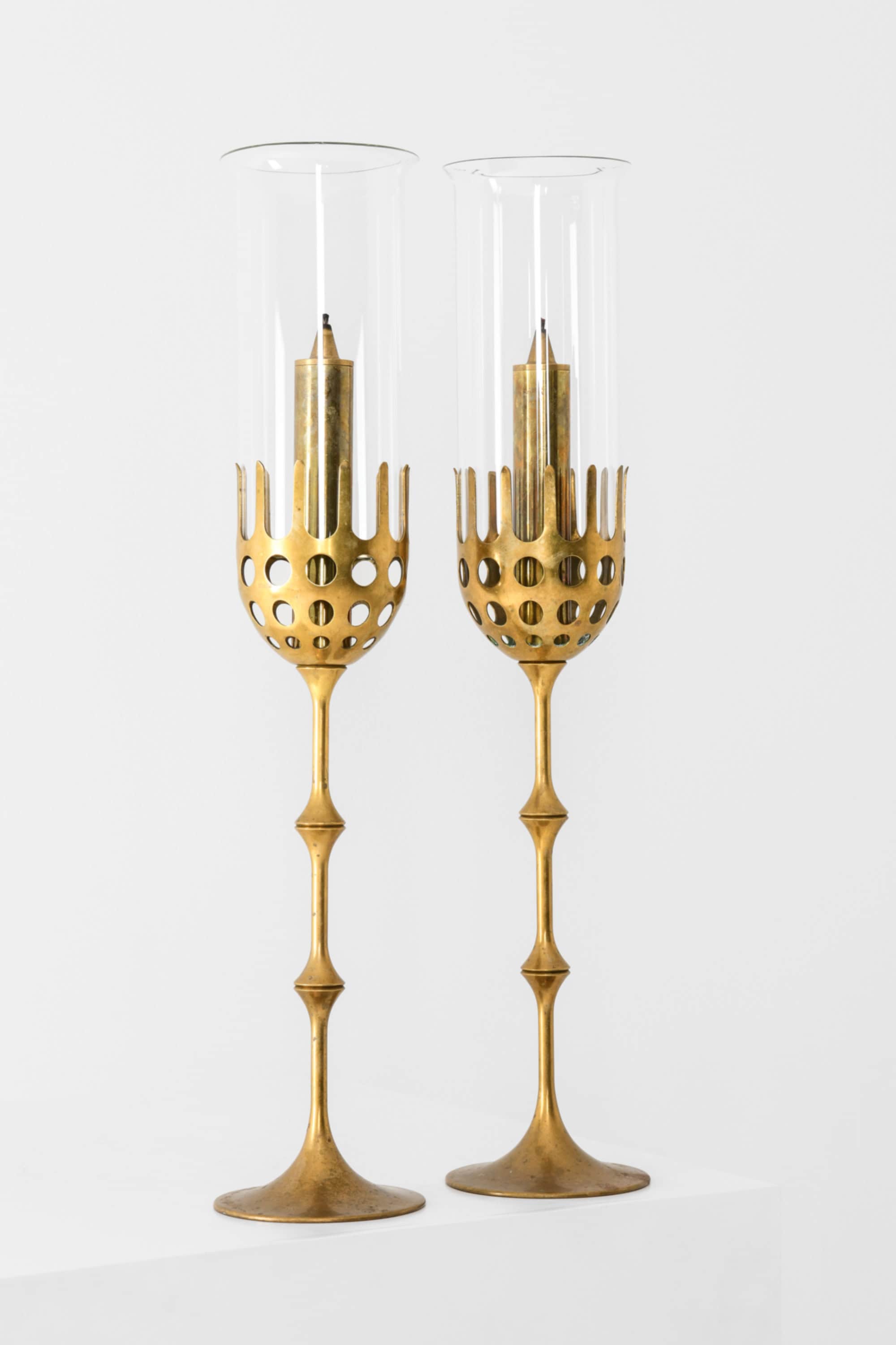 This pair of Hurricane candlesticks was designed by Bjørn Wiinblad and produced in Denmark during the 1970s. Each candlestick features a tall, slender stem in cast brass, rising from a flared circular base that provides stability. The upper section supports a brass crown-like holder with circular perforations. A clear glass chimney sits neatly into the holder, protecting the flame while emphasizing the tall and elegant silhouette of the piece. The brass surface shows a warm golden tone with a soft, even patina that enhances its vintage character.