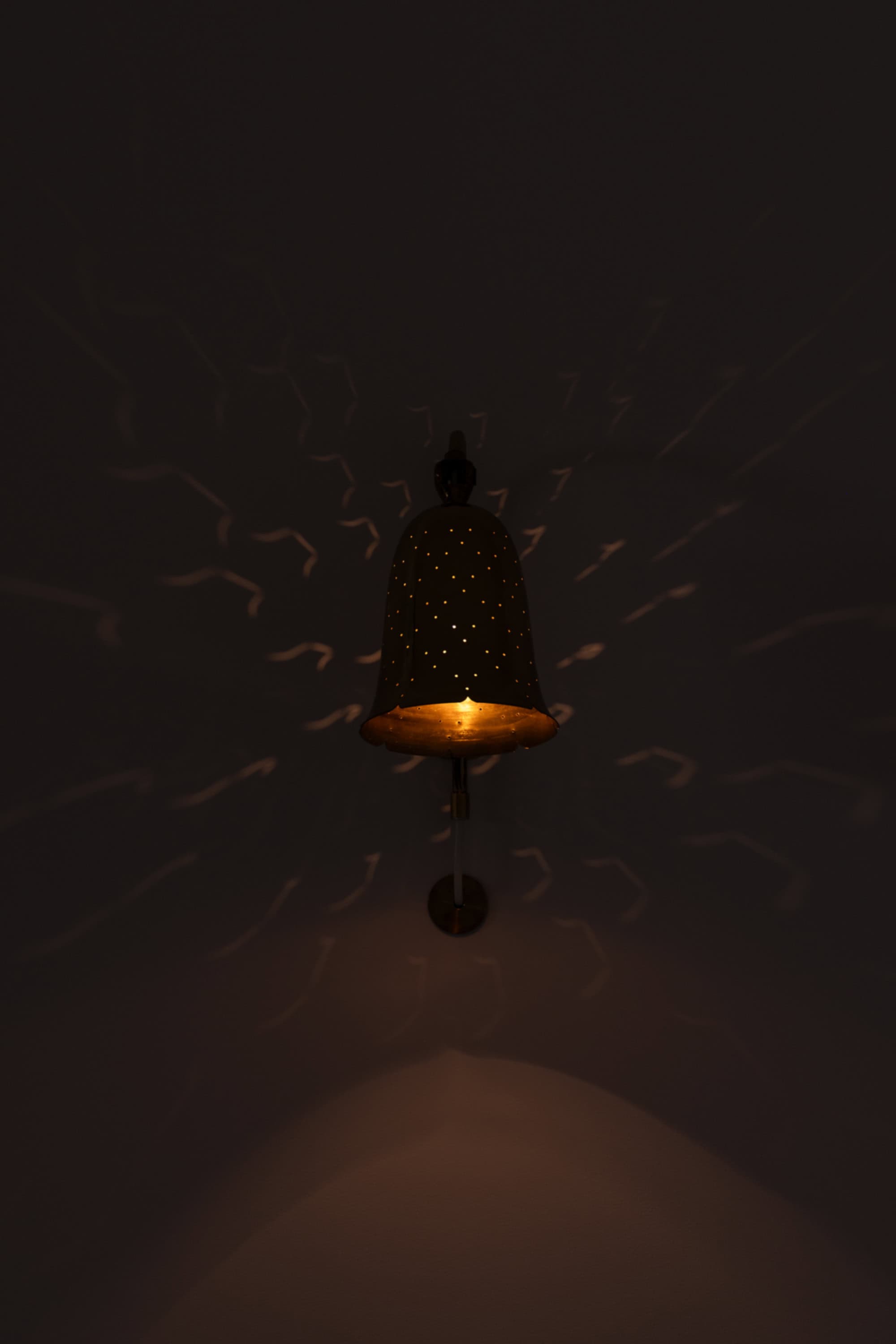 The lamp features a compact, bell-shaped shade with a softly flared lower edge, giving it an elegant and slightly organic silhouette. The surface is perforated with a fine pattern of small, evenly distributed holes, allowing light to escape through the metal and creating a delicate, atmospheric effect when illuminated. The brass retains a warm golden tone with a gentle, natural sheen, showing only minimal signs of age.