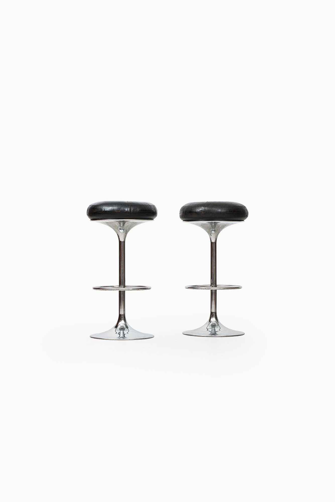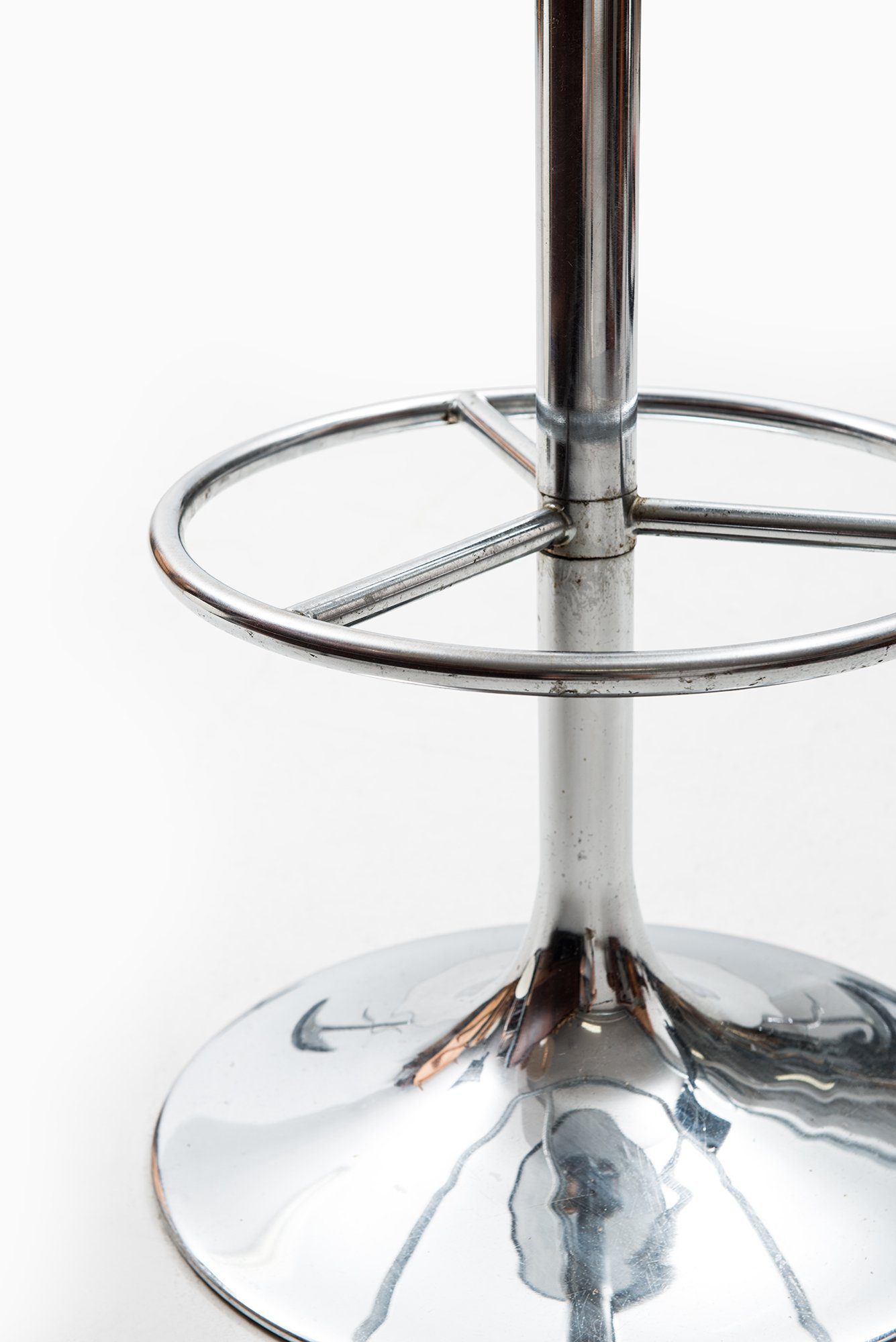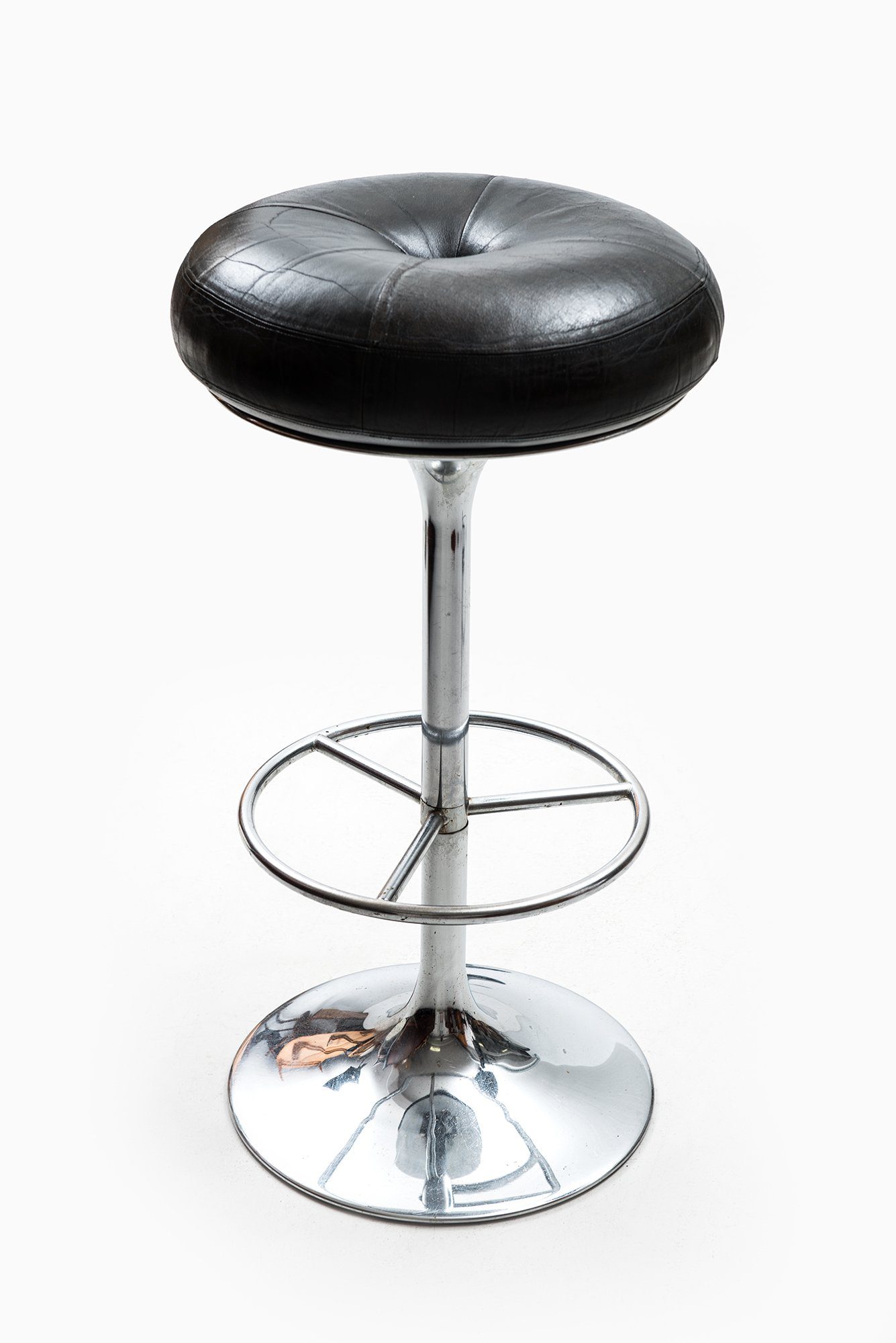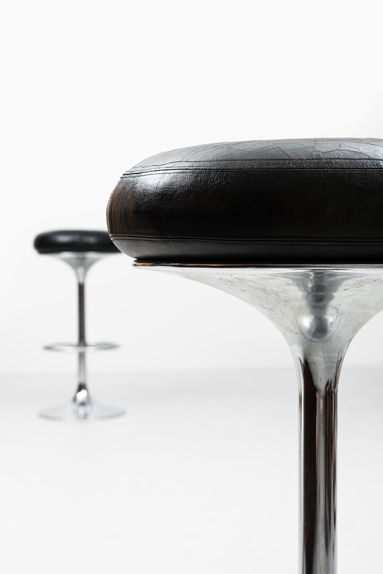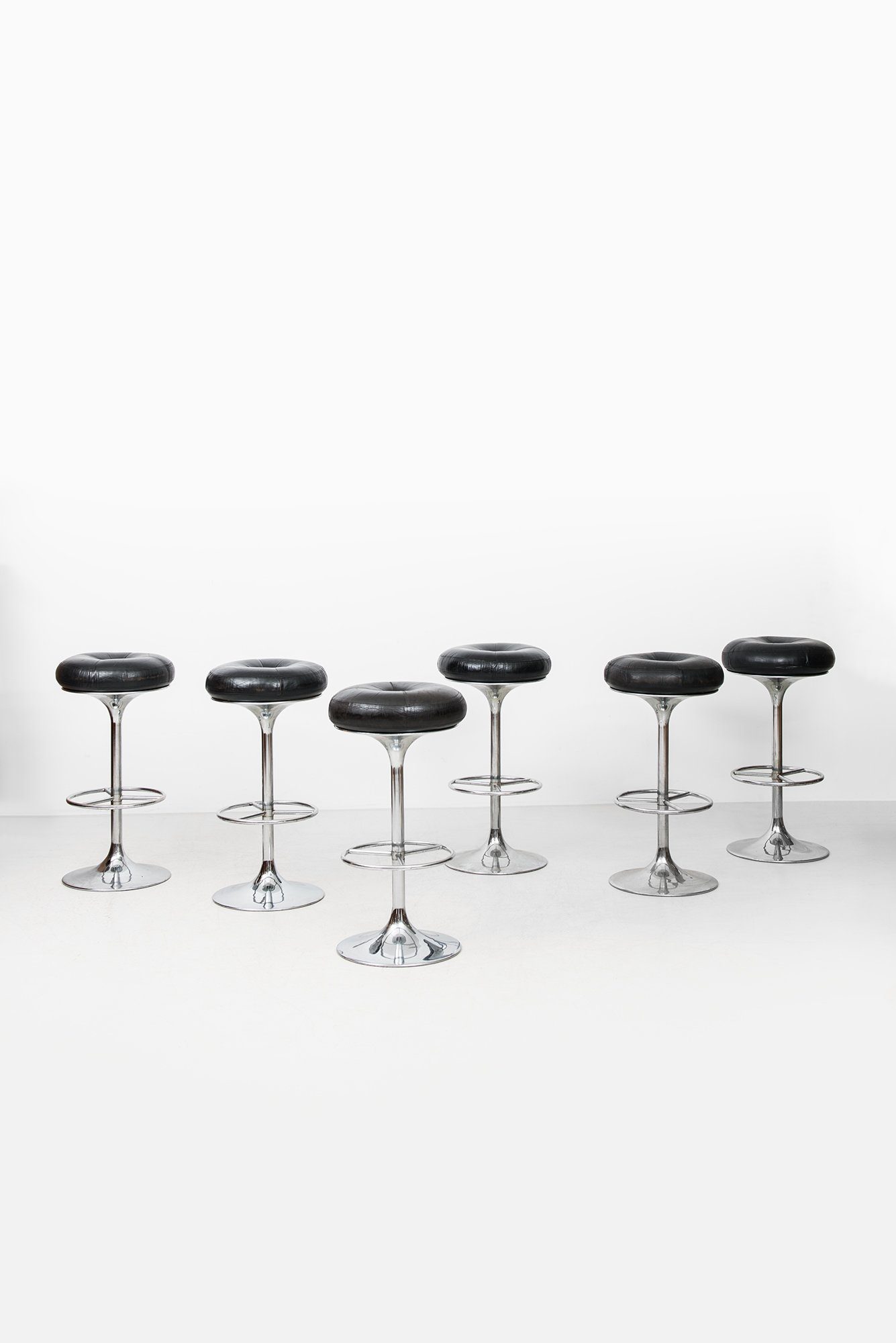 This is a large set of six bar stools, model Classic, designed by Börje Johanson and produced by Johanson Design in Markaryd, Sweden, during the 1960s. The stools feature a tulip-inspired chromed steel base with a circular footrest and a round seat upholstered in black leather. The combination of chrome and leather gives them a distinctly mid-century modern character, balancing sleek industrial materials with comfort.