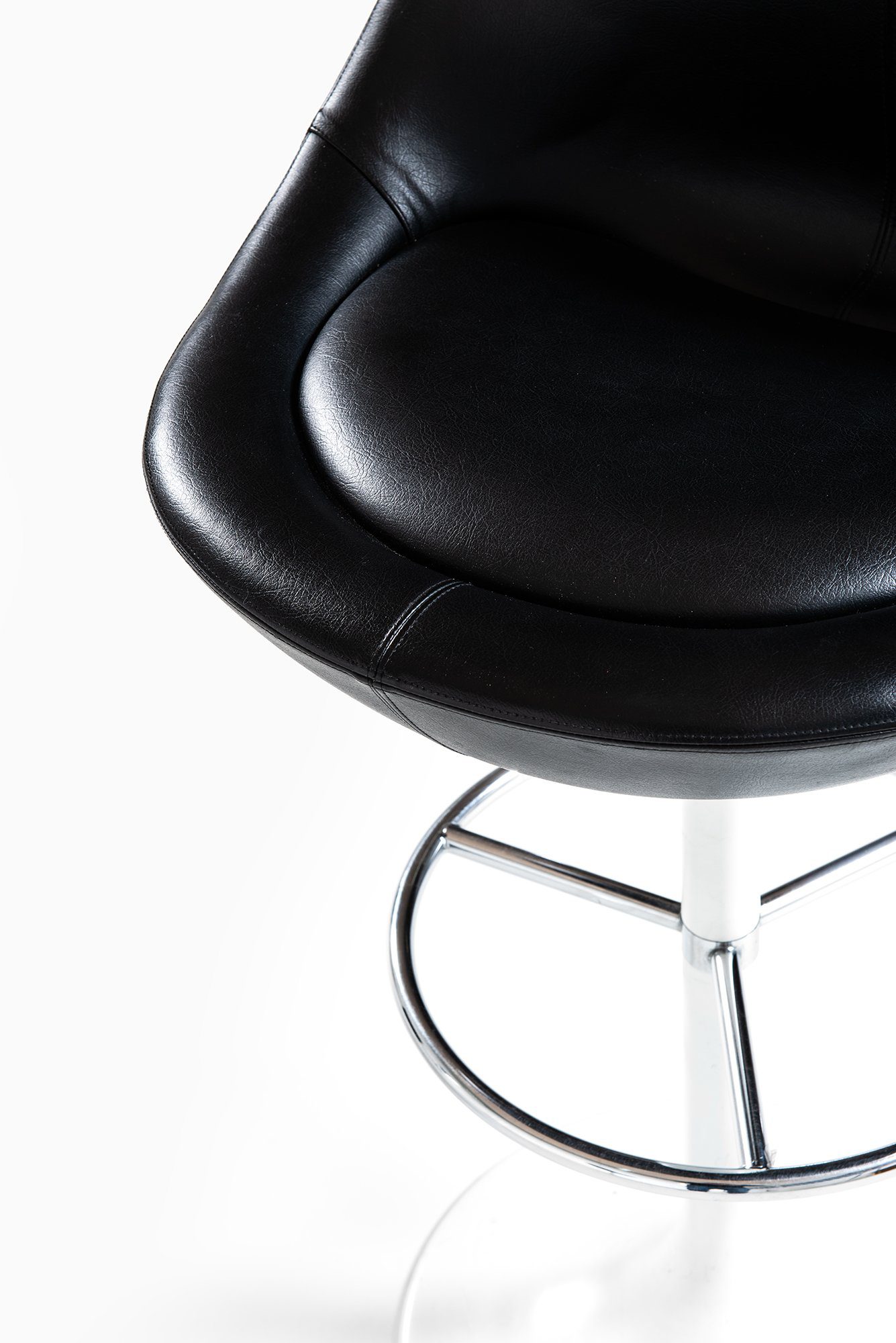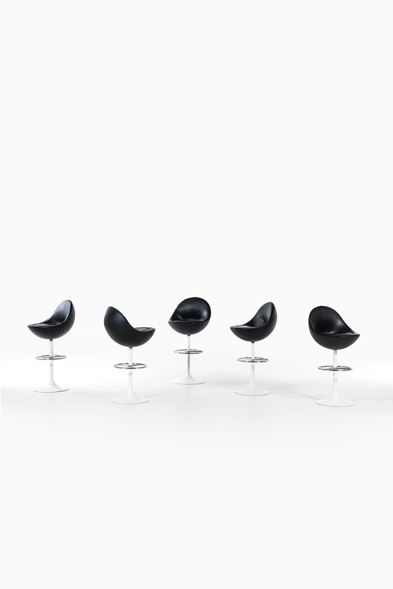 Bar stools model Venus designed by Börje Johanson and produced by AB Bröderna Johanson Fåtöljindustri in Markaryd, Sweden, during the 1960s. The stools feature a sculptural seat form upholstered in black imitation leather, supported by a white lacquered metal tulip base with a circular chromed steel footrest. The combination of materials gives the piece a striking visual balance between industrial precision and organic curvature.