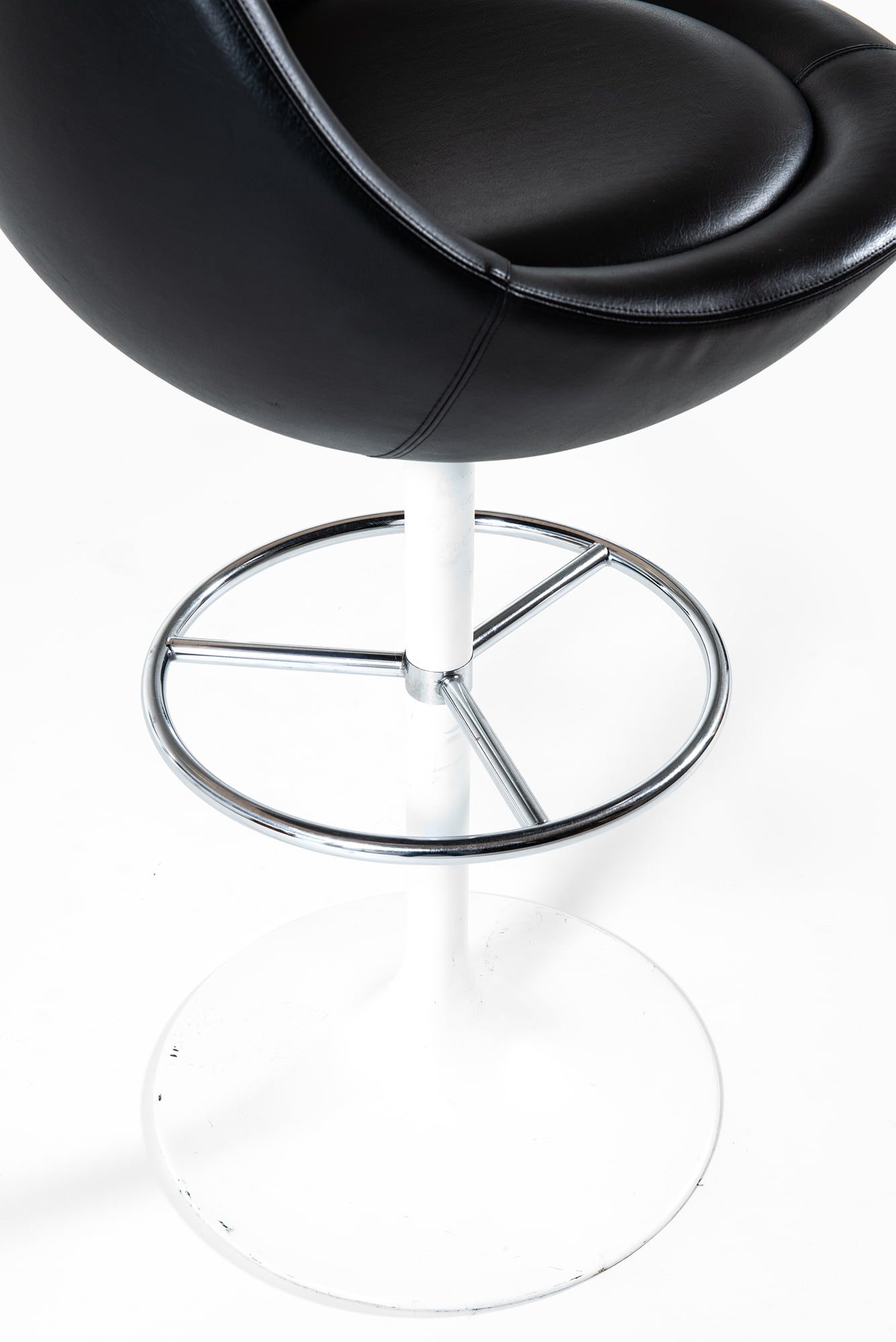 The seat has a deep, enveloping shell shape that provides both comfort and a distinct modernist silhouette. The smooth black upholstery contrasts elegantly with the white base, emphasizing the stool’s minimal yet dynamic composition. The footrest ring adds functional support and complements the overall geometry with its polished chrome finish.