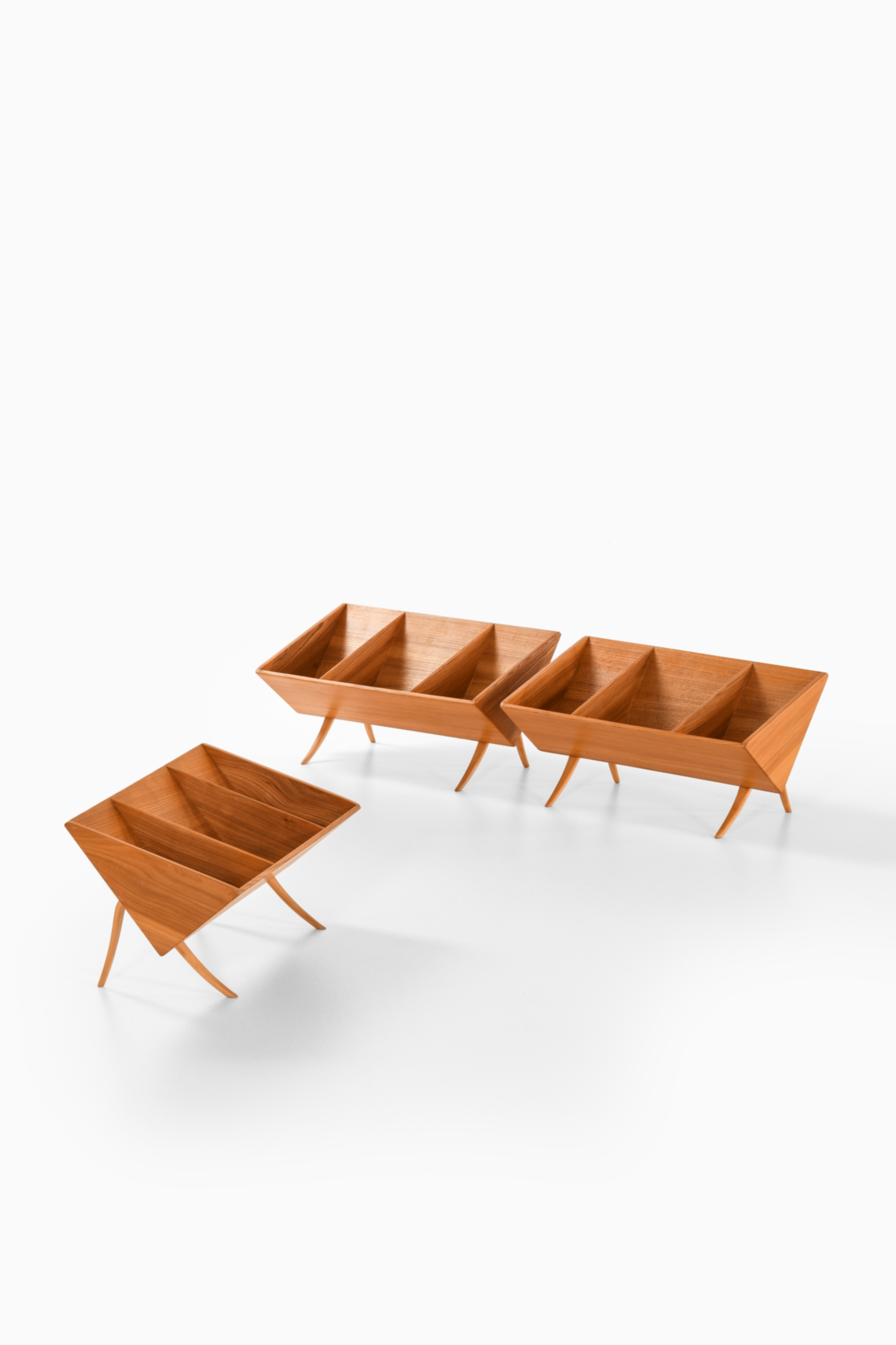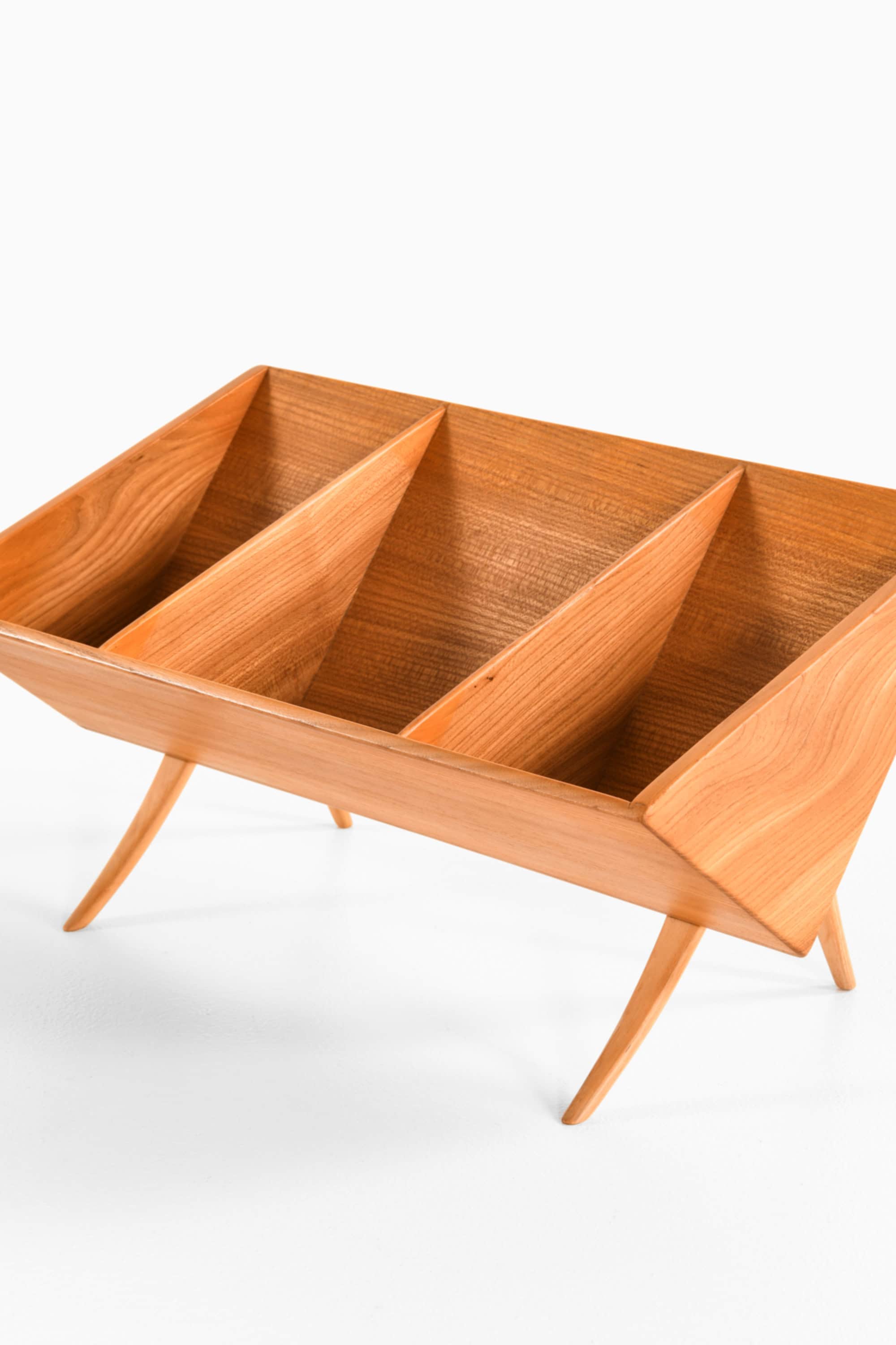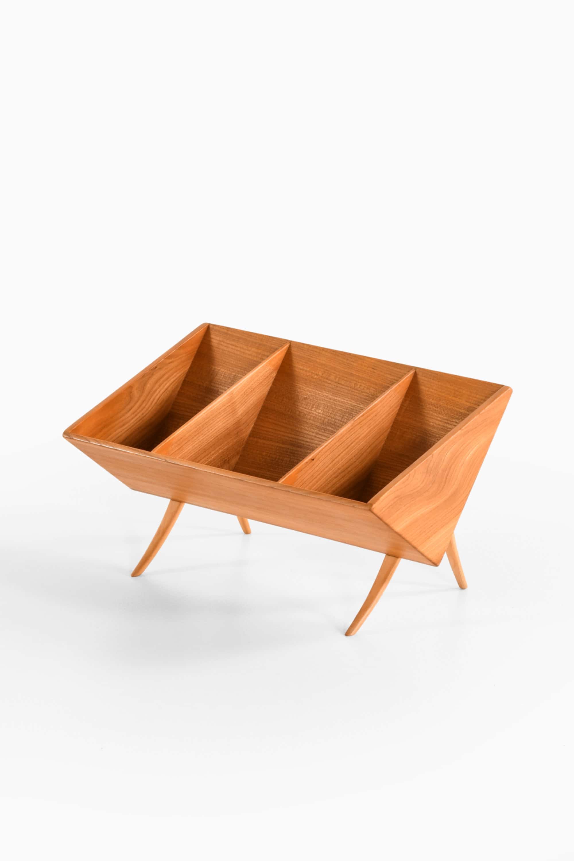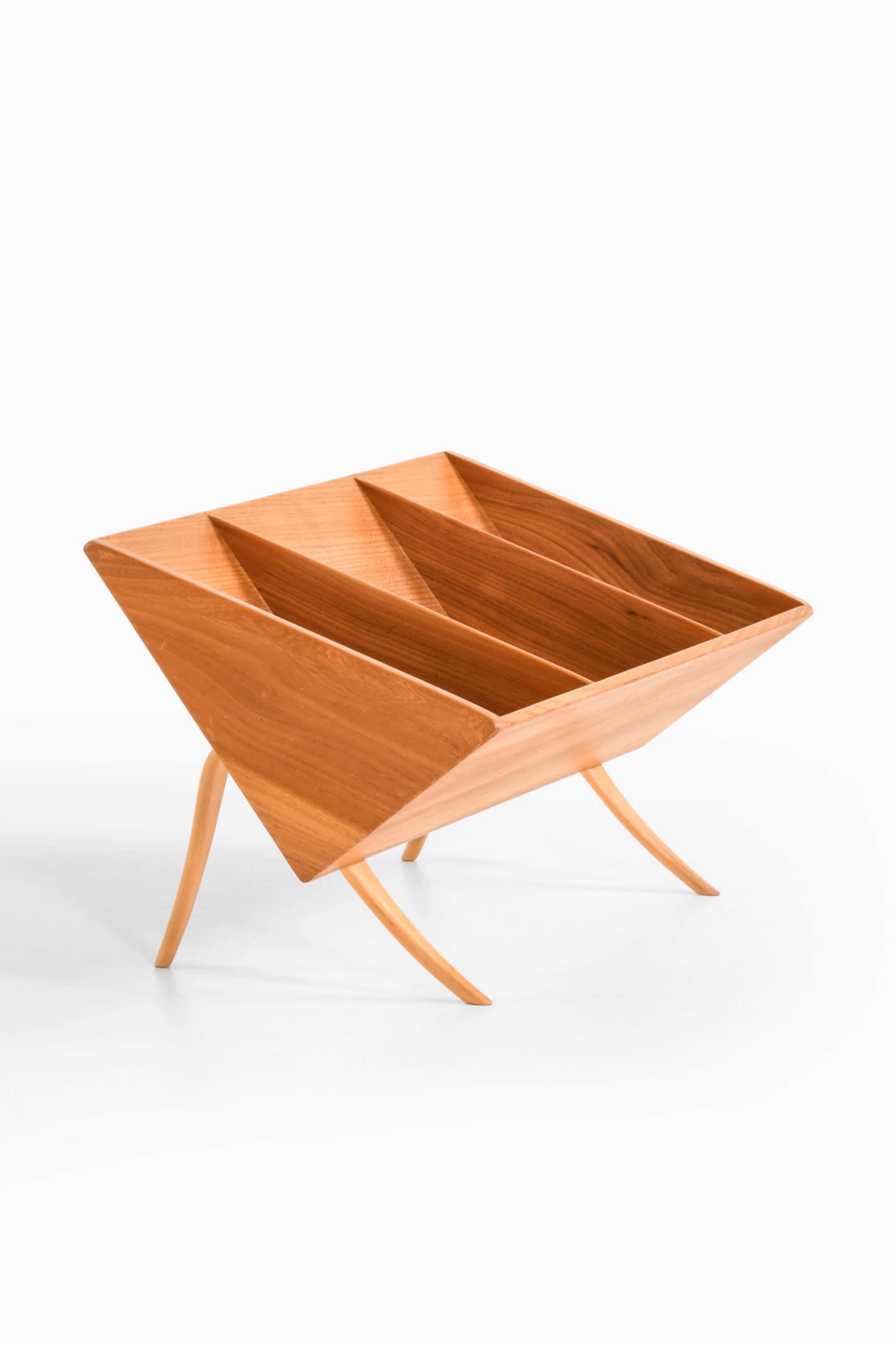 This sculptural bookshelf or magazine stand was designed by Bruno Mathsson and produced by Firma Karl Mathsson in Värnamo, Sweden. Crafted in ash, the piece reflects Mathsson’s deep understanding of organic form and material expression. The bookshelf is characterized by its sharply angled, faceted body divided into four triangular compartments, supported by four elegantly curved legs that taper gently toward the floor. Its form combines precision and lightness, with a strong sense of balance between function and visual rhythm.