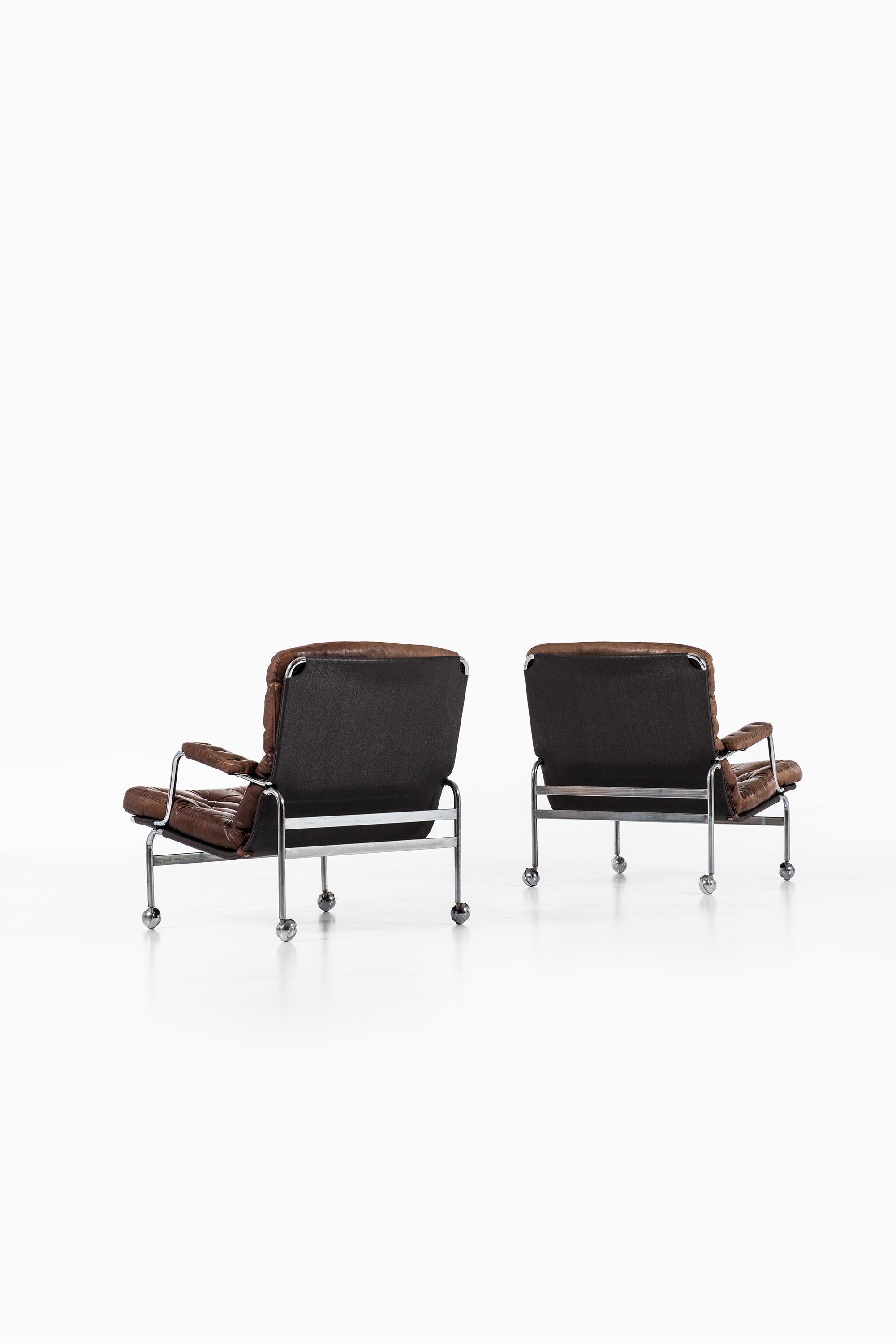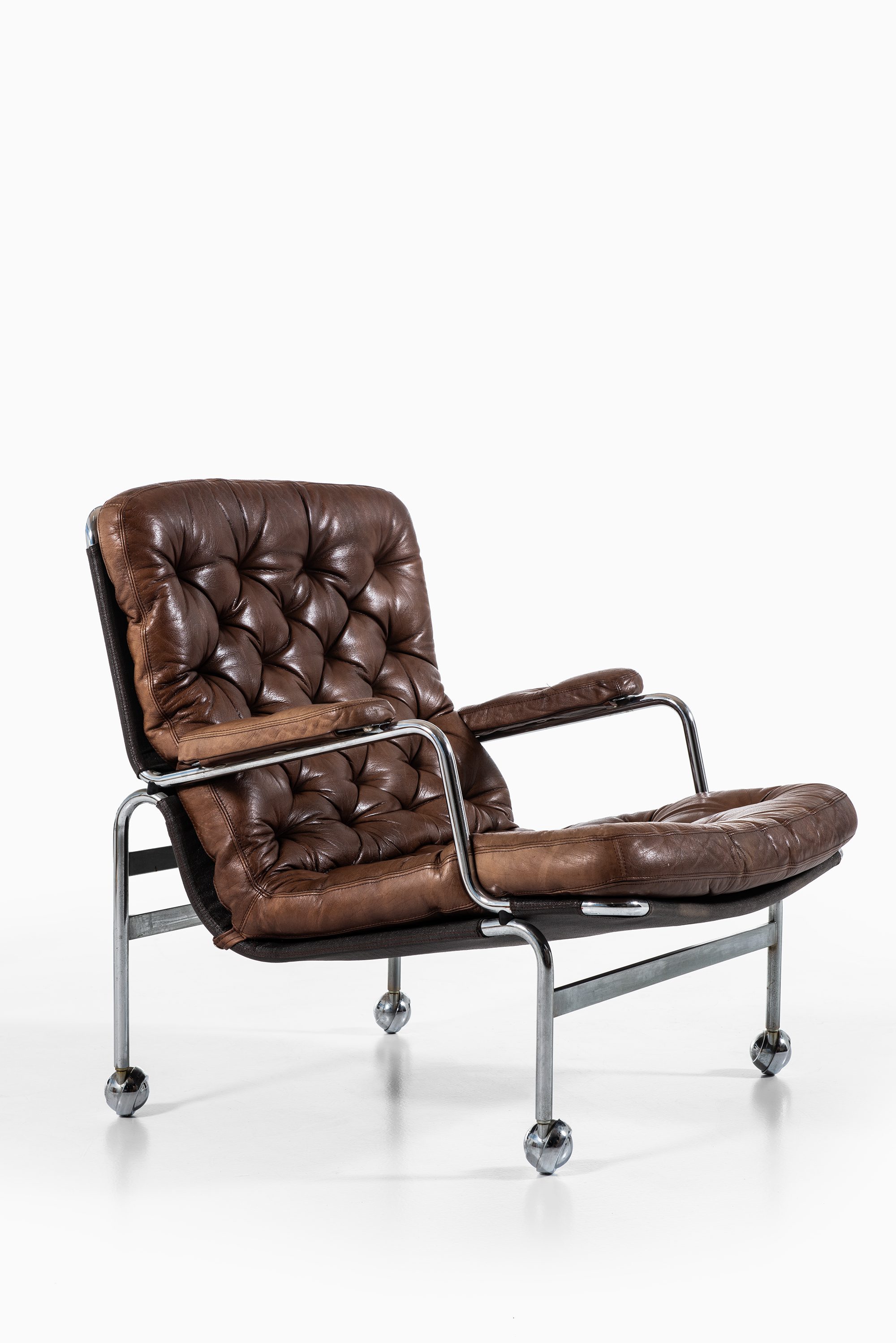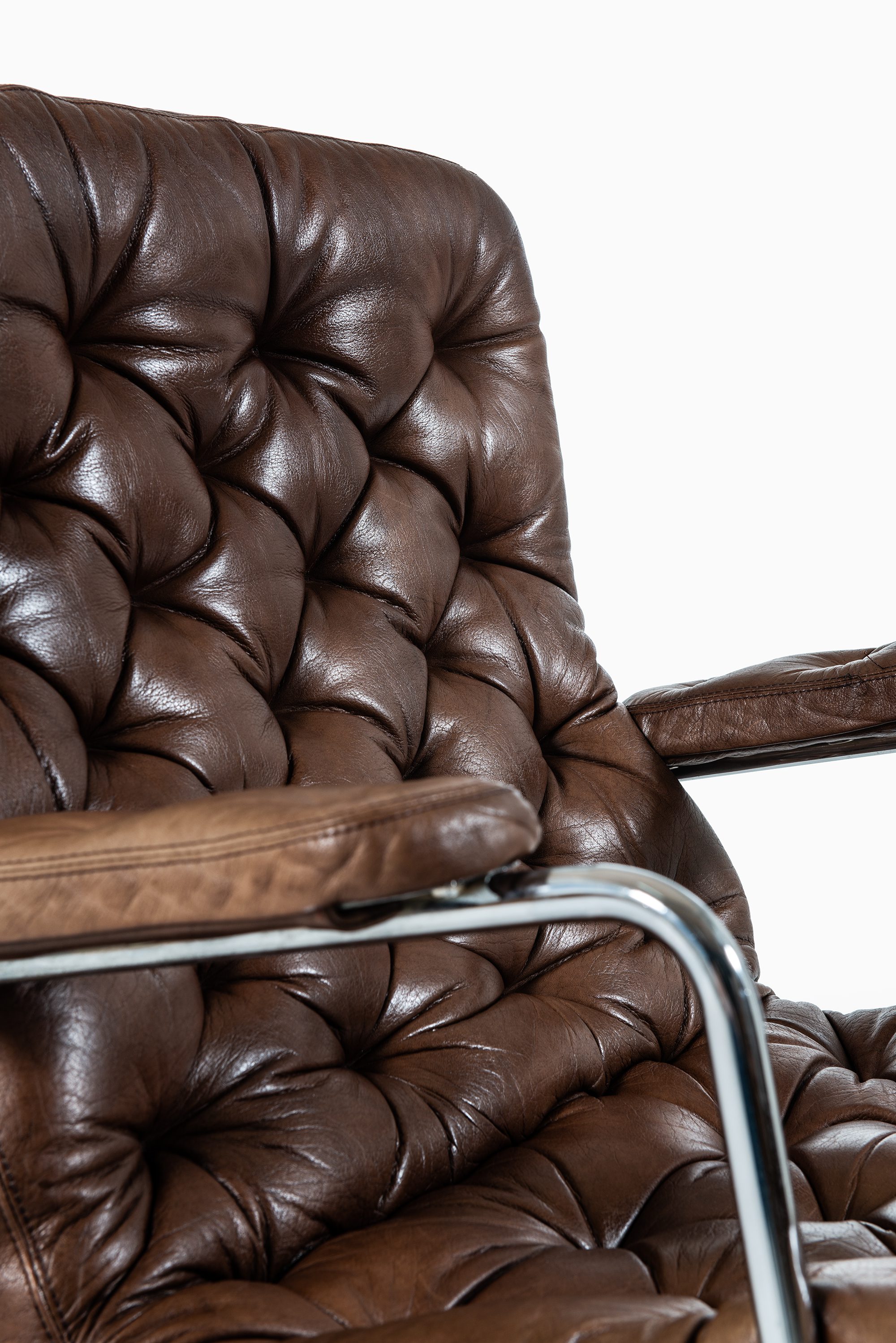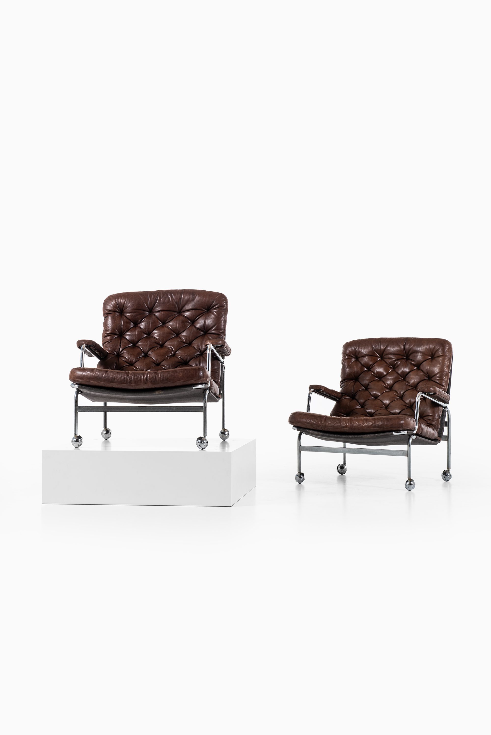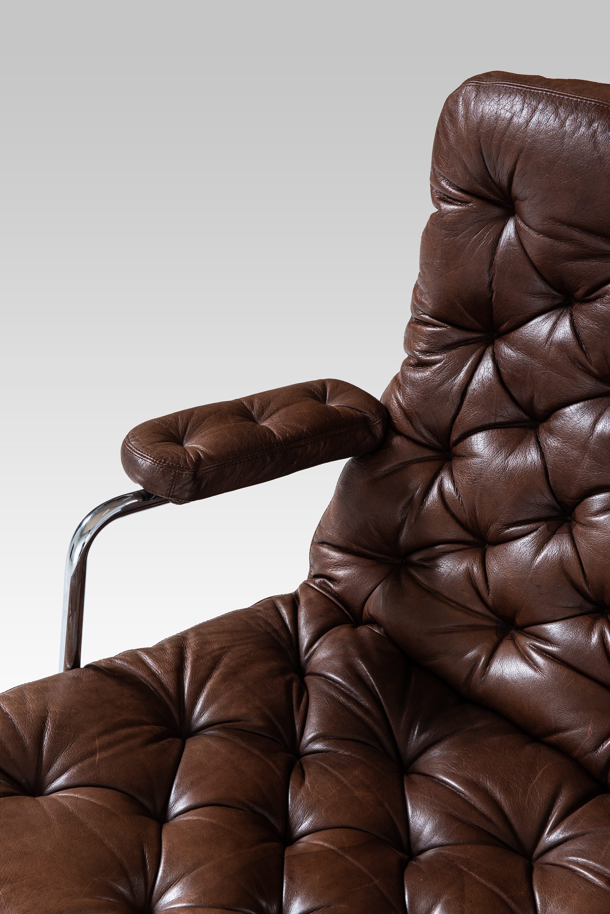 This pair of easy chairs, model Karin, was designed by Bruno Mathsson and produced by DUX in Sweden during the 1960s. They represent an important phase in Scandinavian modern design, combining functional comfort with an elegant use of materials. The chairs are constructed with chrome-plated steel frames that provide both structural lightness and durability, while the seating consists of deep button-tufted cushions in dark brown leather, creating a striking visual and tactile contrast.