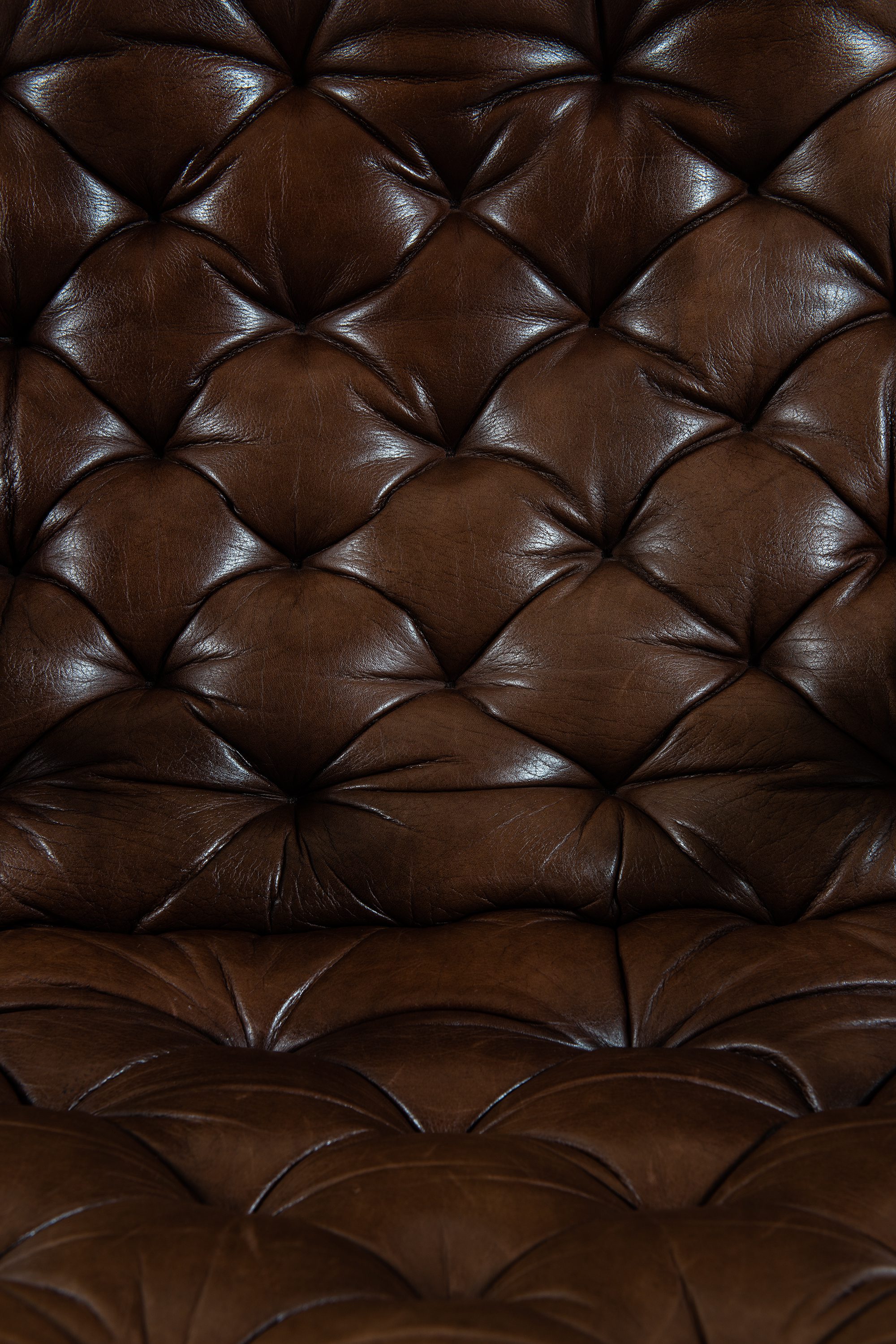 The design emphasizes Mathsson’s interest in ergonomics and flexible living, as the Karin model was one of the first to incorporate a moveable frame on wheels, highlighting the growing importance of adaptable furniture in postwar interiors. The leather upholstery shows a rich patina, with natural creasing and signs of wear consistent with age and use, giving the chairs a lived-in character without compromising their integrity. The combination of tubular steel and leather reflects the international modernist vocabulary while remaining distinctly Scandinavian in its refined proportions and understated luxury.