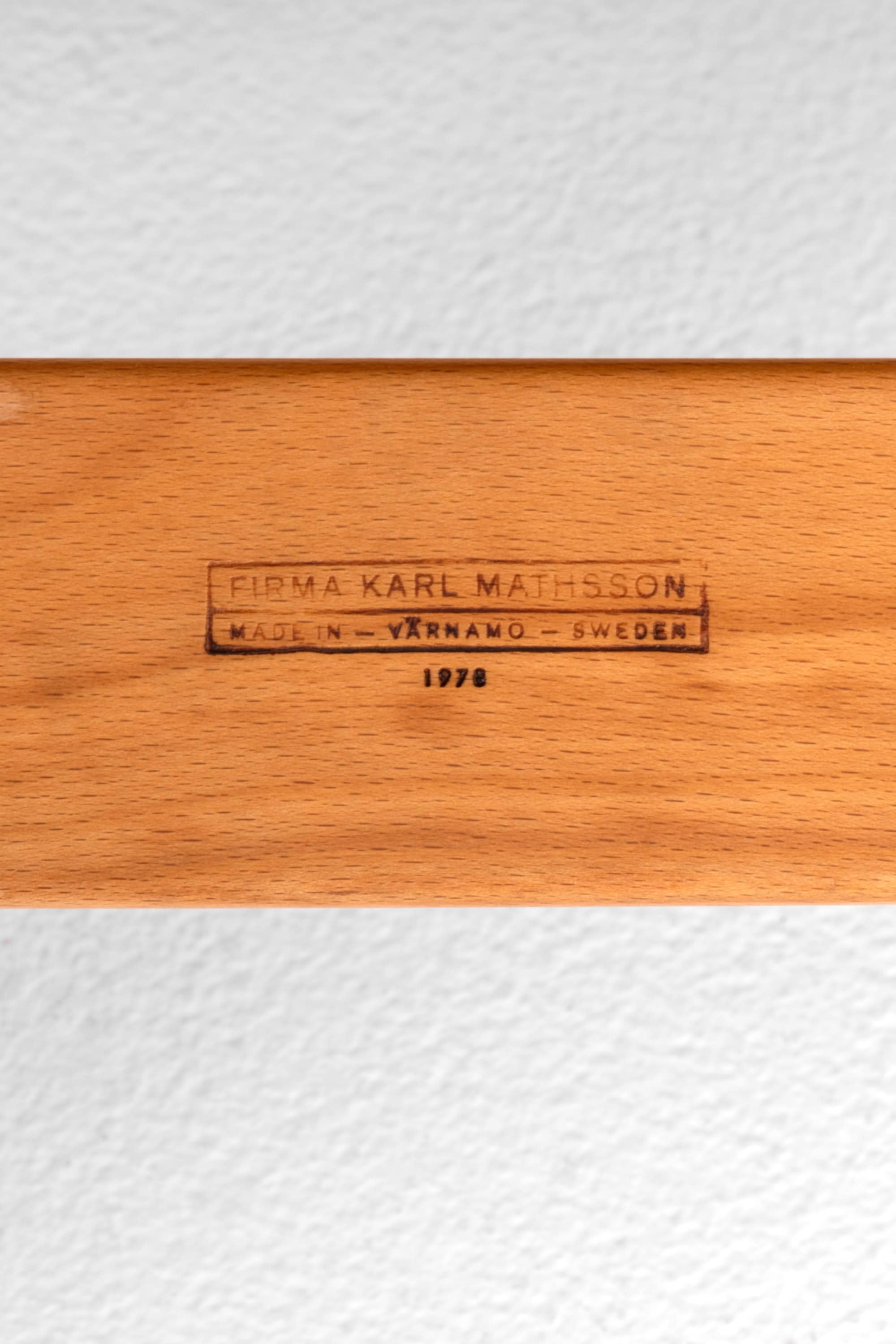 The producer, Firma Karl Mathsson in Värnamo, was a key manufacturer of Mathsson’s furniture and played an important role in bringing his designs into production. The company maintained high standards of woodworking and was known for executing Mathsson’s technically demanding constructions, particularly those involving curved wooden frames and tensioned woven supports. This set is marked and dated 1978, confirming its production period.
