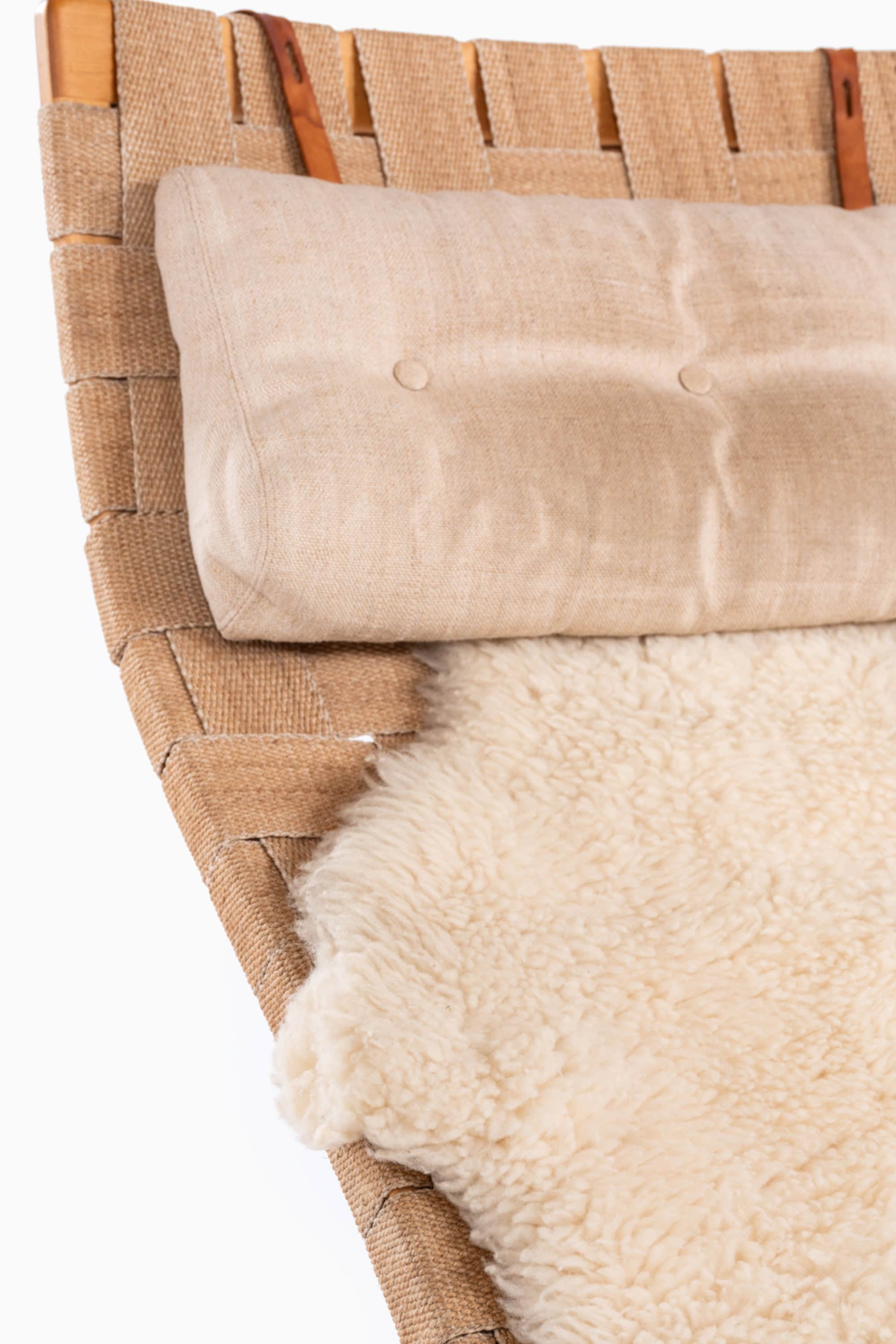 The seating surfaces are executed in woven webbing, arranged in a wide basket-weave pattern. The webbing has a muted beige-brown tone and forms a resilient suspended surface that adapts to body weight, functioning as an integrated spring system without the need for upholstery. The chair is accompanied by a loose sheepskin, adding a soft tactile layer and emphasizing the intended combination of functional modernism with domestic comfort. The chair includes a loose headrest cushion in matching neutral fabric, secured with leather straps at the upper backrest.