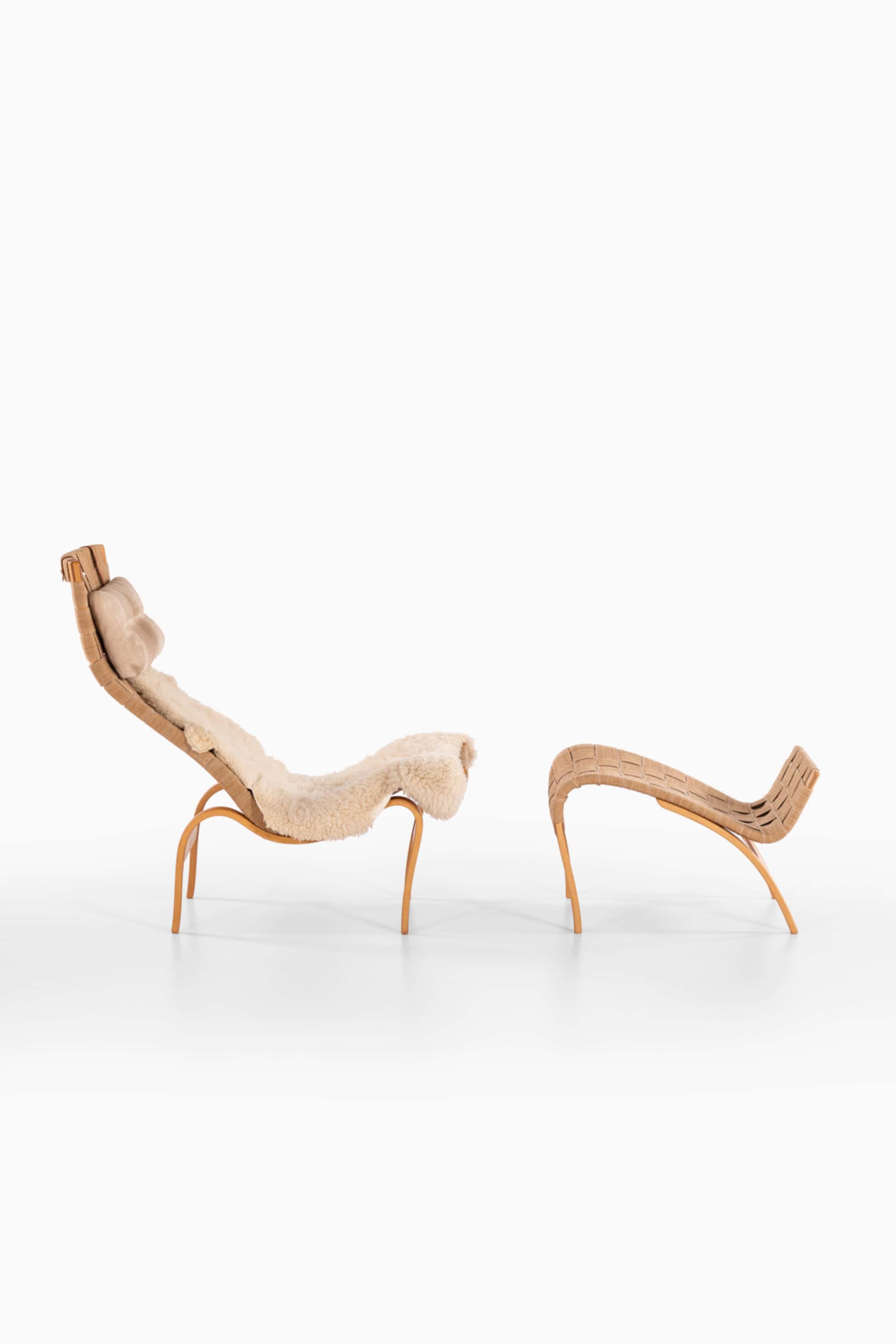 This lounge chair with matching stool was designed by Bruno Mathsson and produced by Firma Karl Mathsson in Värnamo, Sweden. The set represents a later production example of Mathsson’s long-standing exploration of ergonomic seating, where the structure is reduced to essential load-bearing elements and the comfort is achieved through carefully calculated curvature and flexible suspension.