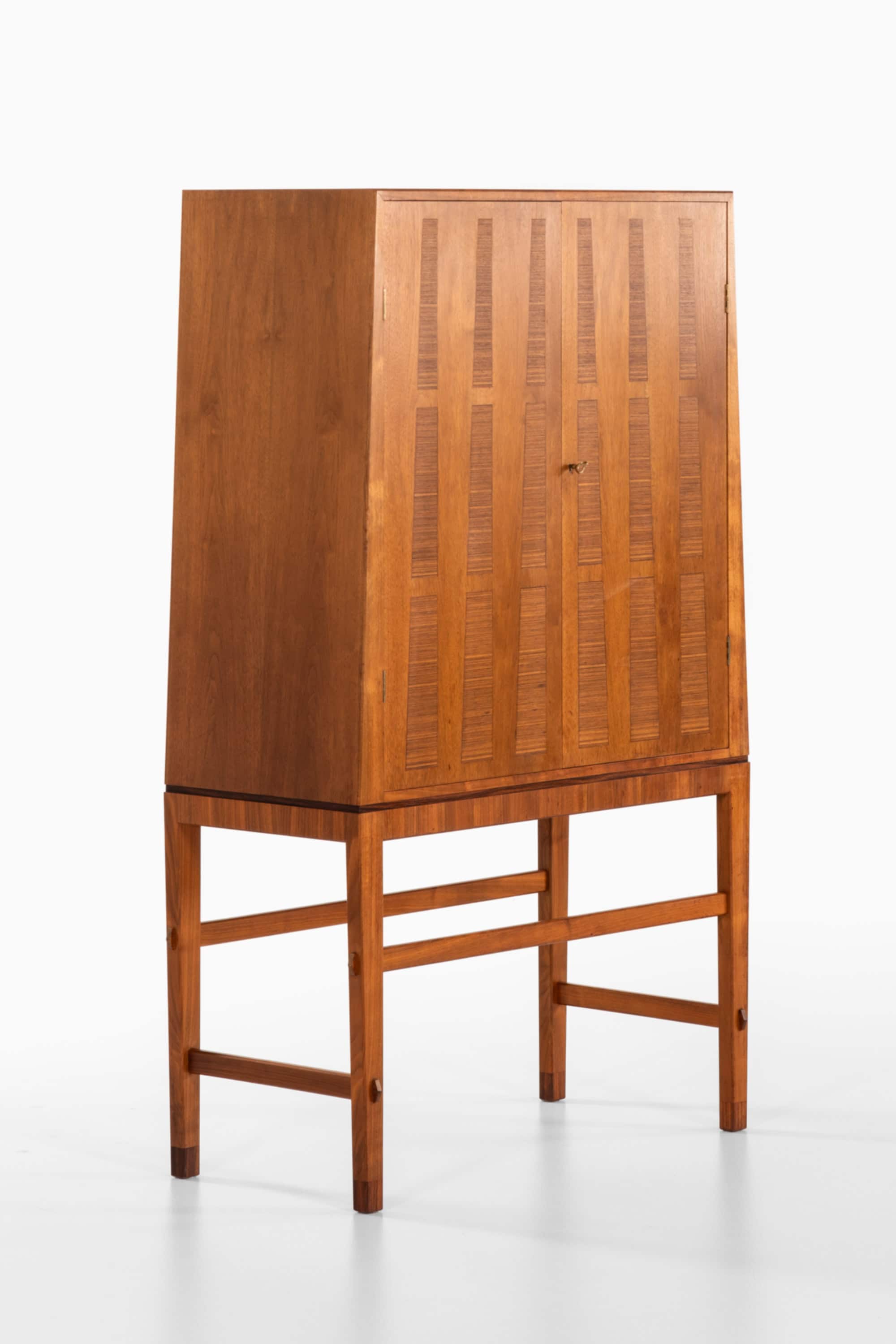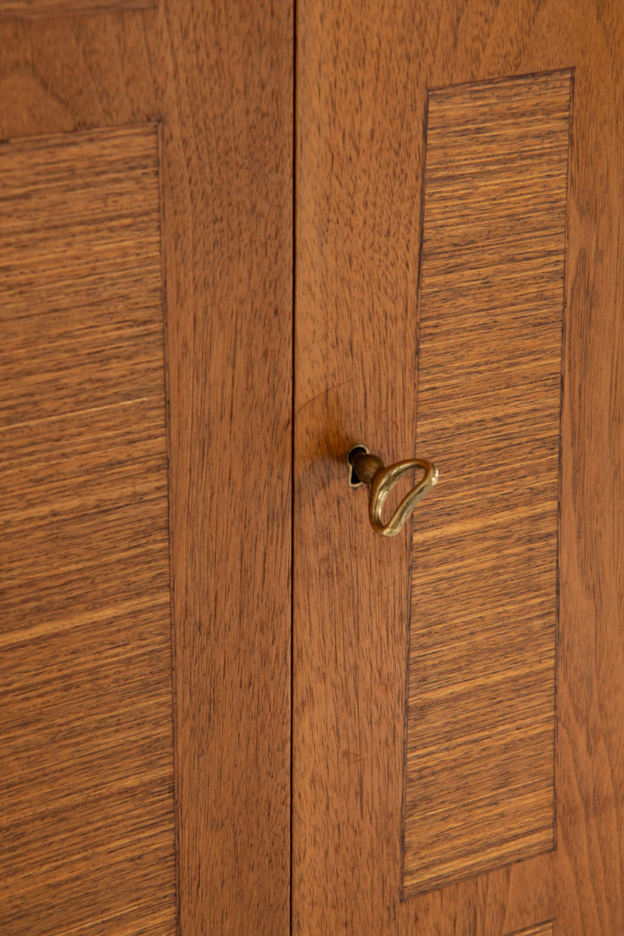 The cabinet stands on an elegant open base with carefully balanced proportions, giving it a light and elevated appearance while still feeling solid and stable. The front features a rhythmic geometric pattern created through inset rectangular panels, adding depth and subtle contrast to the warm walnut tone. A small original brass key and escutcheon provide a refined accent and underline the handmade nature of the piece.