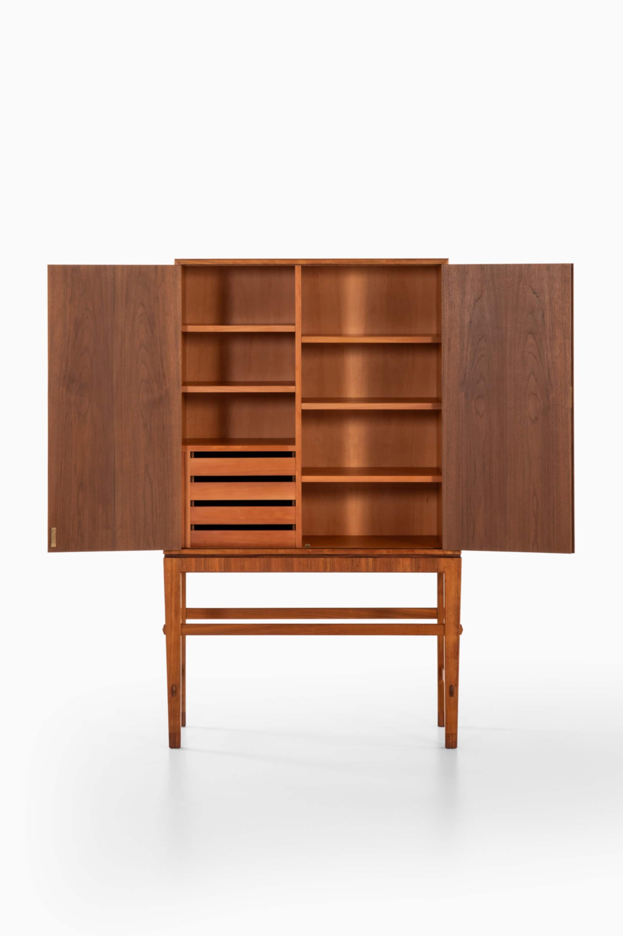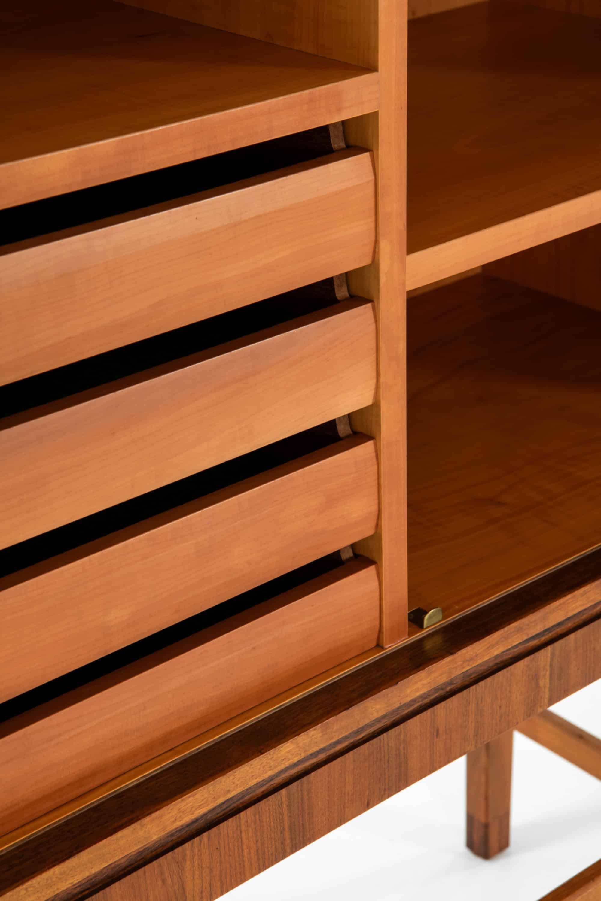 Inside, the cabinet offers a thoughtfully arranged interior with shelving on one side and a set of drawers on the other, making it suitable for a range of uses such as bar storage, office organisation, or display and concealment of smaller objects. The interior is crafted with the same care as the exterior, with smooth surfaces and well-fitted components that reflect the precision expected from an examination work.
