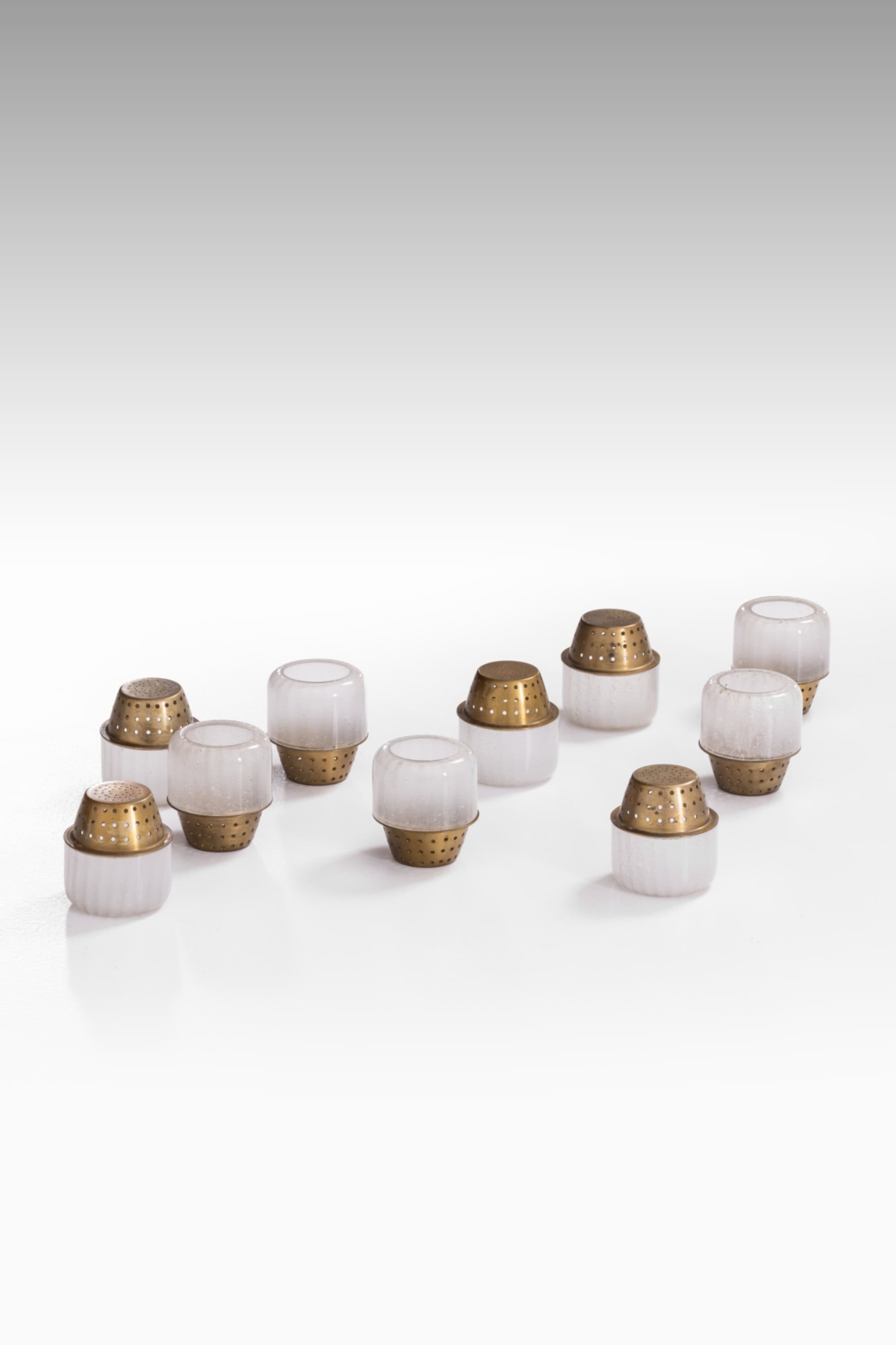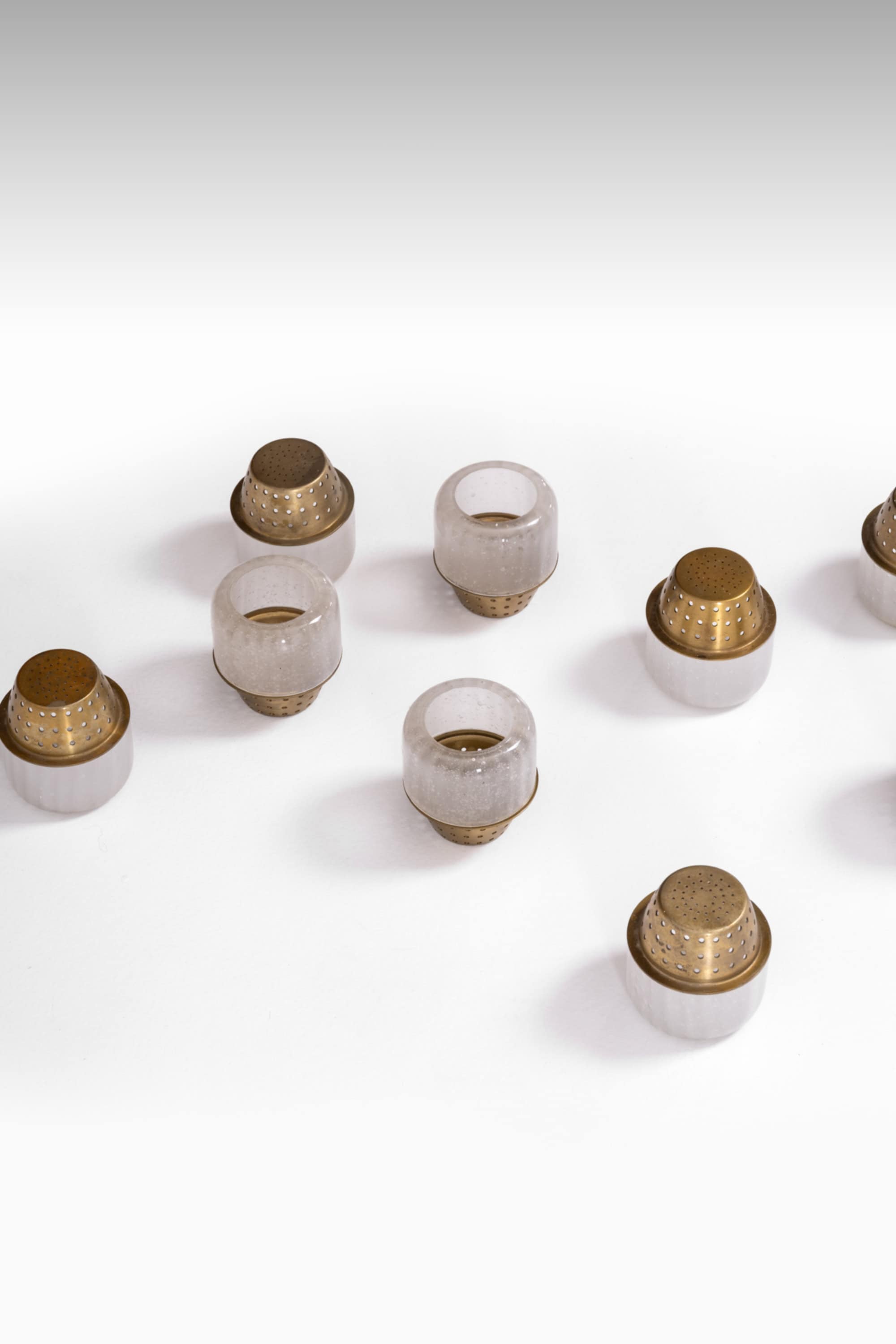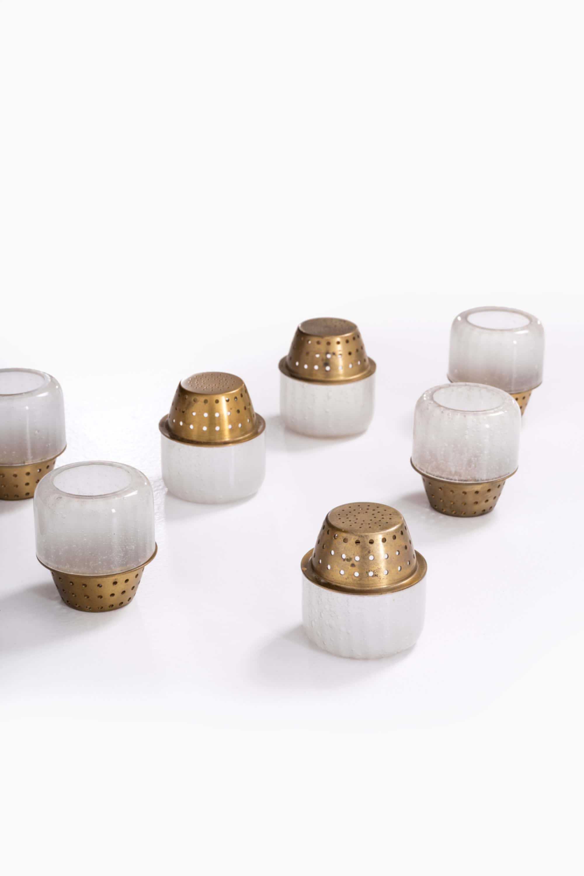 This rare set of candlesticks was produced in Sweden during the 1950s and reflects the refined material language typical of Scandinavian mid-century decorative objects. Executed in brass and textured glass, the design combines industrial precision with a soft sculptural expression, resulting in a series of compact candleholders with a distinctly architectural character.
