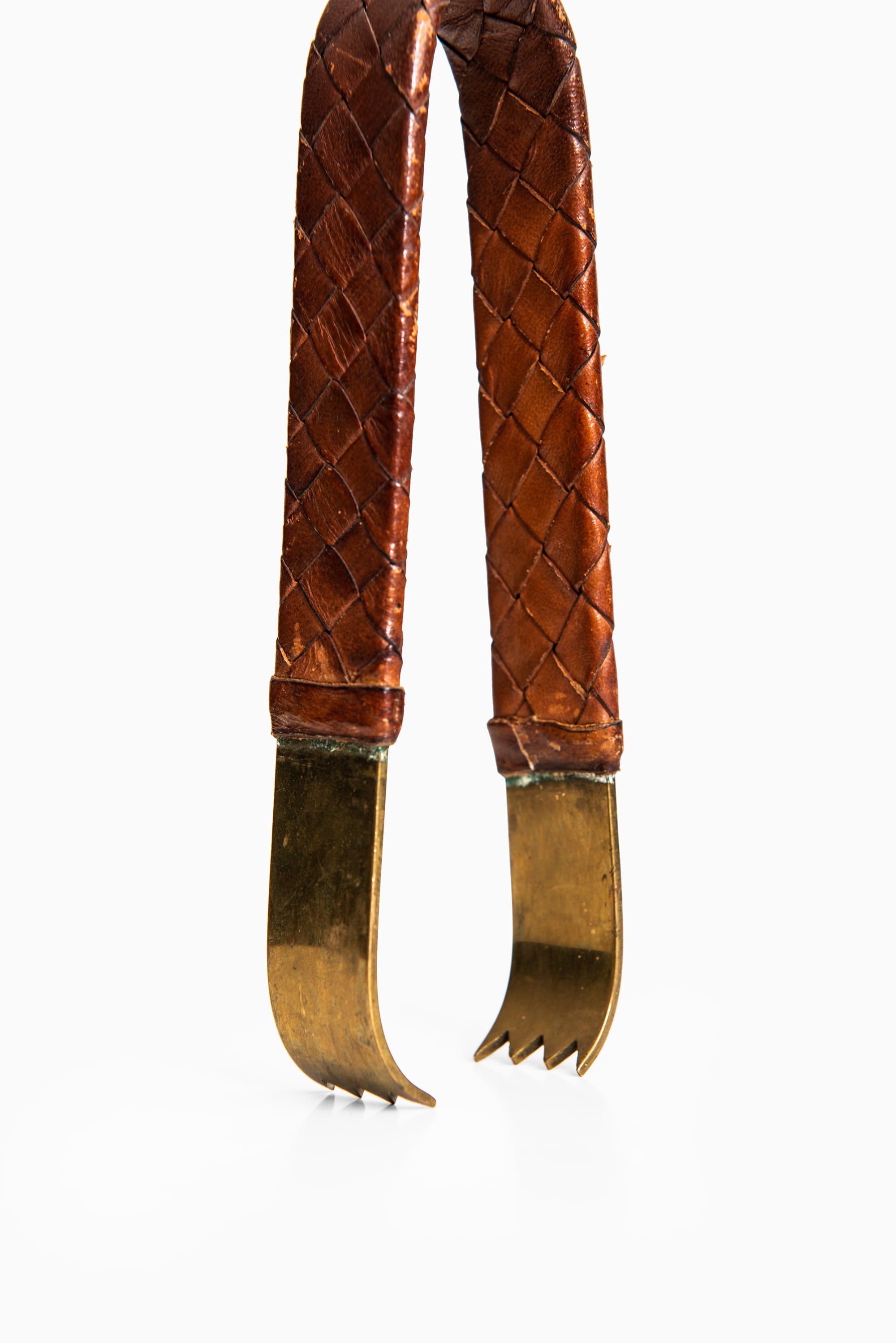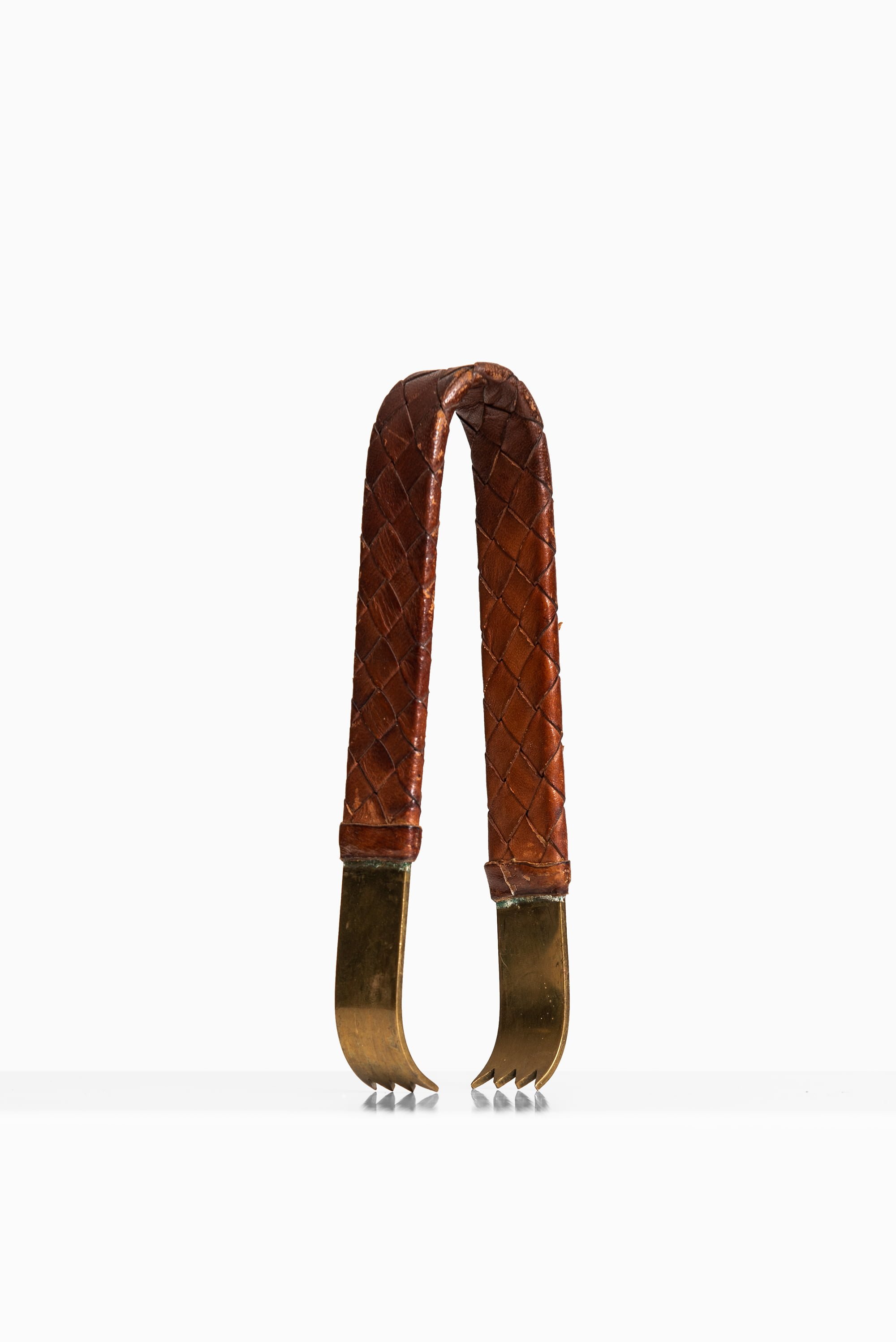 Executed in brass and hand-braided leather, the pincer embodies the tactile warmth and sculptural restraint for which Auböck’s studio is celebrated. The softly aged brass offers a rich patina that complements the woven leather grip, merging utility with artistry. Subtle variations in tone and texture reveal the handmade process, giving the piece a unique individuality.