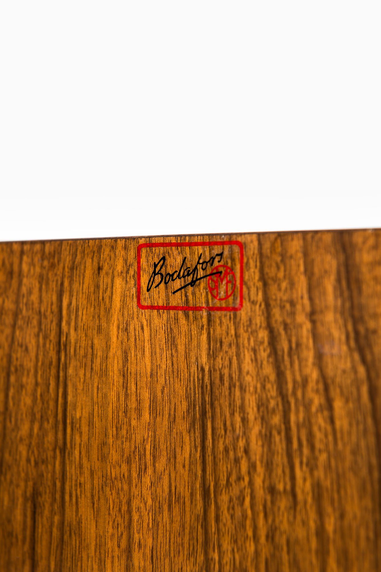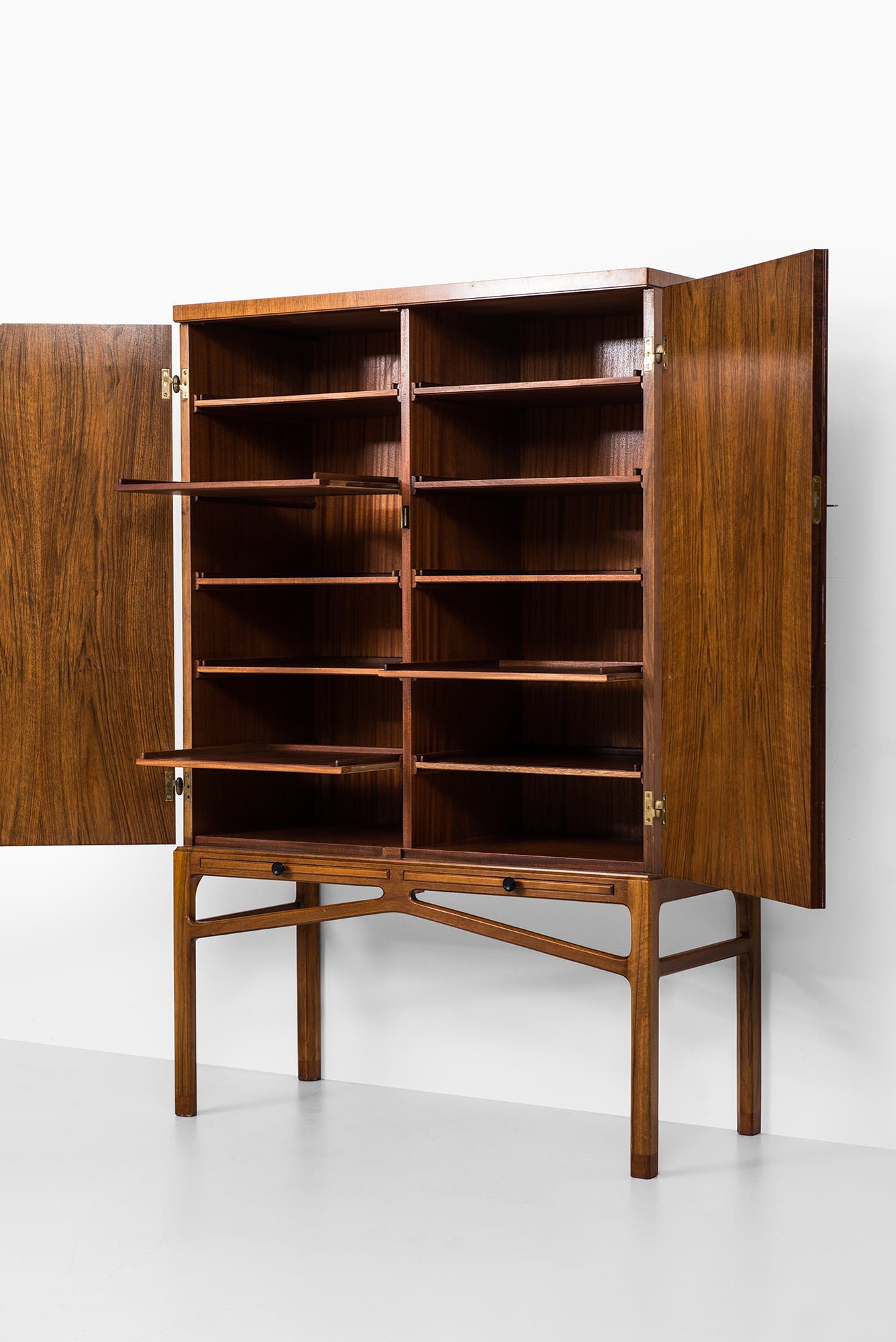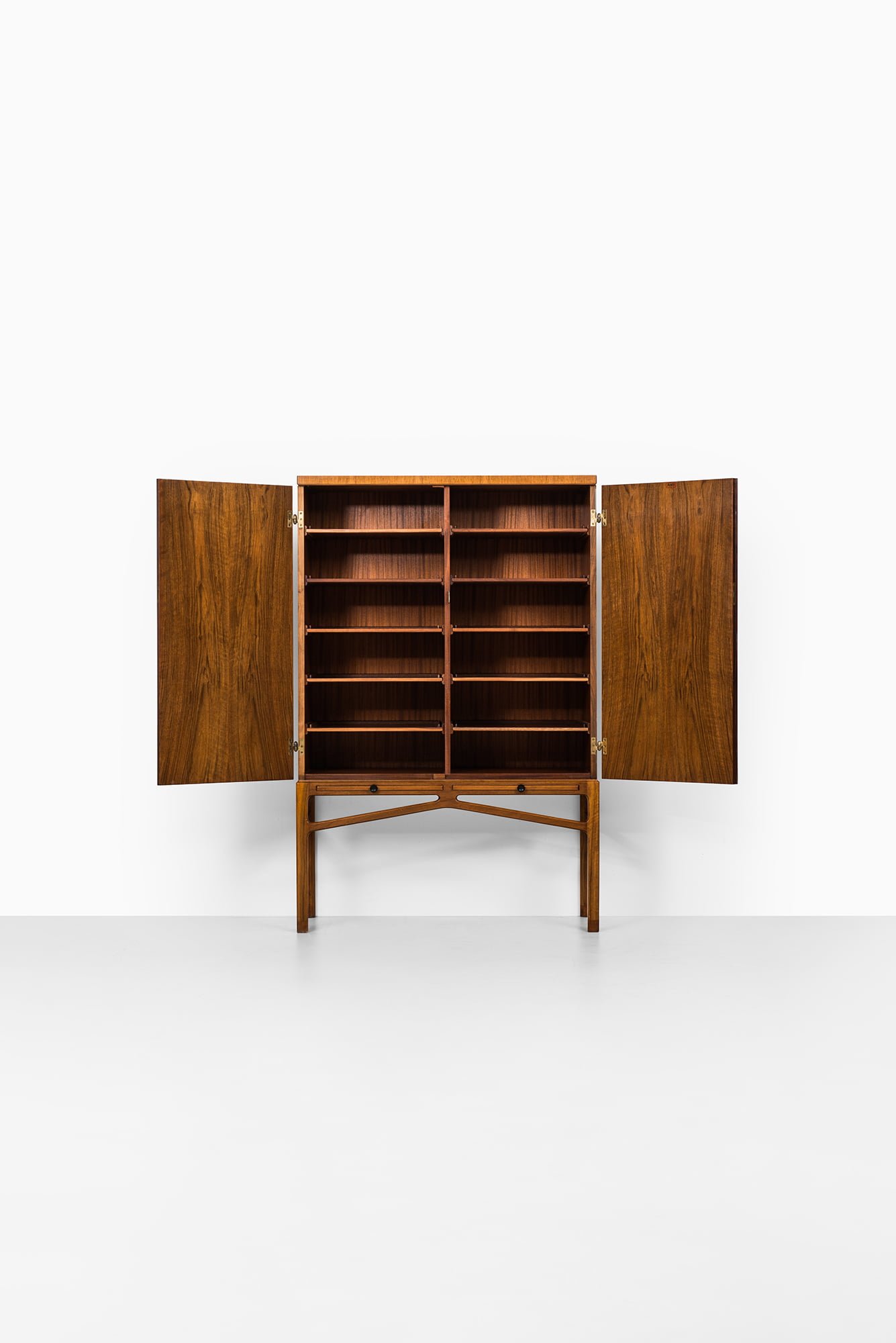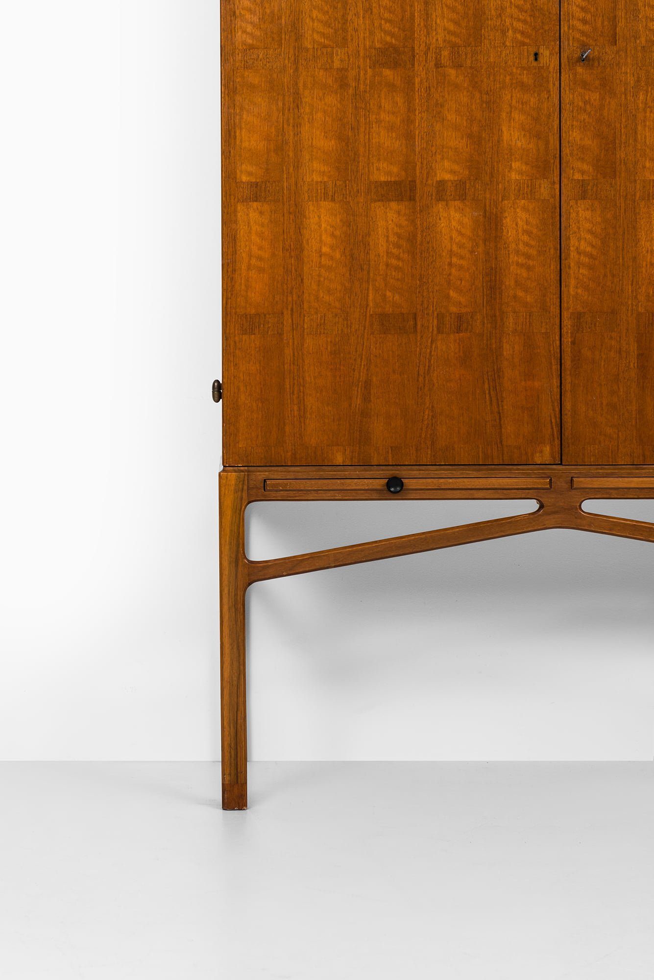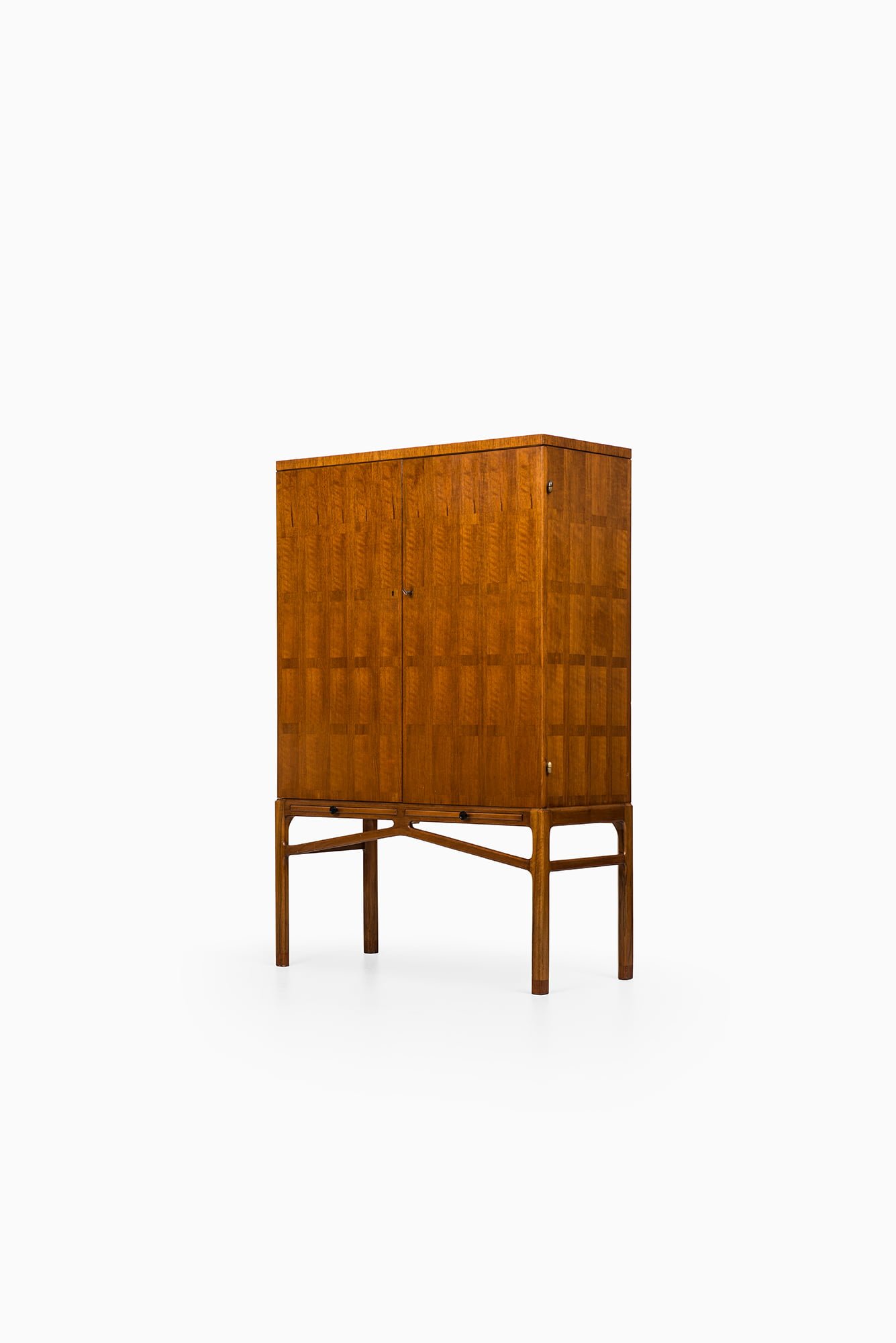 Rare cabinet designed by Carl-Axel Acking and produced by Bodafors in Sweden during the 1940s. This piece is crafted from mahogany and walnut, with brass hardware that adds a subtle decorative element. The cabinet stands on a finely constructed base with elegant cross-bracing, reflecting Acking’s architectural approach to furniture design.