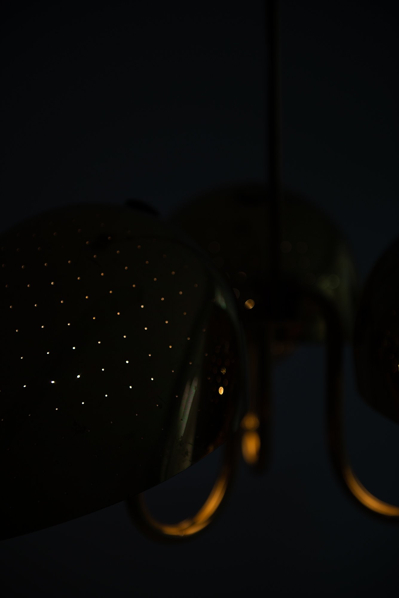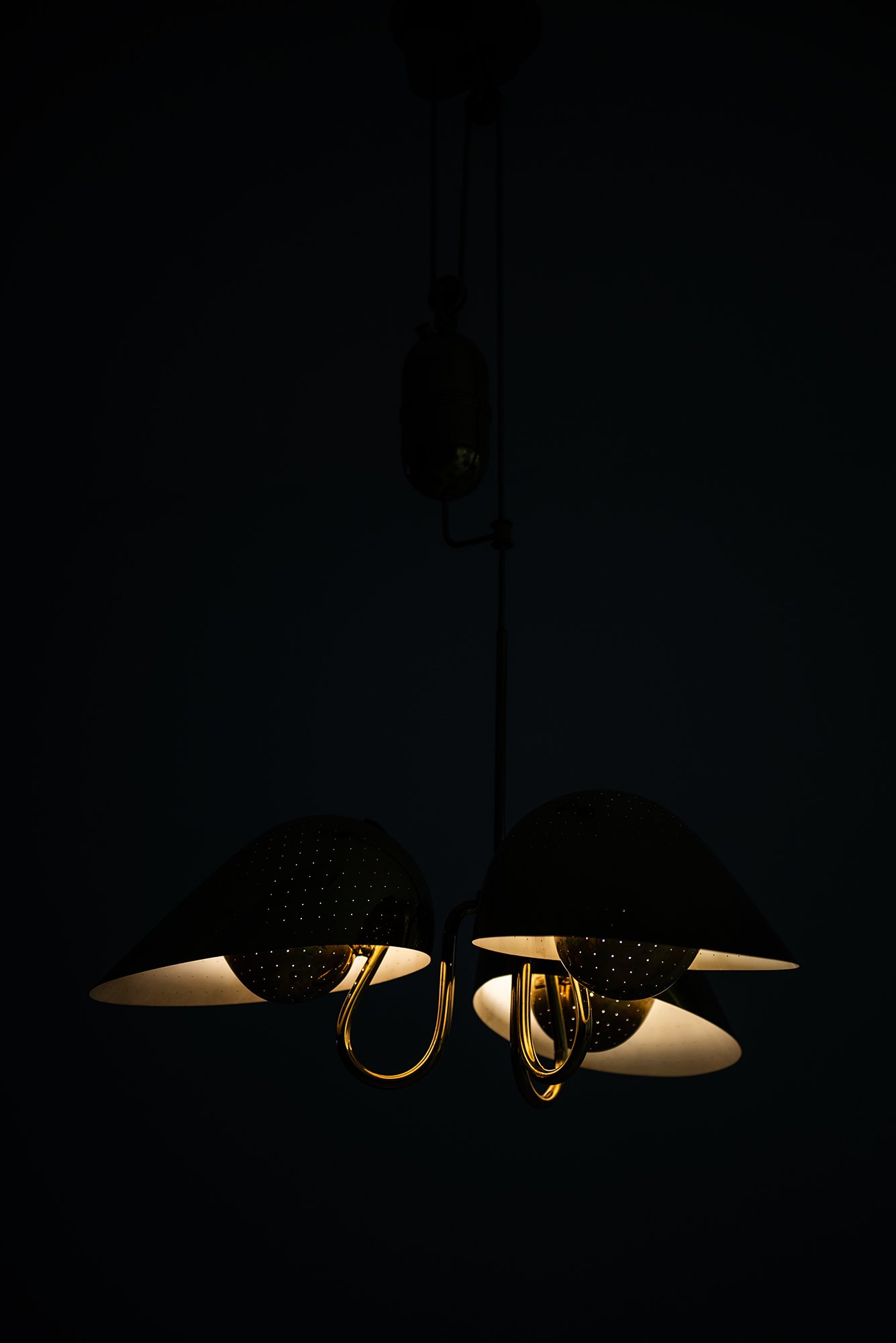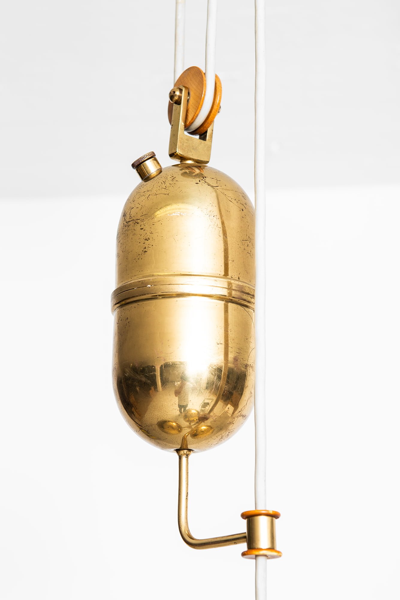 This rare height-adjustable ceiling lamp was designed by Carl-Axel Acking and produced by Bröderna Malmströms Metallvarufabrik in Sweden during the 1940s. Executed entirely in brass, the lamp demonstrates Acking’s refined understanding of both form and function. The material has developed a rich, naturally aged patina, highlighting its vintage character while preserving the original warm golden hue of the metal.