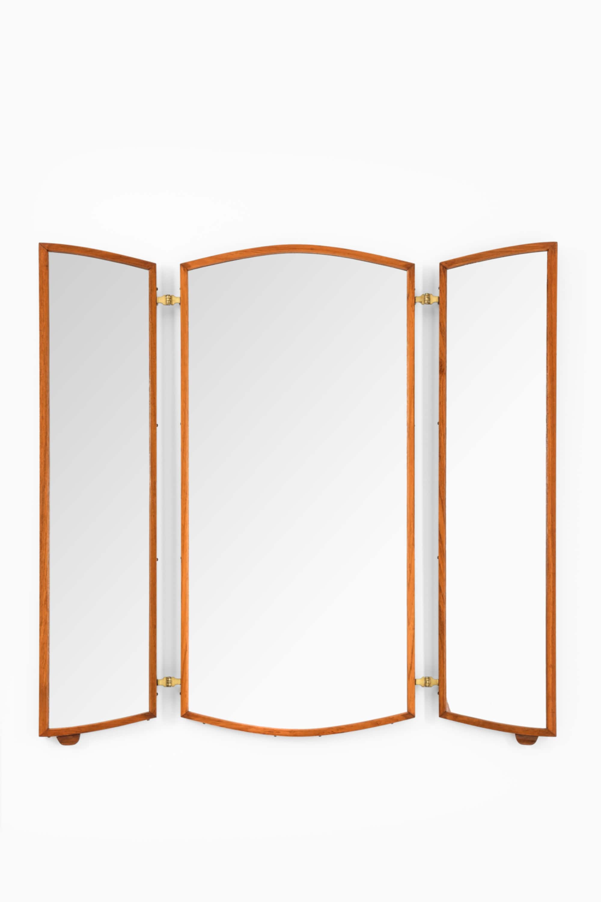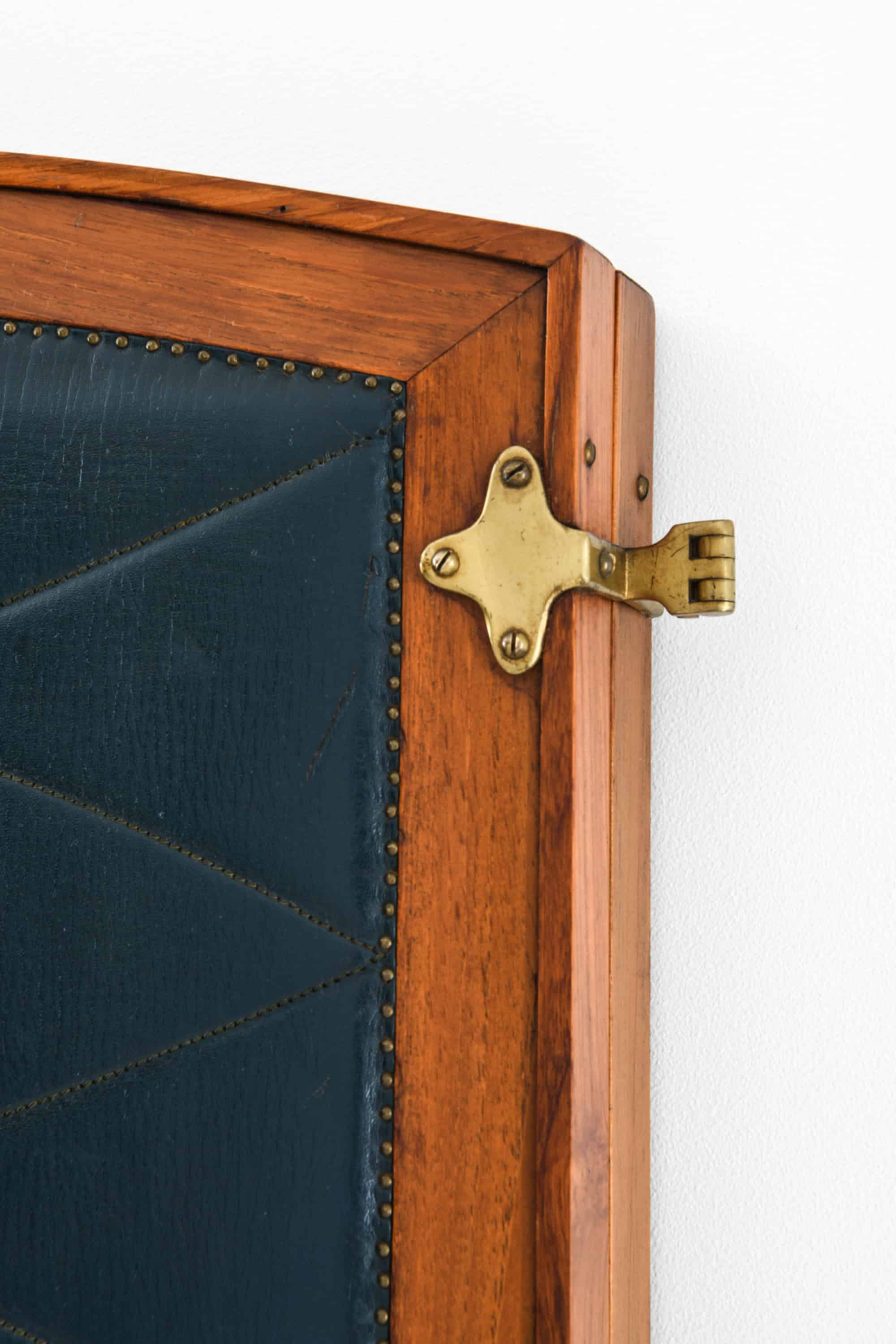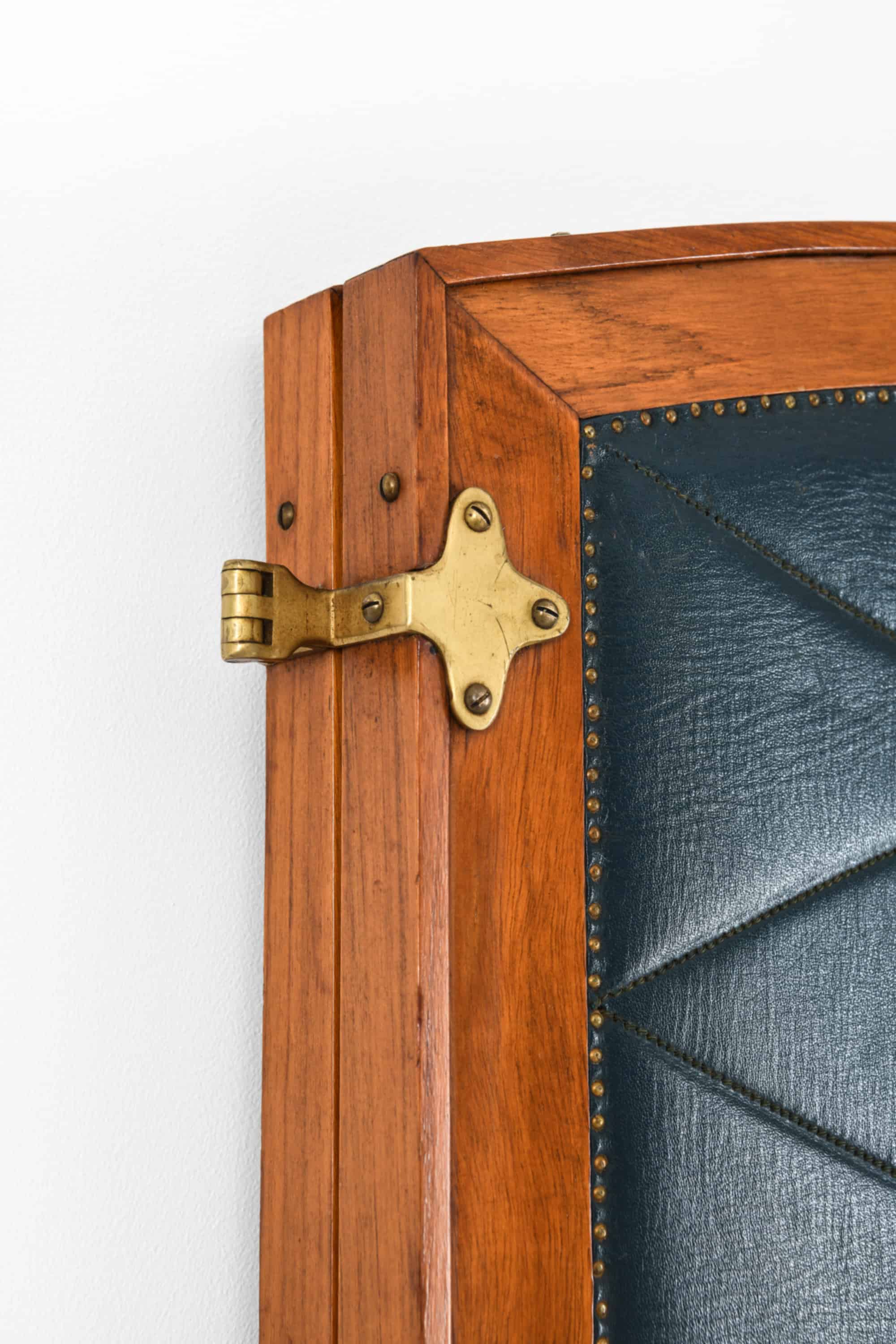 This foldable wall mirror was designed by Carl-Axel Acking and produced by Bodafors Möbelfabrik in Sweden in the late 1940s. The mirror consists of a central mirrored panel with two hinged side wings, allowing it to be opened or closed depending on use. When closed, the front features blue leather panels framed in mahogany, with decorative stitching arranged in a repeating geometric pattern. The leather is finished with a row of brass nailheads along the edges, giving the piece a refined and durable surface. The hinges are made of brass, shaped with small decorative flourishes.