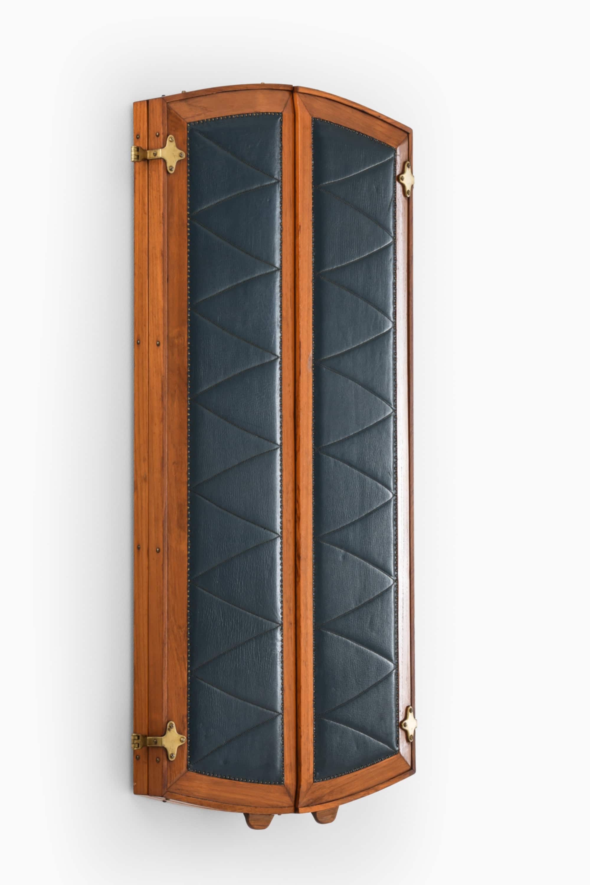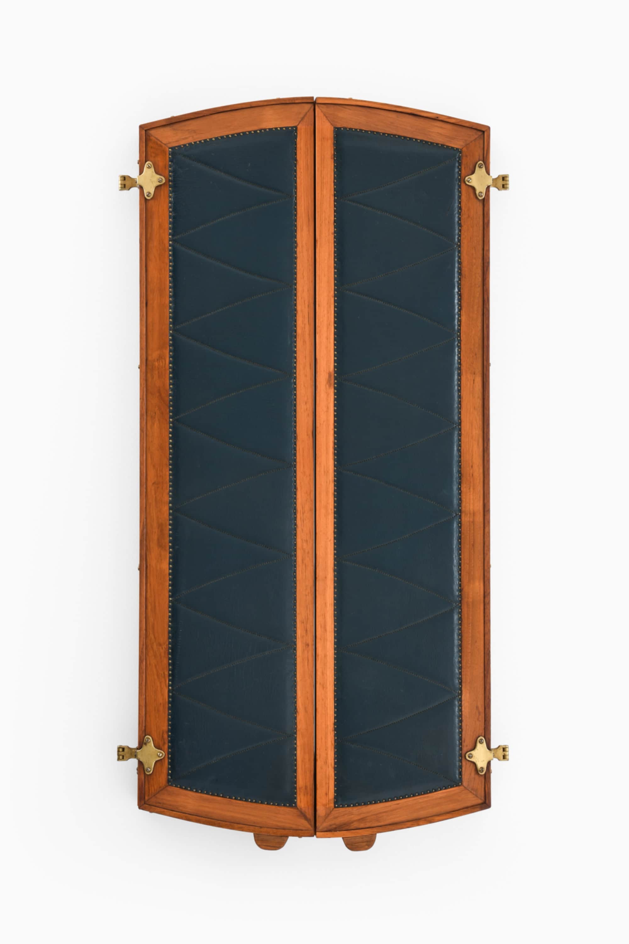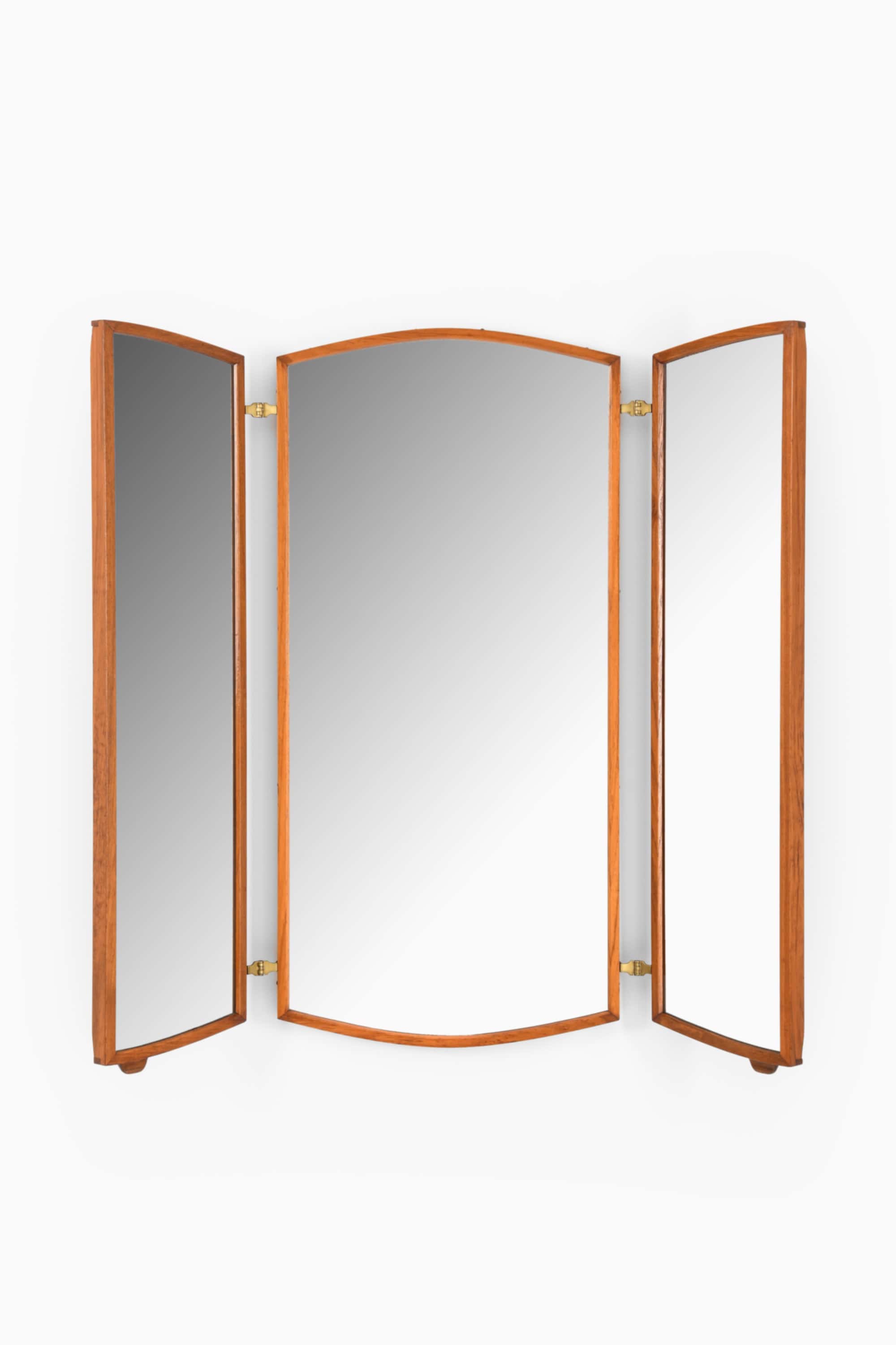 This foldable wall mirror was designed by Carl-Axel Acking and produced by Bodafors Möbelfabrik in Sweden in the late 1940s. The mirror consists of a central mirrored panel with two hinged side wings, allowing it to be opened or closed depending on use. When closed, the front features blue leather panels framed in mahogany, with decorative stitching arranged in a repeating geometric pattern. The leather is finished with a row of brass nailheads along the edges, giving the piece a refined and durable surface. The hinges are made of brass, shaped with small decorative flourishes.