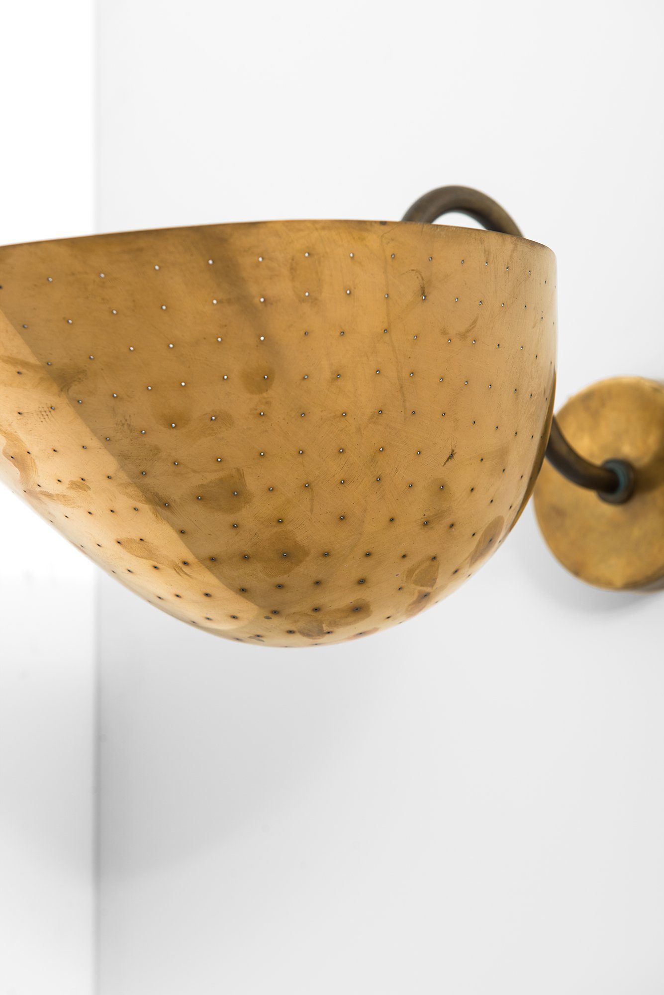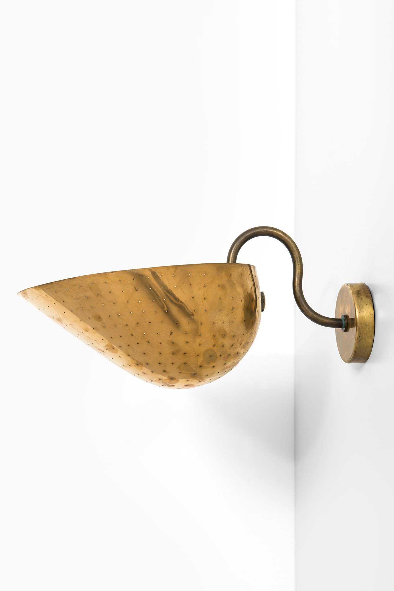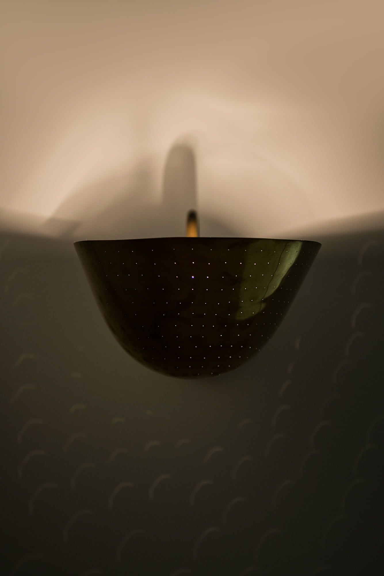 This is a rare pair of wall lamps designed by Carl-Axel Acking and produced by Bröderna Malmströms Metallvarufabrik in Sweden during the 1940s. Each lamp features a delicately perforated brass shade, allowing the light to filter through in a soft, patterned glow that creates a distinctive ambiance. The organic, slightly asymmetrical shape of the shade adds a sculptural quality, while the curved arm and circular wall mount emphasize the elegant, functionalist design typical of Scandinavian lighting from this period.