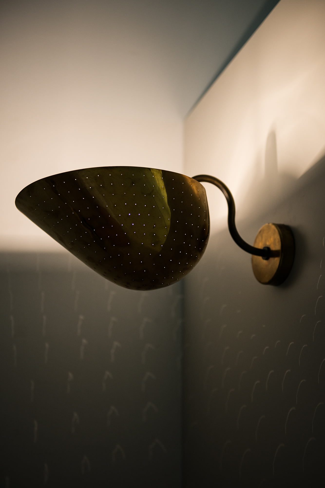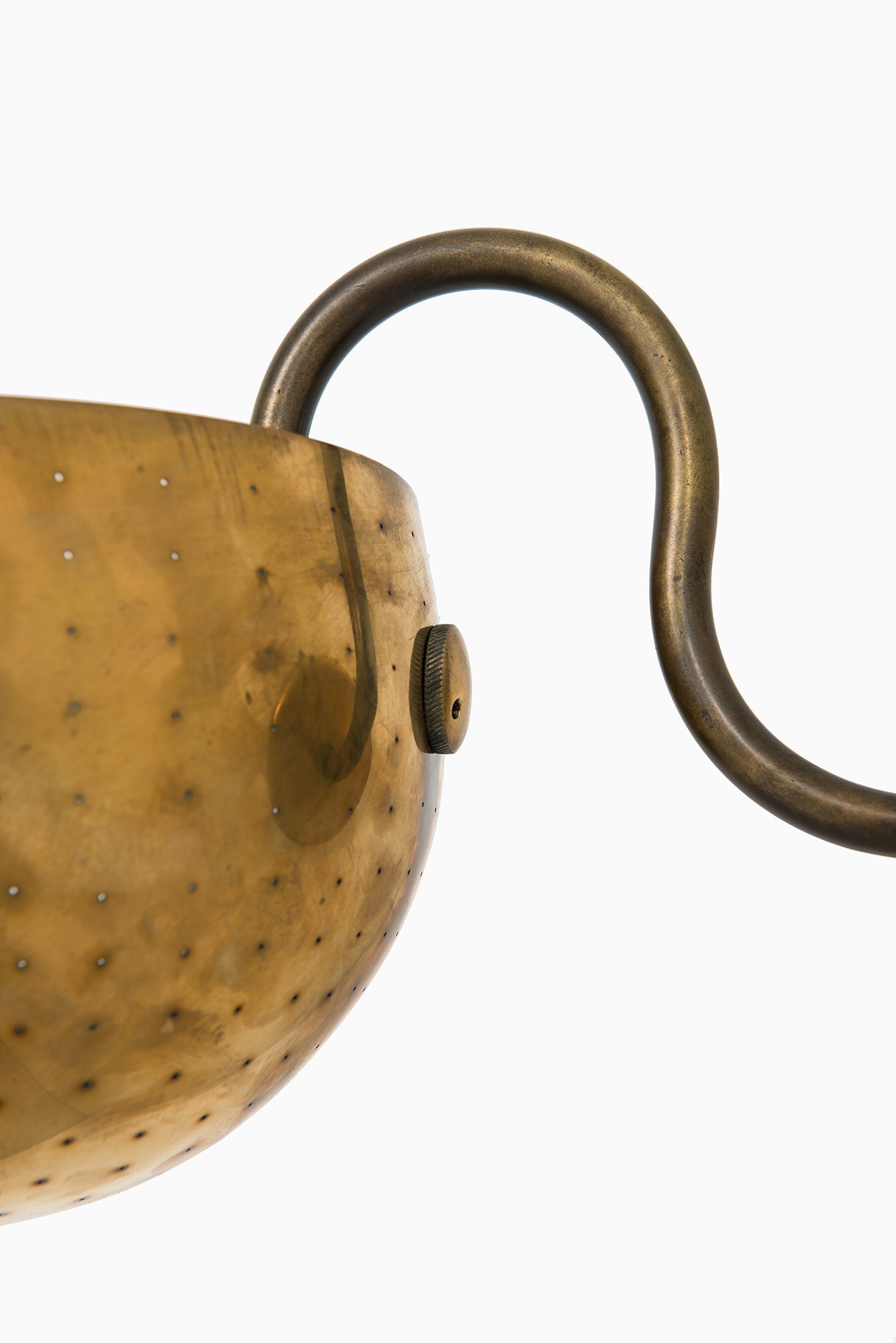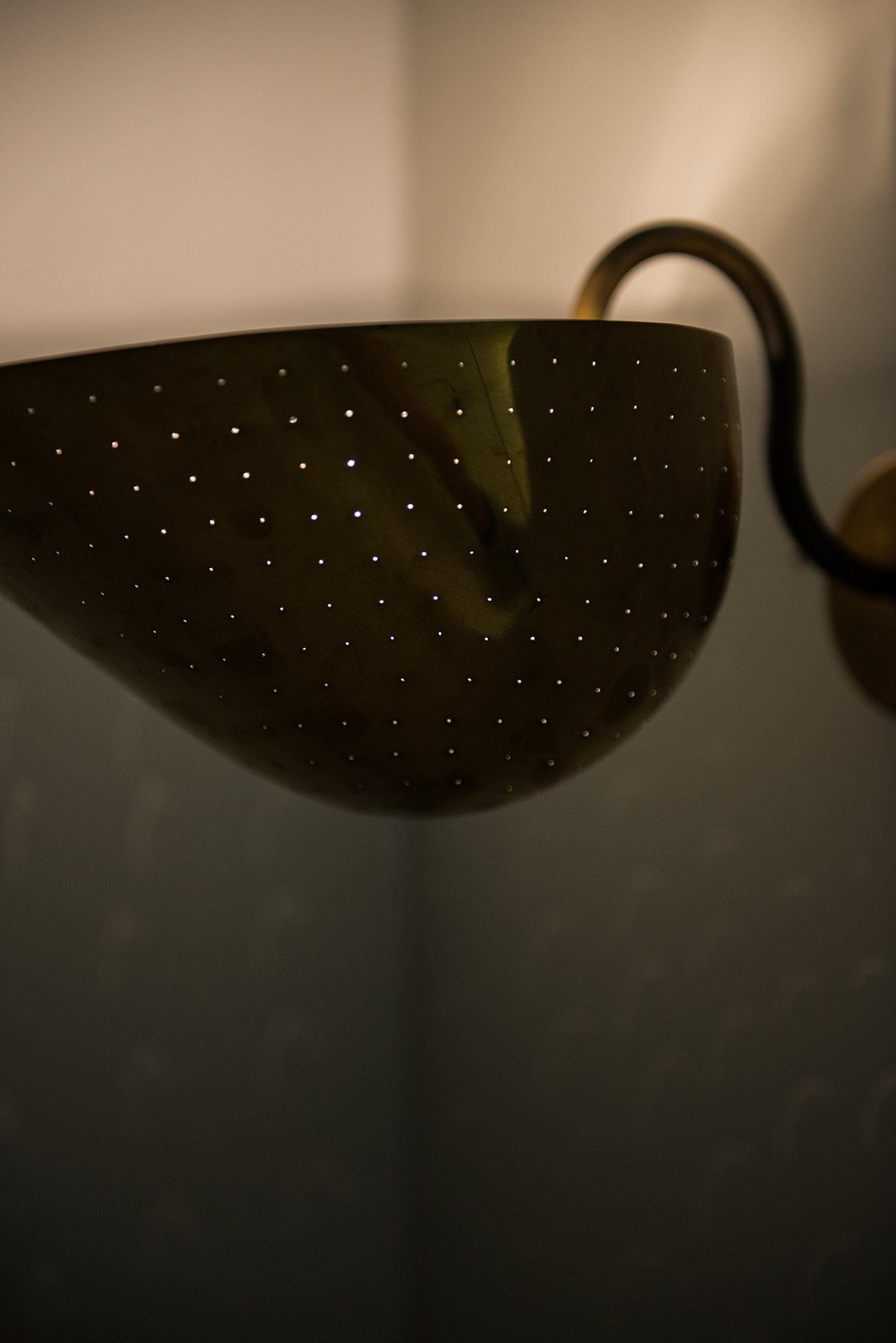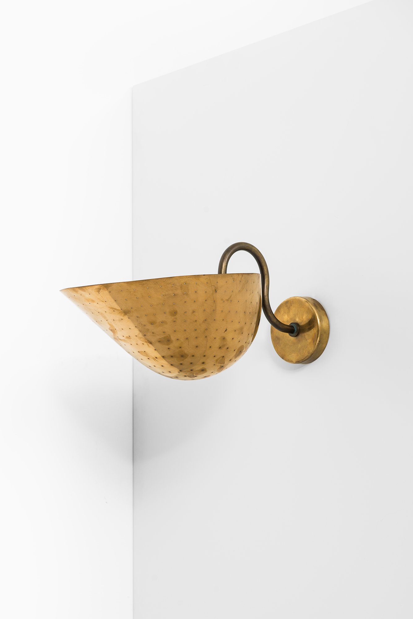 This is a rare pair of wall lamps designed by Carl-Axel Acking and produced by Bröderna Malmströms Metallvarufabrik in Sweden during the 1940s. Each lamp features a delicately perforated brass shade, allowing the light to filter through in a soft, patterned glow that creates a distinctive ambiance. The organic, slightly asymmetrical shape of the shade adds a sculptural quality, while the curved arm and circular wall mount emphasize the elegant, functionalist design typical of Scandinavian lighting from this period.