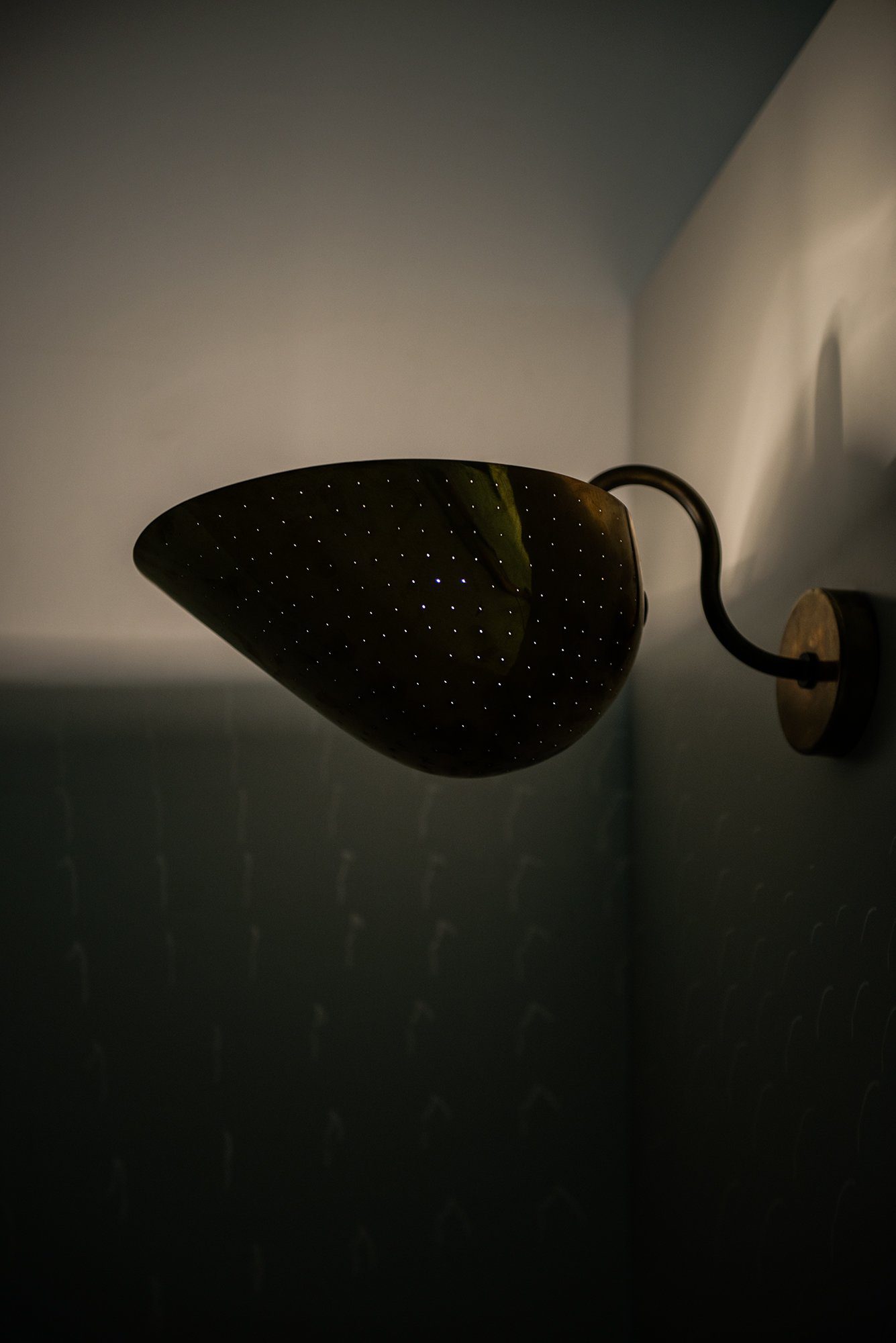The lamps are crafted entirely from brass, which has developed a rich, warm patina over time, highlighting the age and authenticity of the pieces. The perforations in the shade not only diffuse the light but also project a decorative pattern onto the surrounding walls, making them as much an atmospheric element as a functional light source.