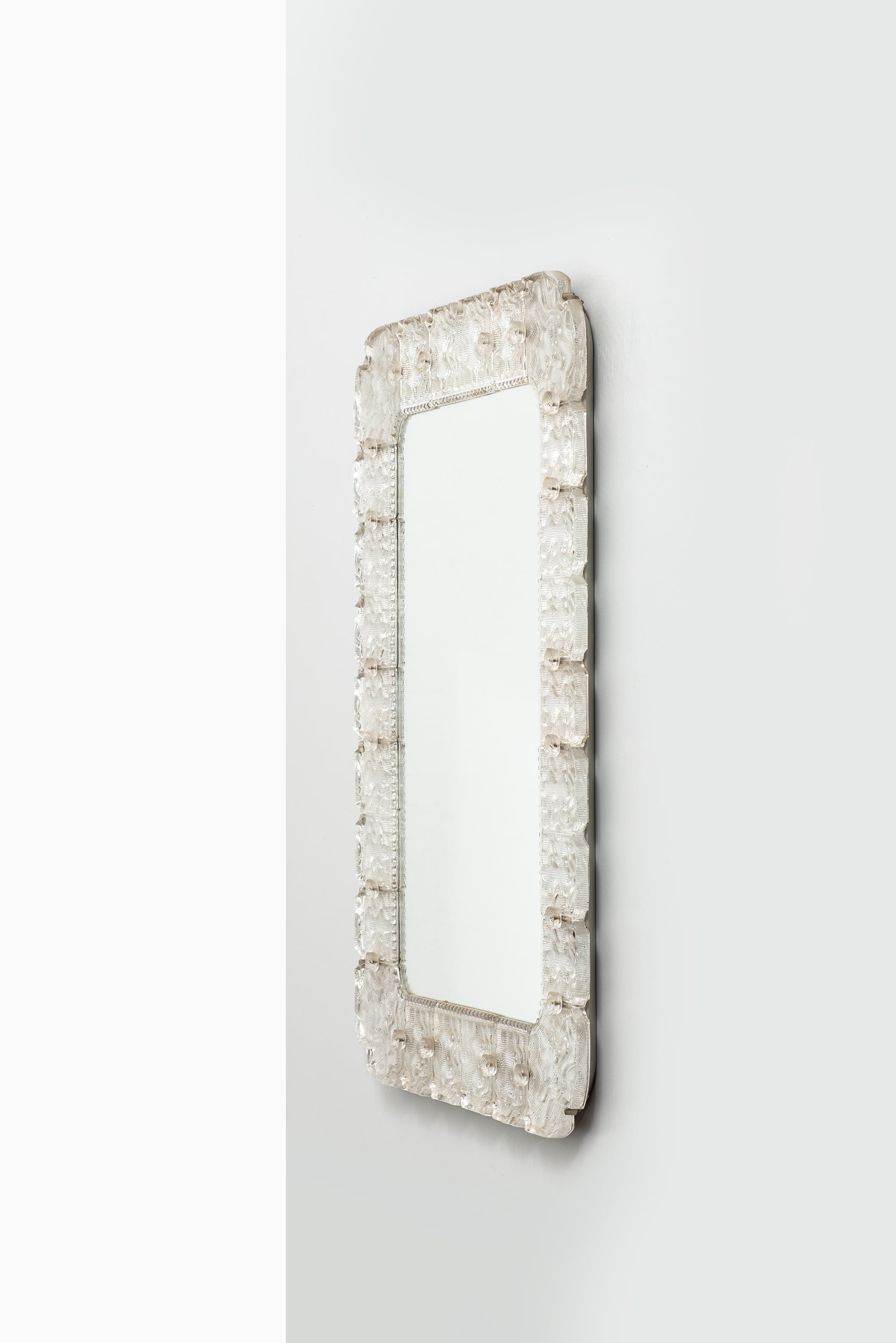The rectangular form is softened by rounded corners and the subtle irregularities of the cast glass, emphasizing the artisanal quality of its production. Behind the apparent simplicity lies a complex process of glass casting and polishing that reflects Orrefors’ dedication to technical excellence. The mirror’s restrained palette and tactile surface make it an outstanding example of Scandinavian mid-century decorative design, combining modern geometry with the organic qualities of hand-crafted glass.