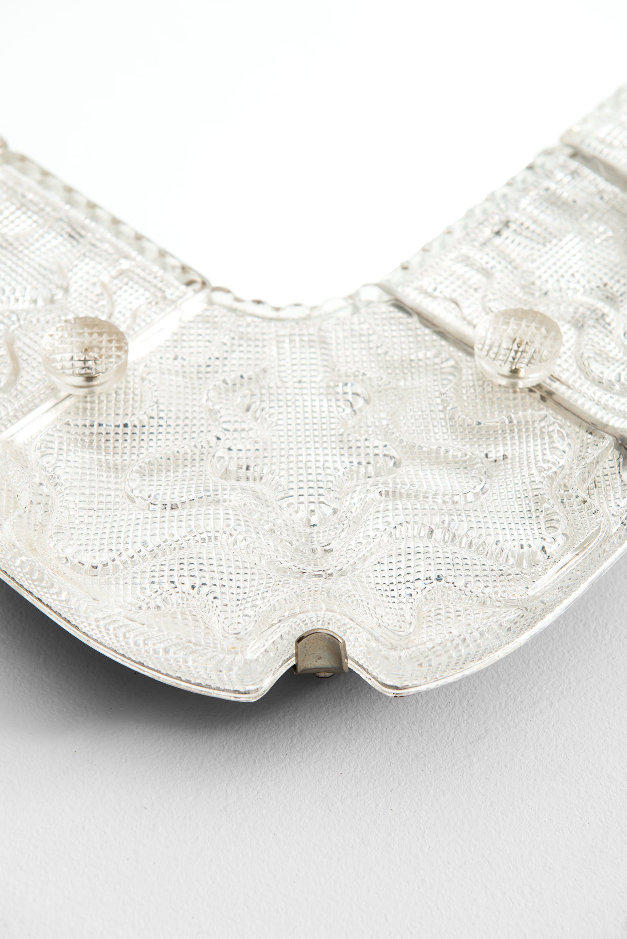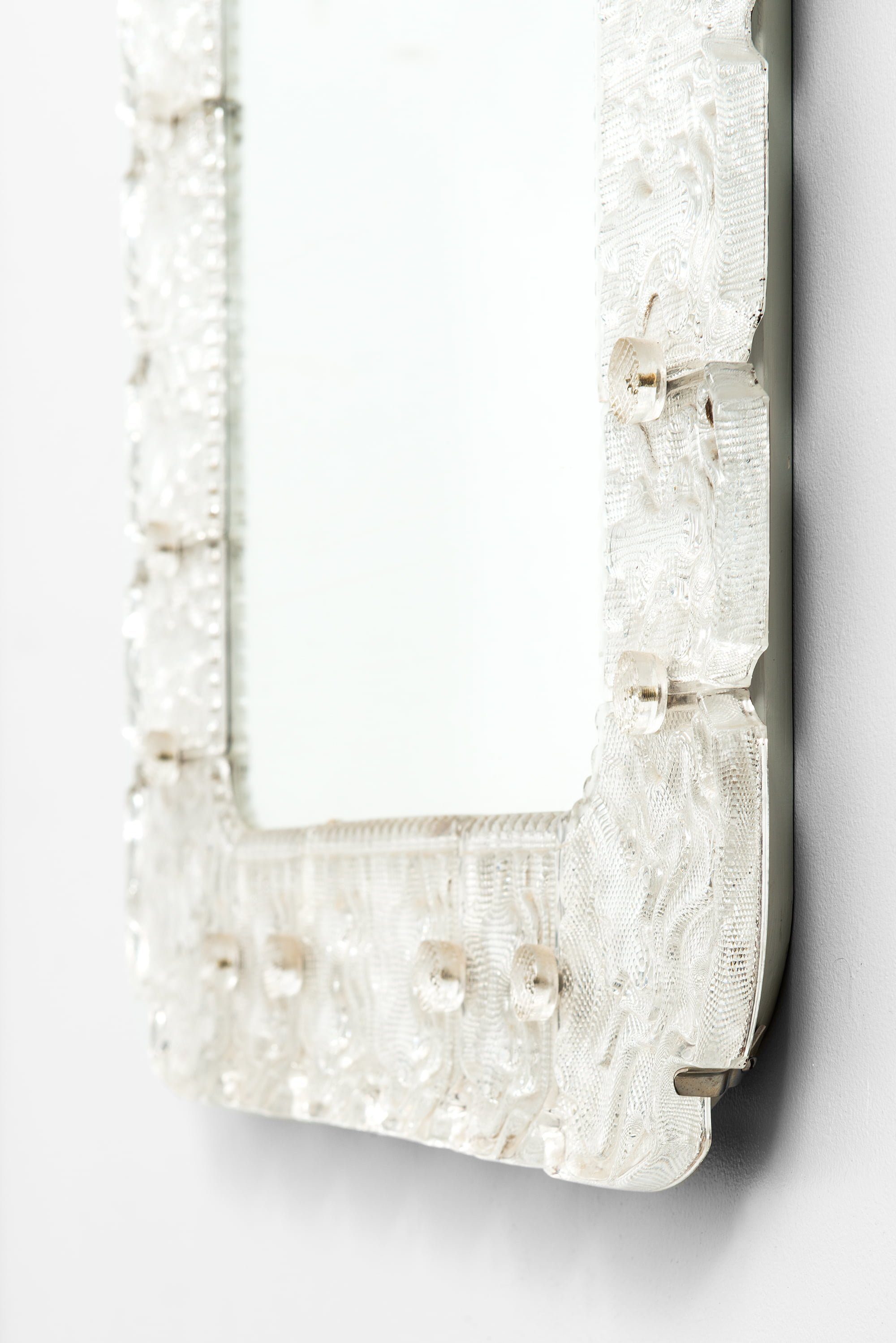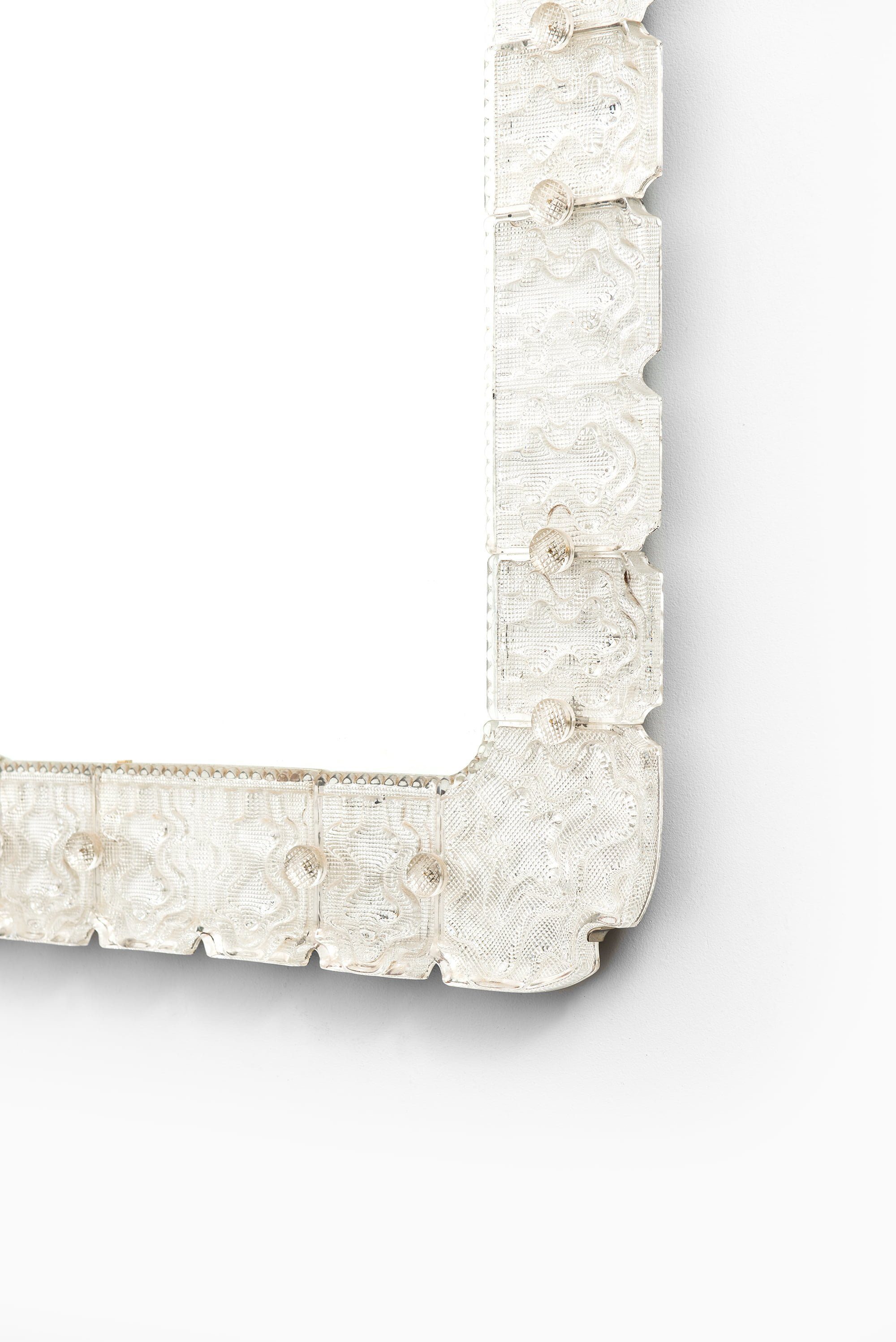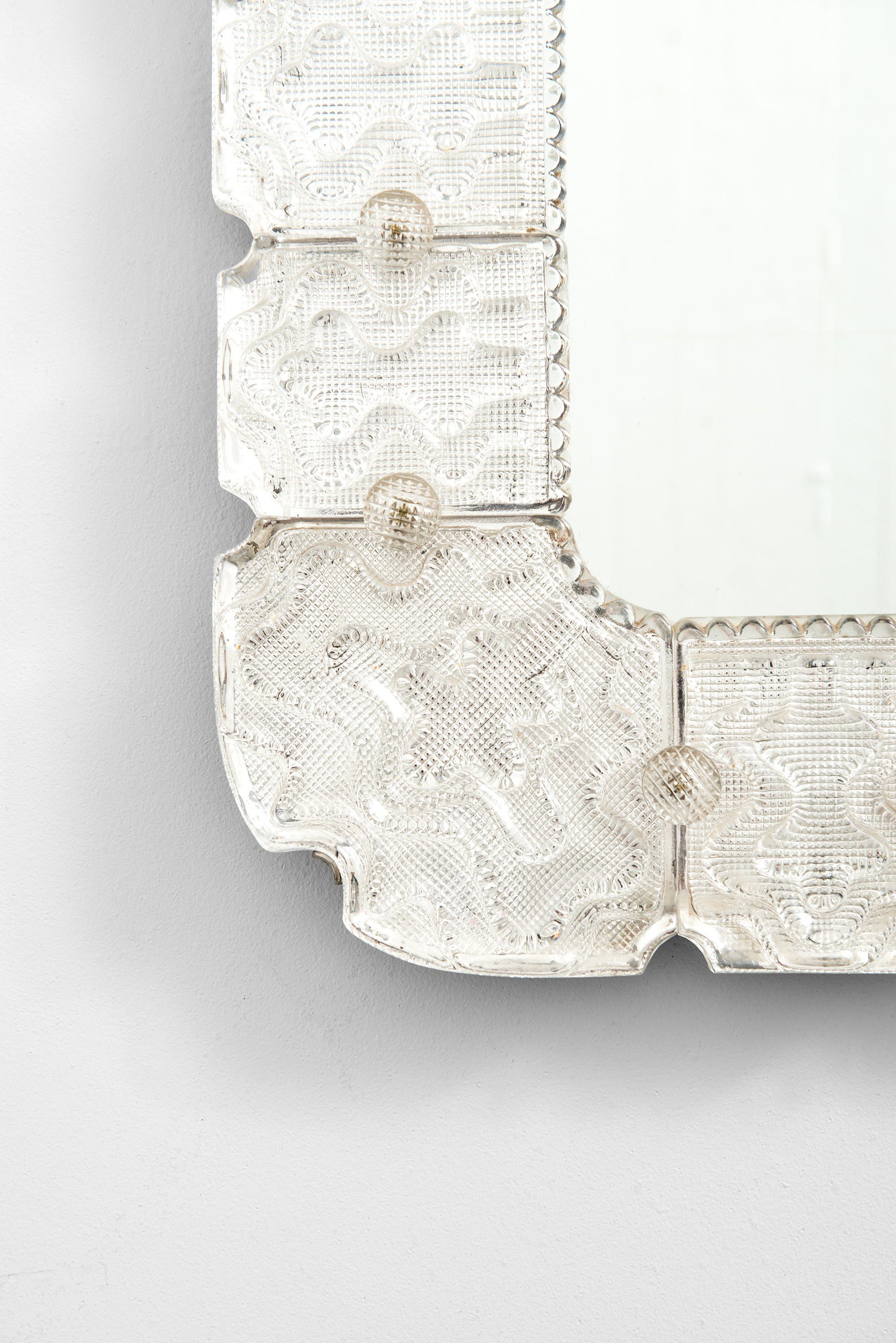This very rare and large mirror was designed by Carl Fagerlund and produced by Orrefors in Sweden during the 1940s. The frame is composed of hand-cast glass segments, each exhibiting a rich, textured surface with rhythmic relief patterns that capture and refract light. The precision of the glasswork, typical of Orrefors’ mid-century craftsmanship, creates a luminous border around the central mirror, balancing sculptural depth with visual transparency.