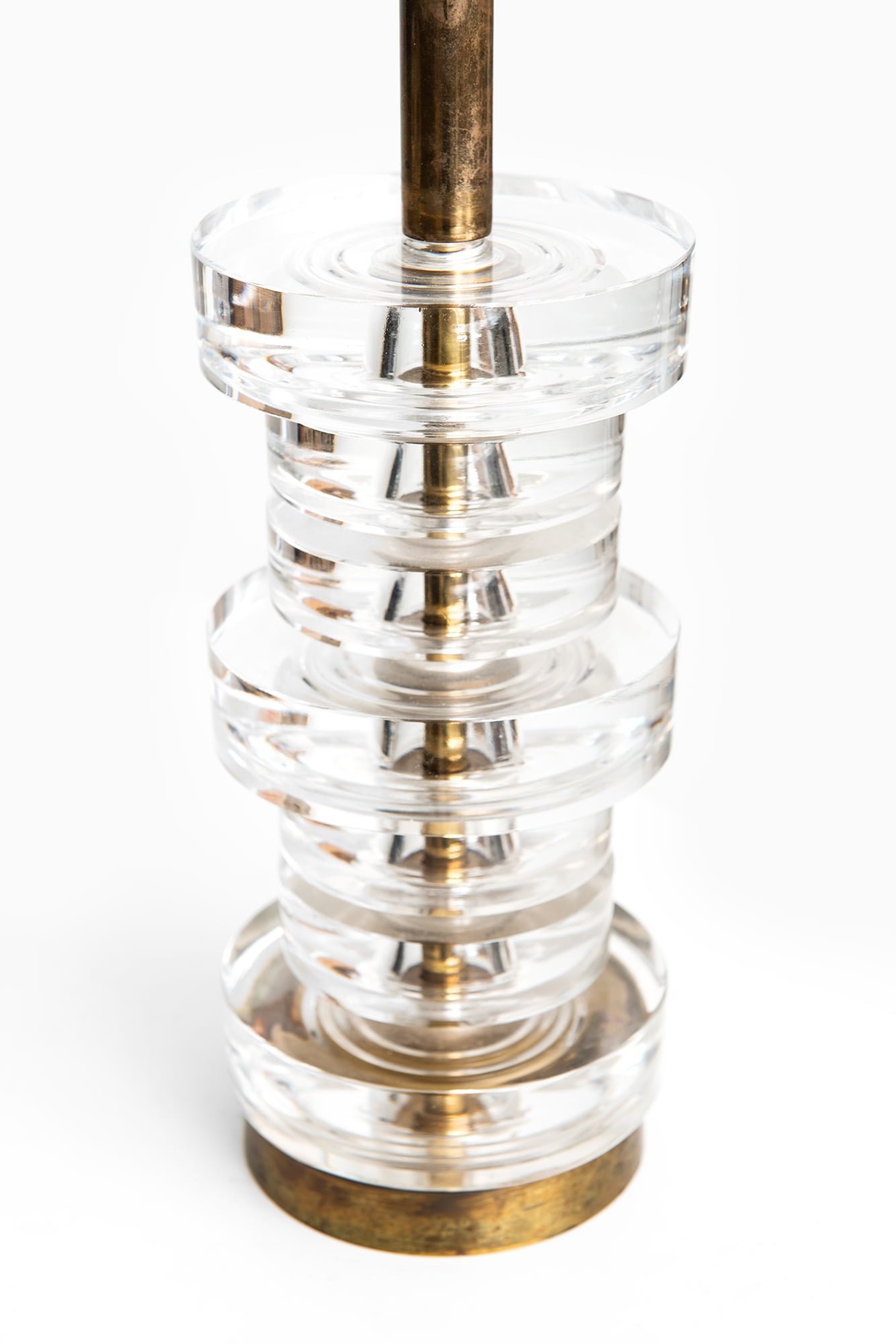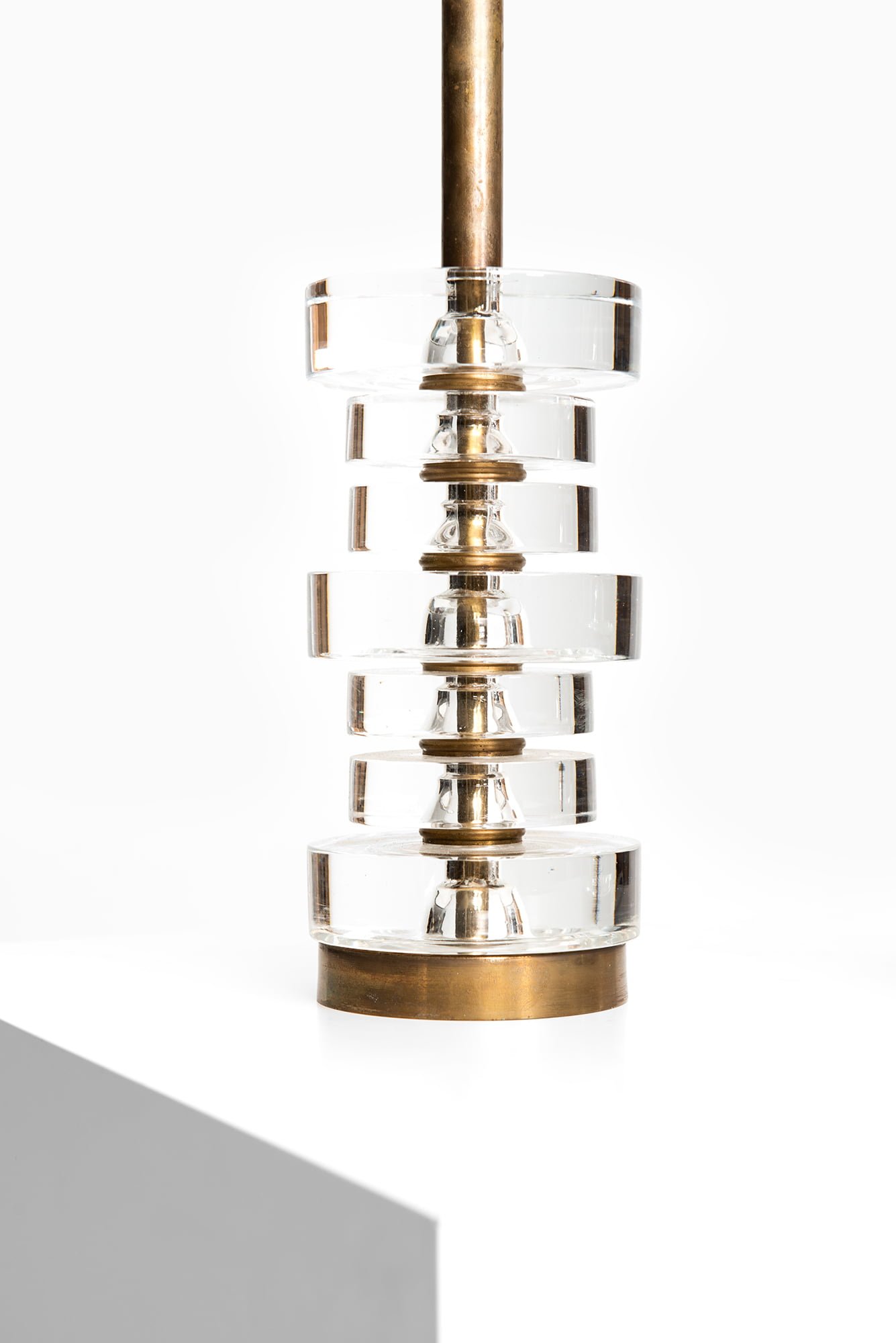 Each lamp is constructed with a solid brass structure combined with stacked, thick clear glass elements arranged concentrically around the central stem. The glass components are precisely cut and polished, creating a strong architectural rhythm while allowing light to interact subtly with the transparent surfaces. The brass shows a warm tone with a natural patina, emphasizing the material’s age and authenticity. Orrefors production markings are present, confirming origin and period.