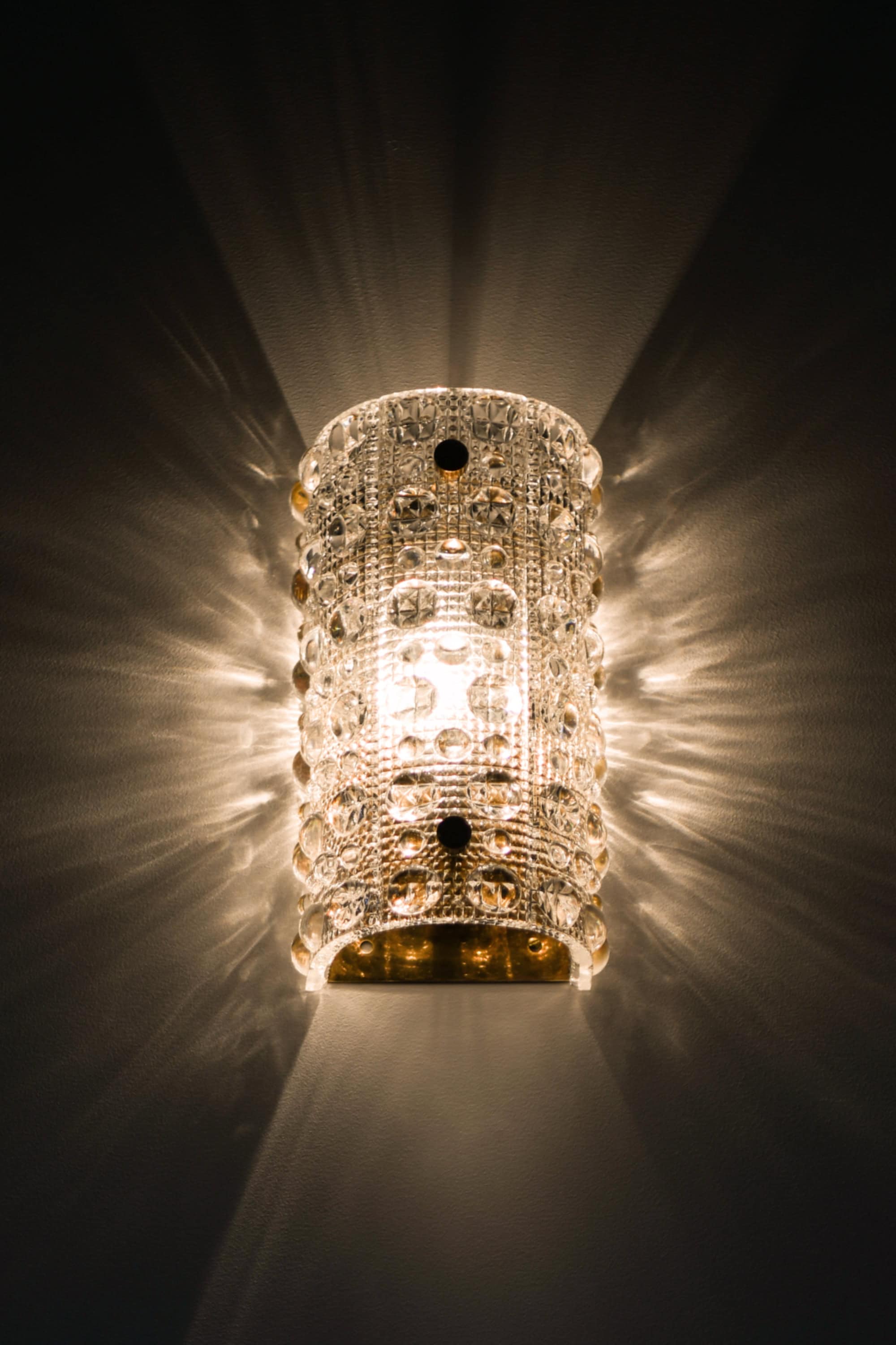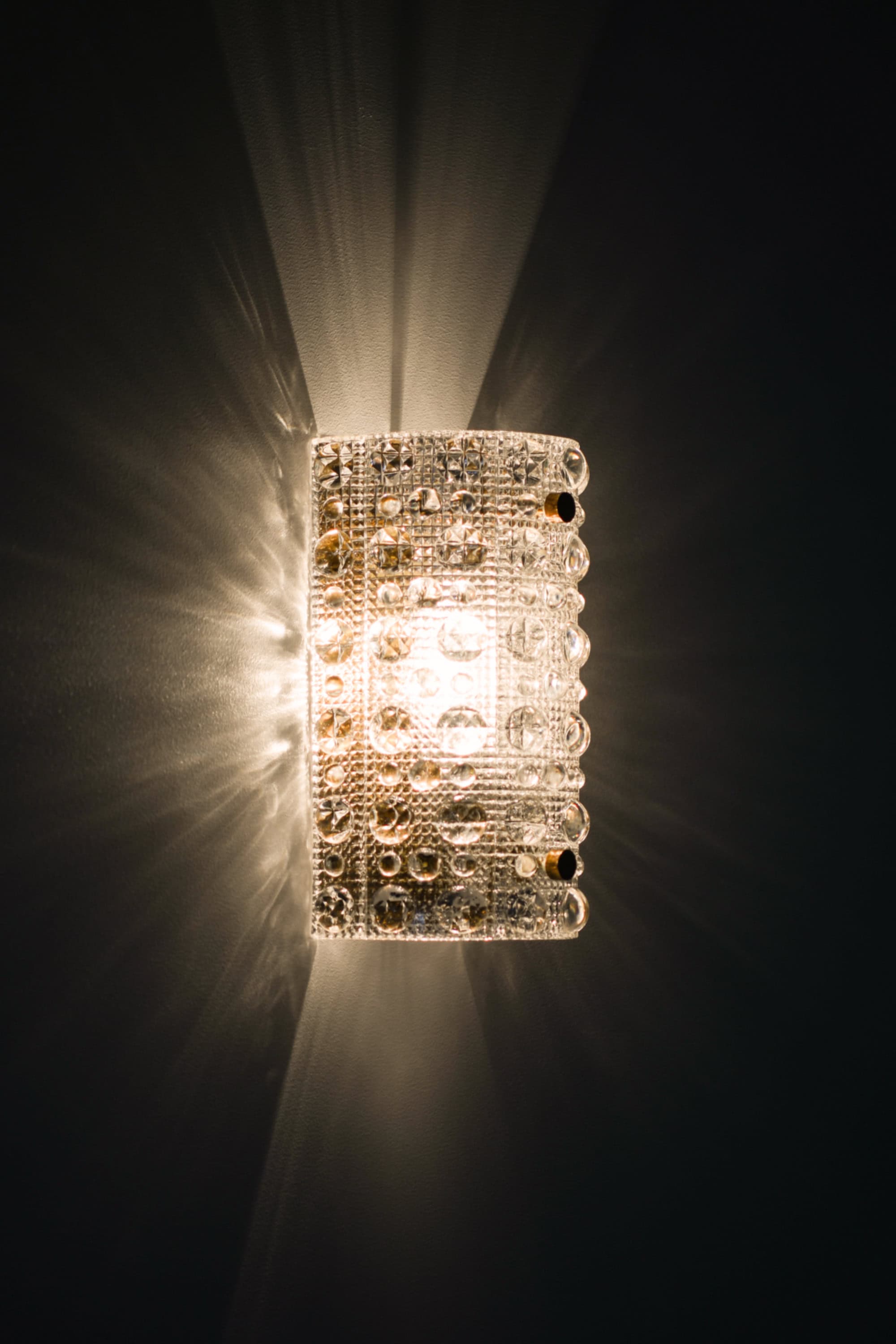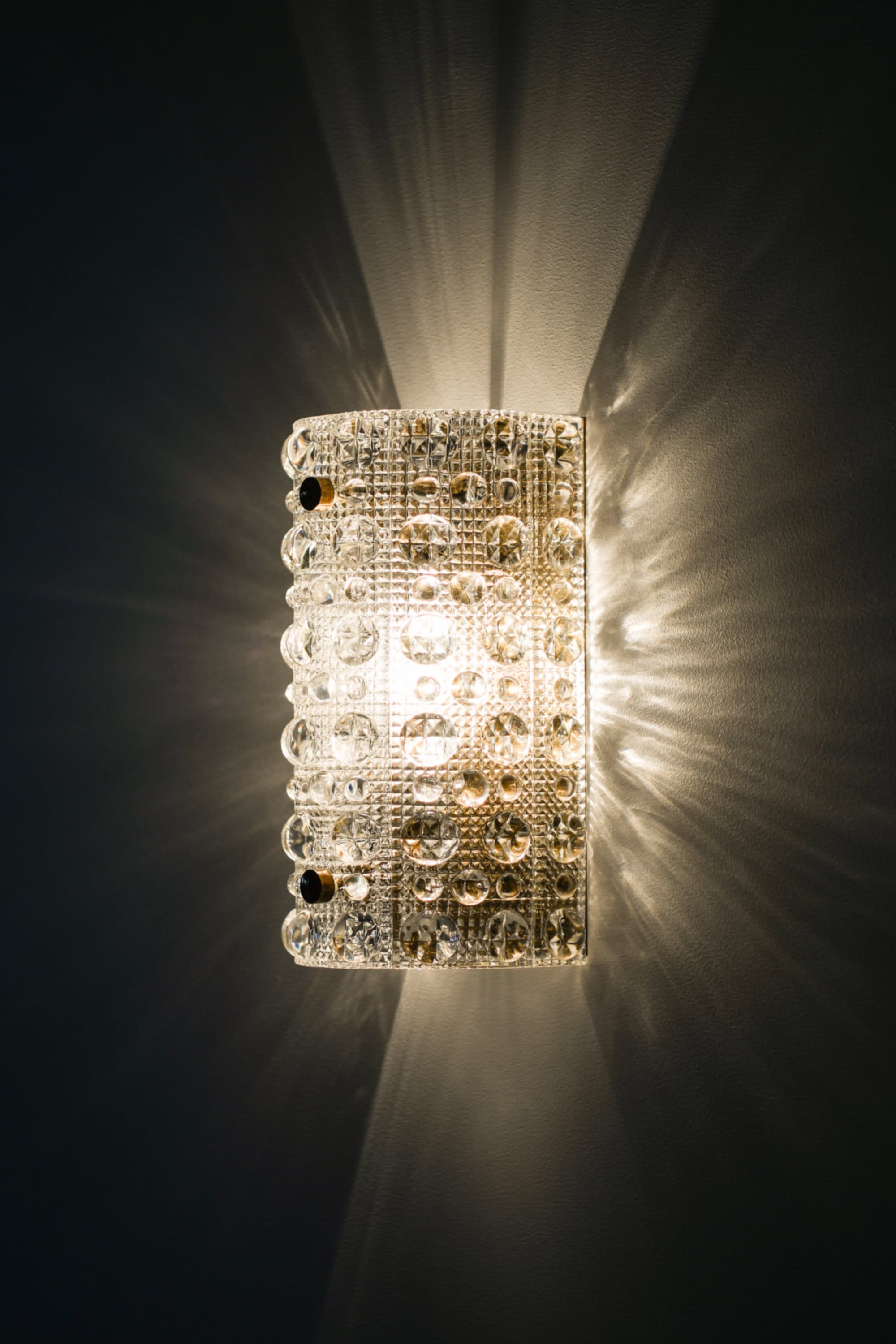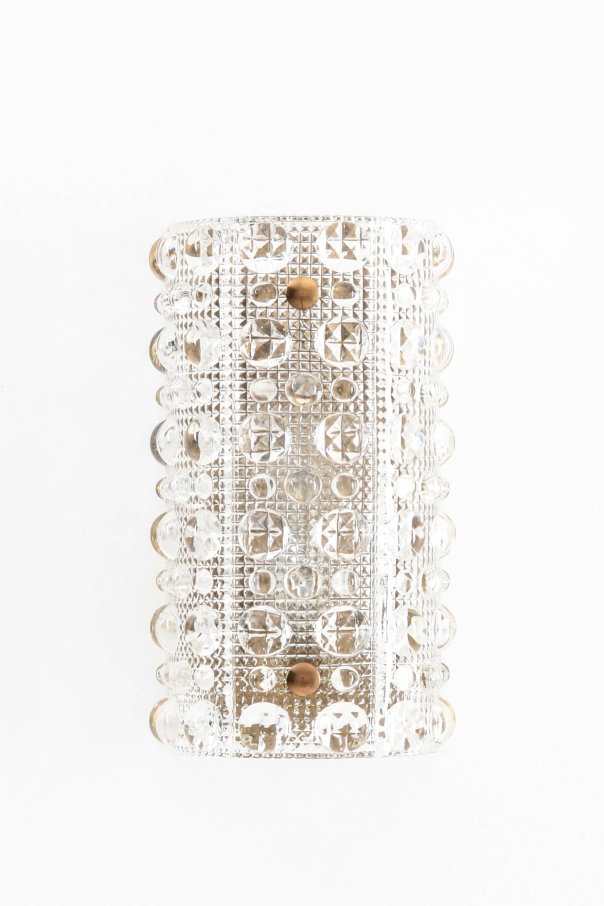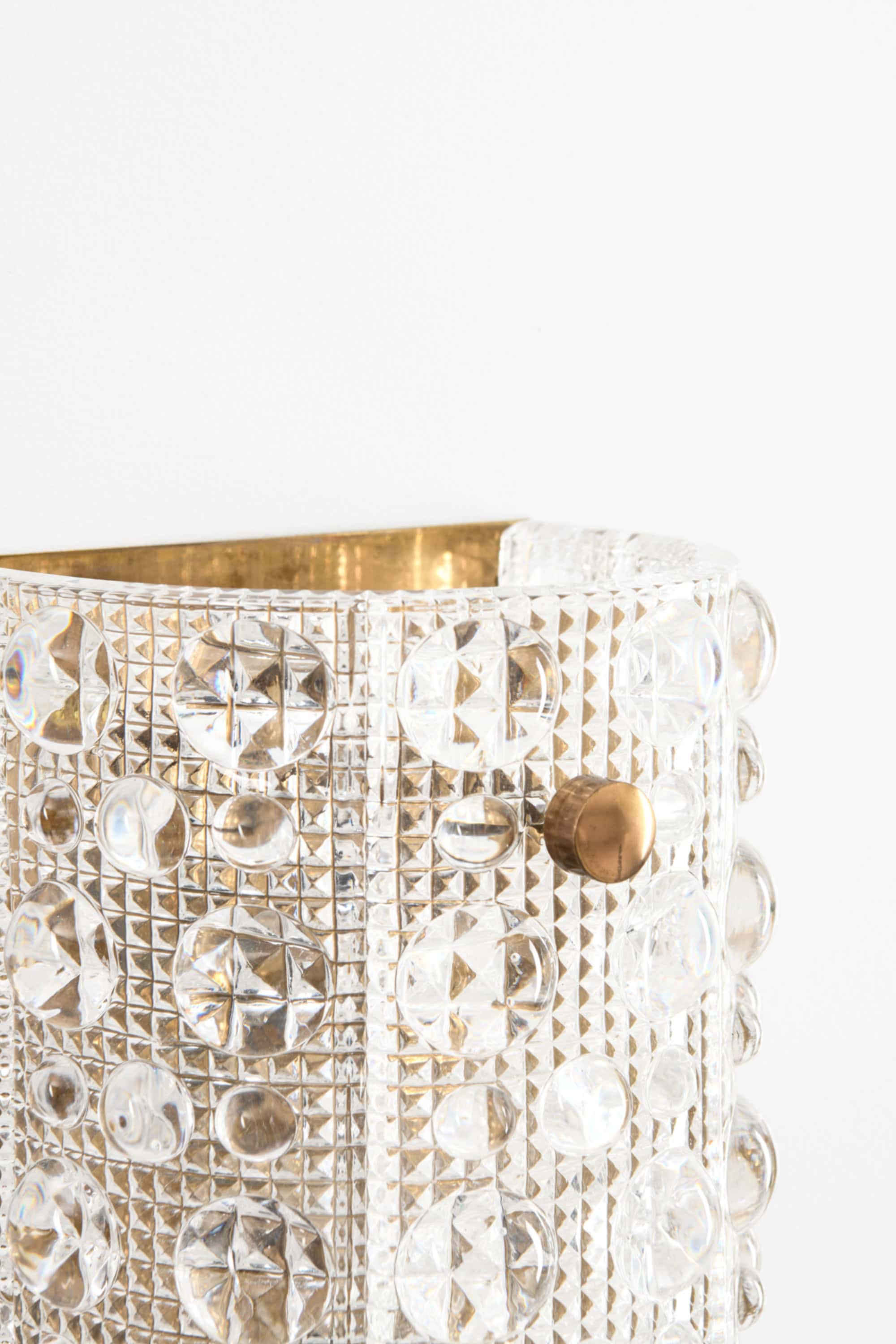 This set of wall lamps features curved glass shades composed of thick, textured crystal with a repeating pattern of raised circular and faceted elements. The glass is clear and highly refractive, and its surface structure creates intricate light dispersion when illuminated. Each shade is mounted with small brass fasteners and backed by a brass reflector, visible from the lower opening, which contributes additional warmth to the emitted light. The form is vertically oriented and gently rounded, giving the lamps a sculptural yet refined presence on the wall.