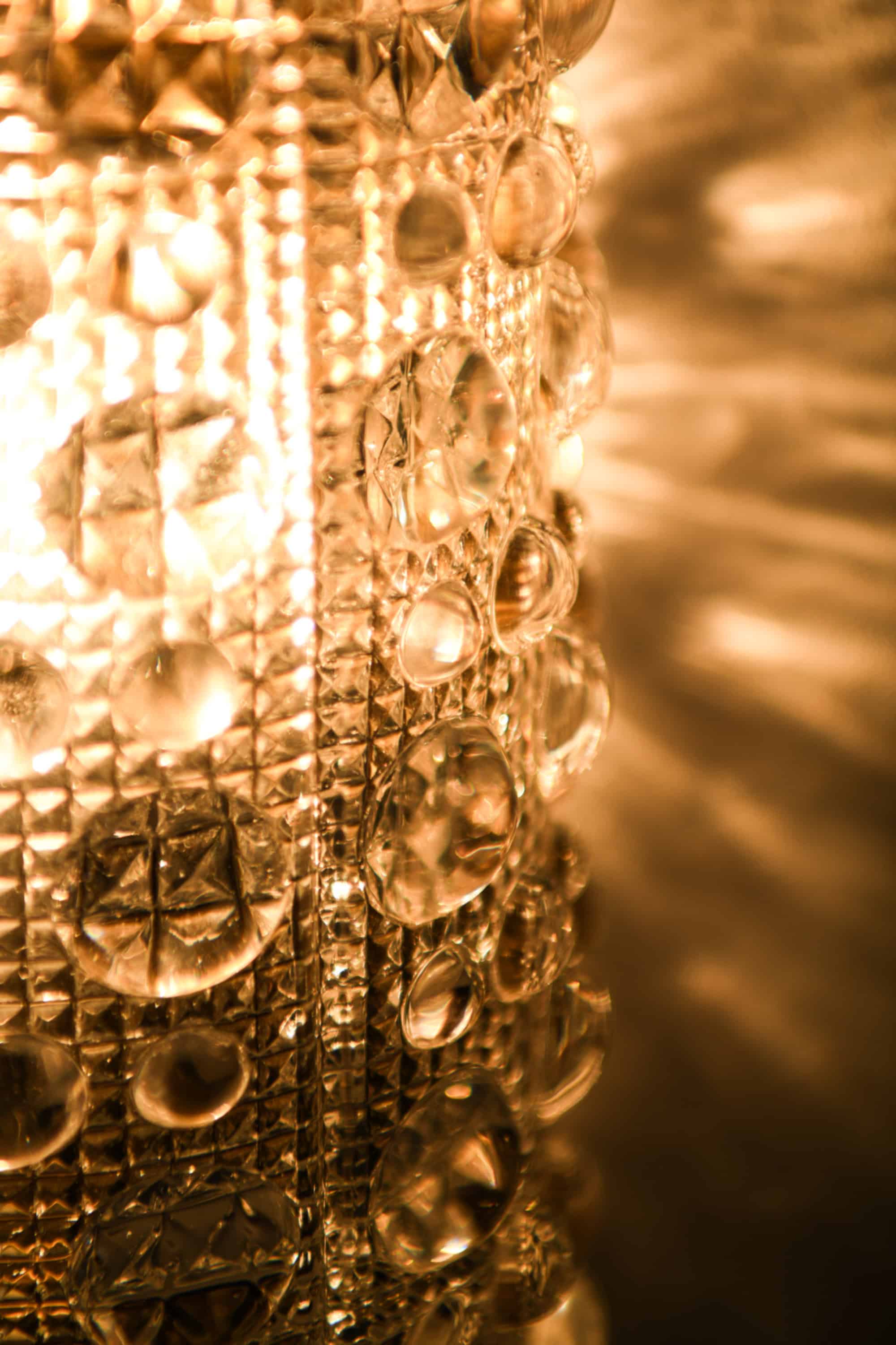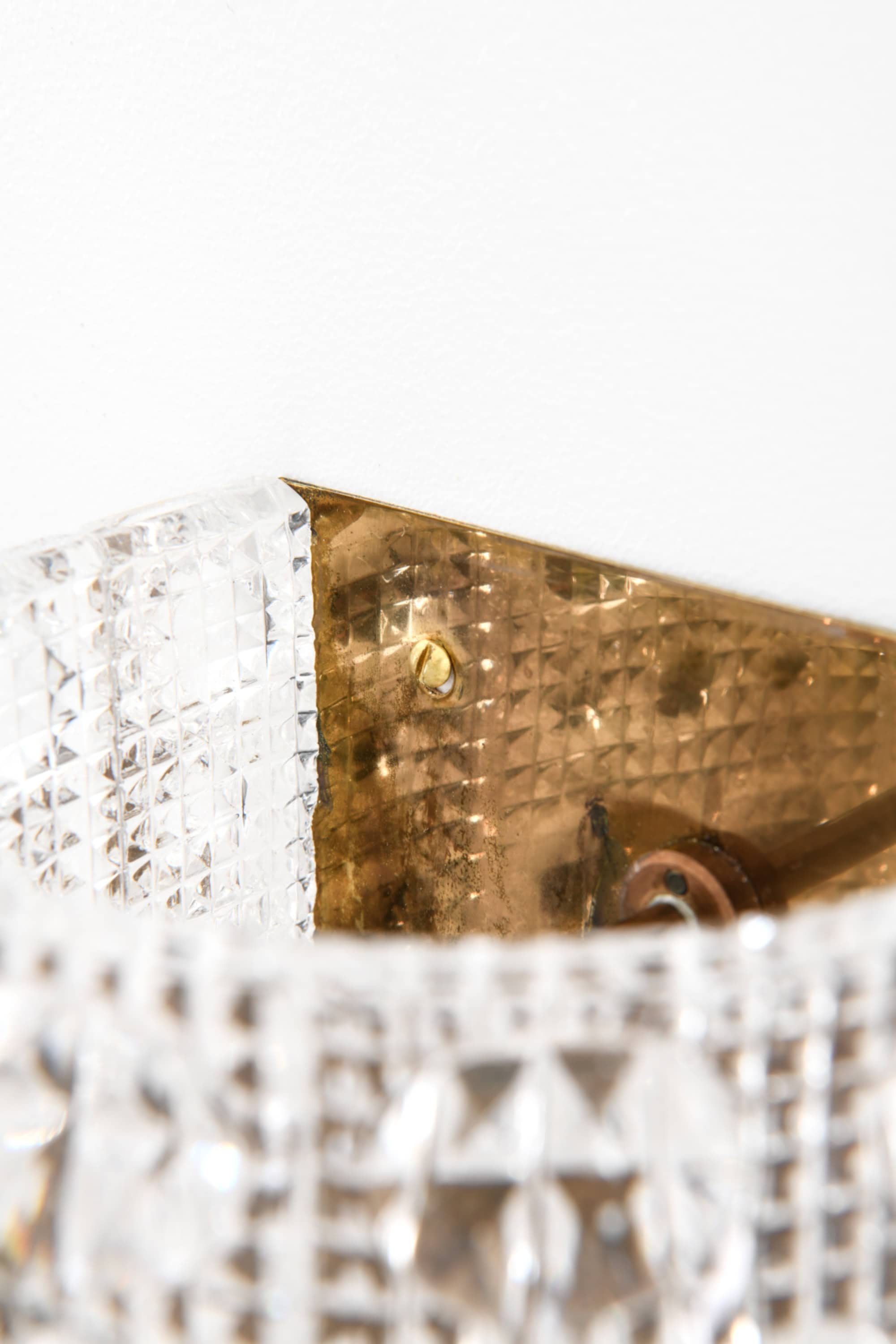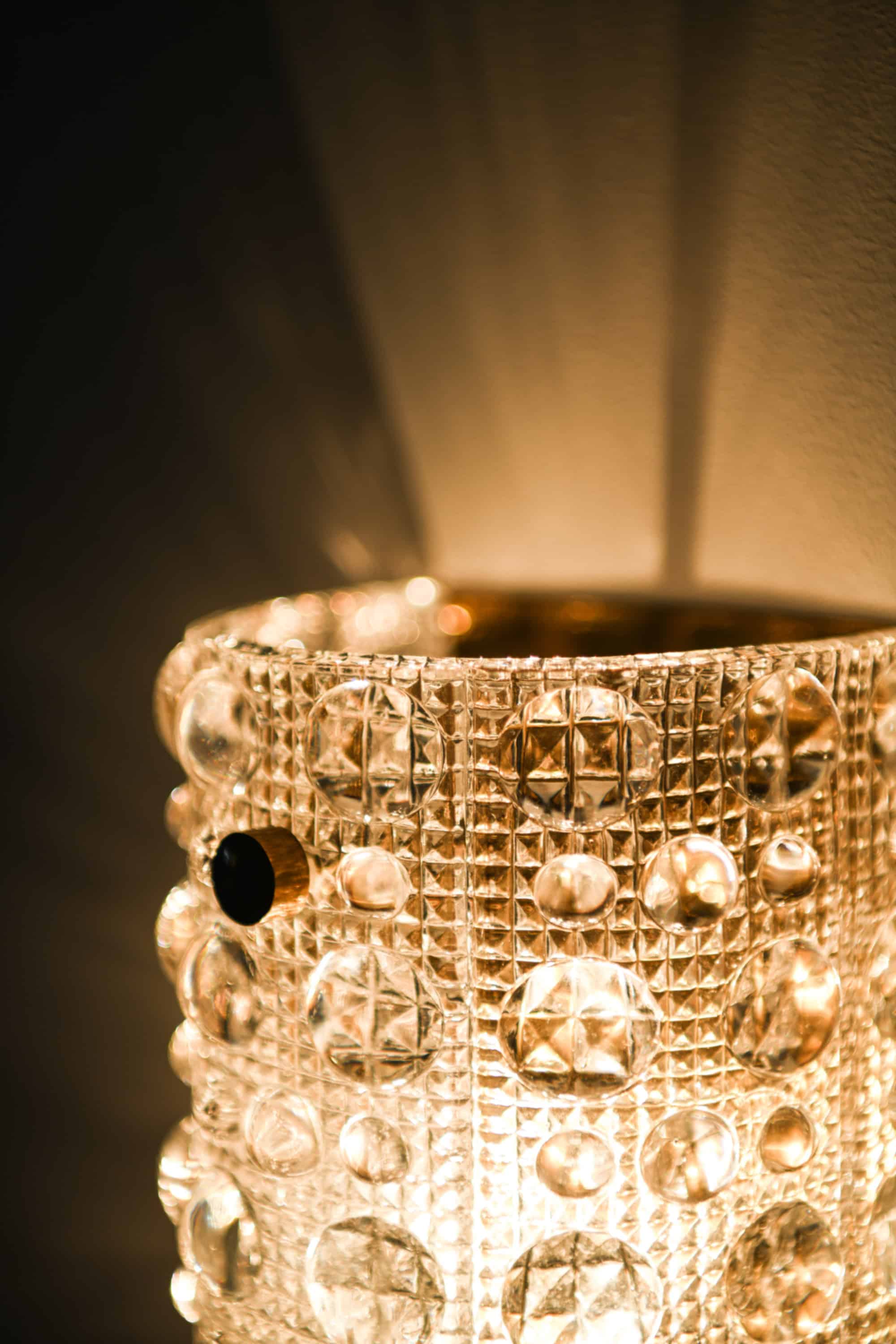 Stylistically, the lamps reflect Scandinavian modernism enriched with the more ornamental tendencies of mid-century glass design. The patterned crystal produces a distinctive radiating glow, and the brass components add a subtle contrasting warmth. The combination of materials and the geometric decoration give the model Venus a luxurious yet understated character.