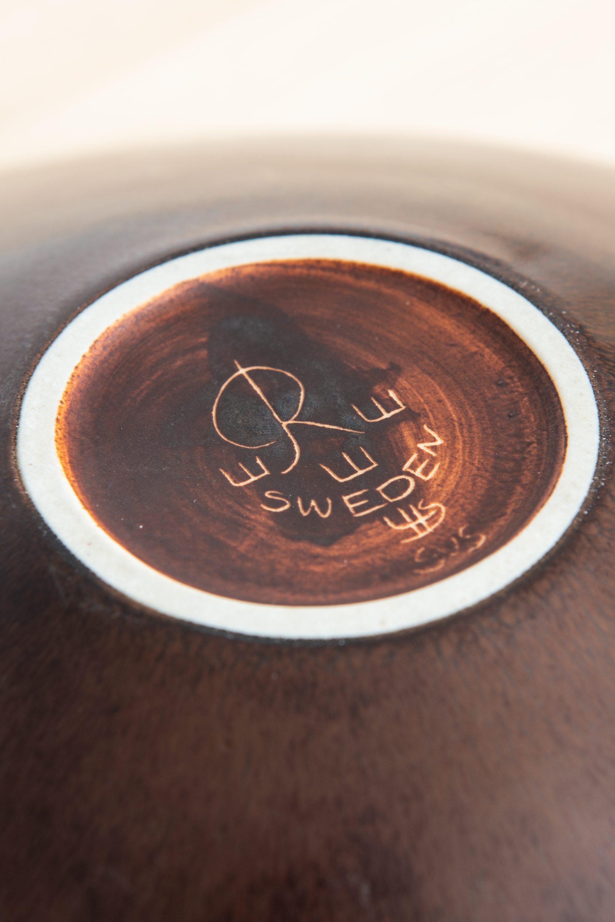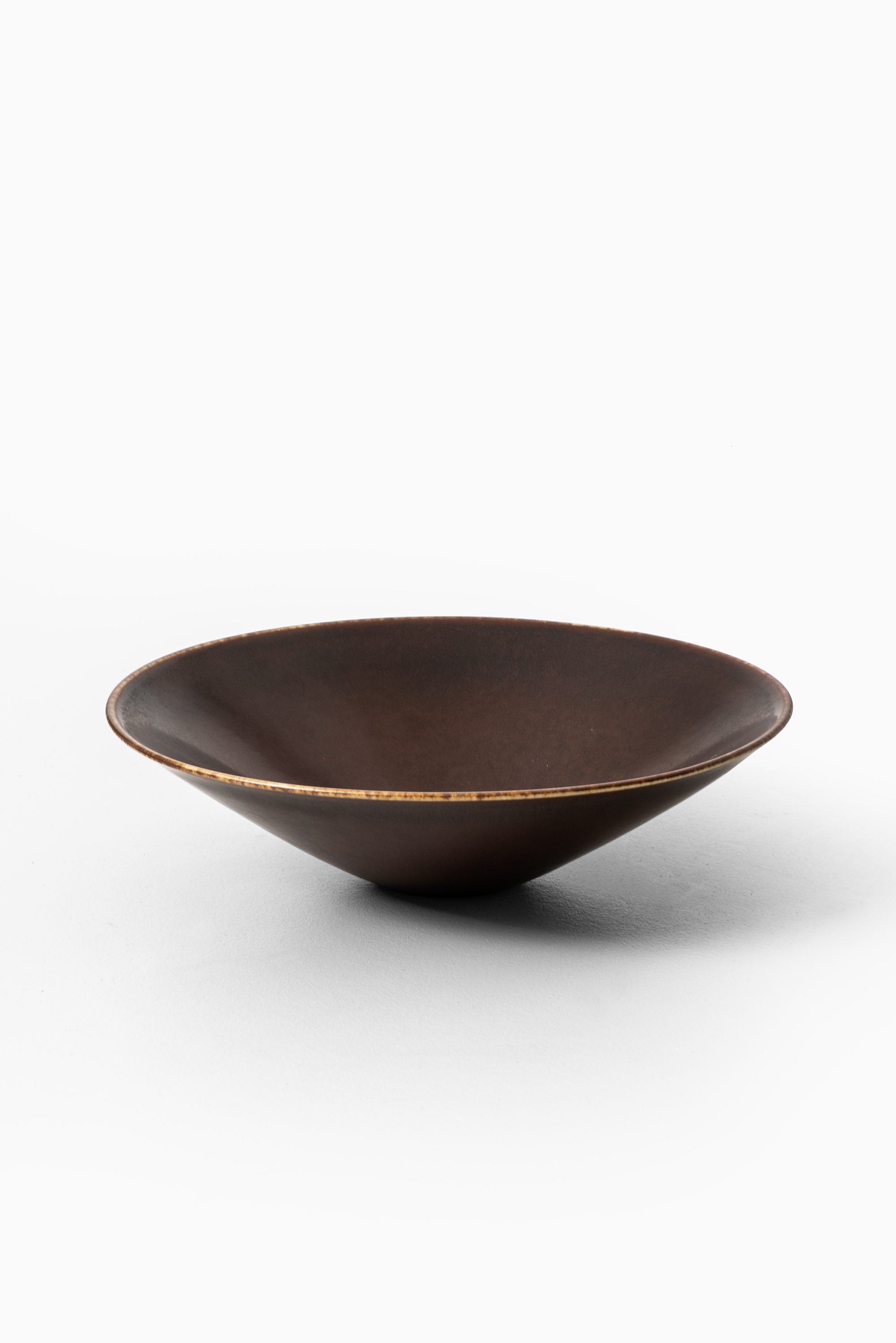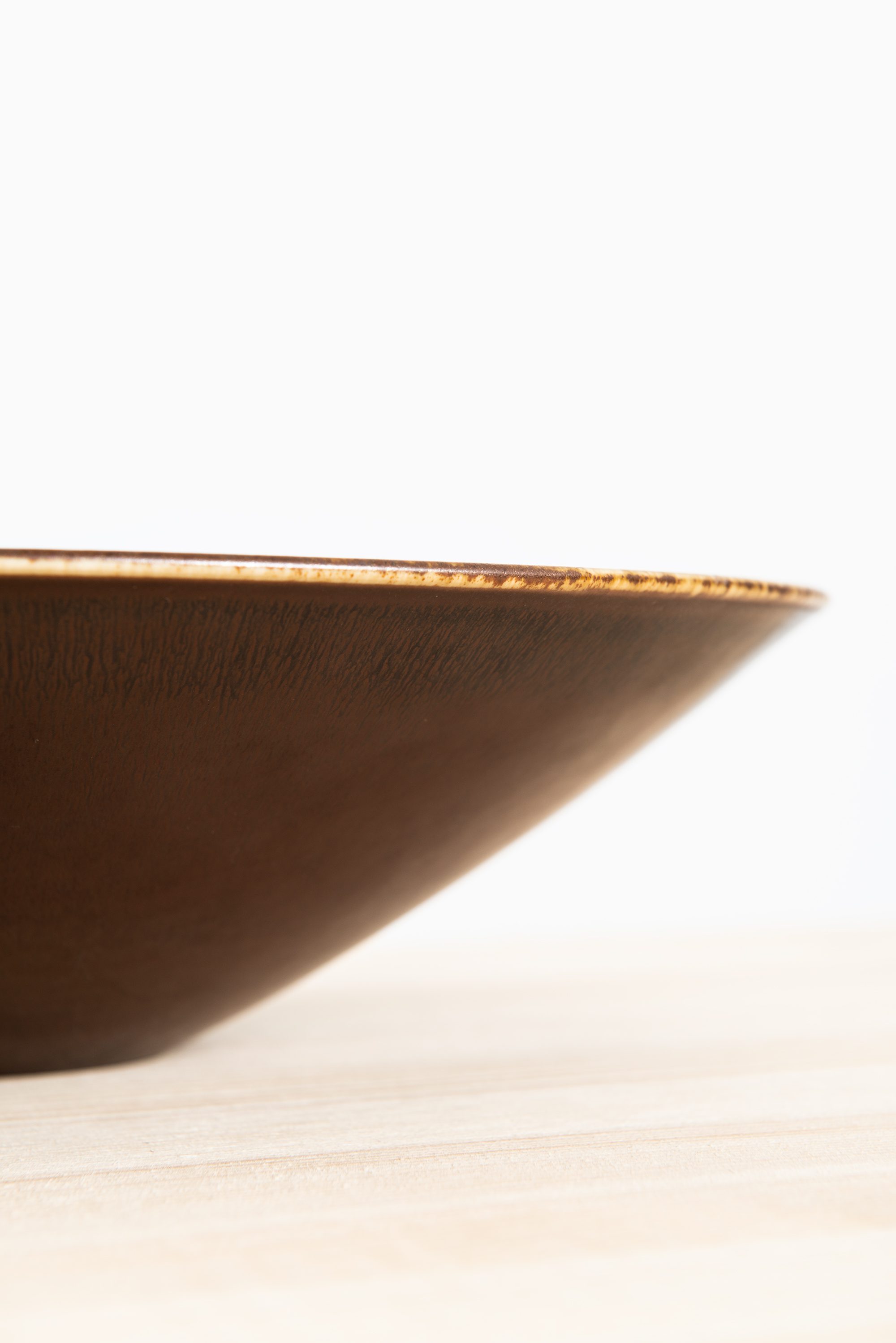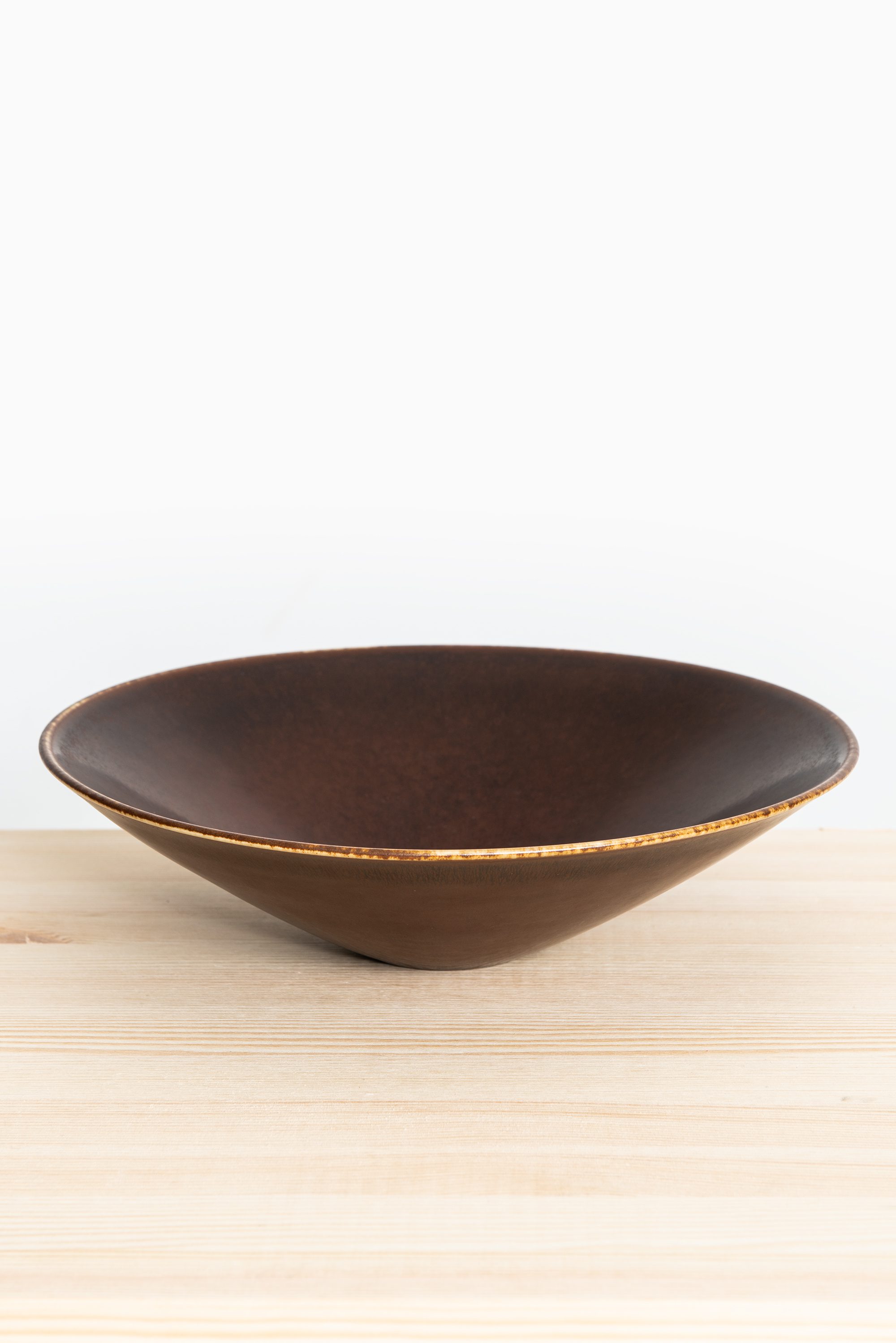 This ceramic bowl was designed by Carl-Harry Stålhane for Rörstrand in Sweden during the 1950s. The piece features a refined, shallow form with a softly curved profile and a narrow foot, highlighting Stålhane’s mastery of proportion and balance. Executed in a warm brown glaze with subtle tonal variation and a slightly lighter rim, the surface displays the tactile, earthy character typical of his mid-century stoneware production.