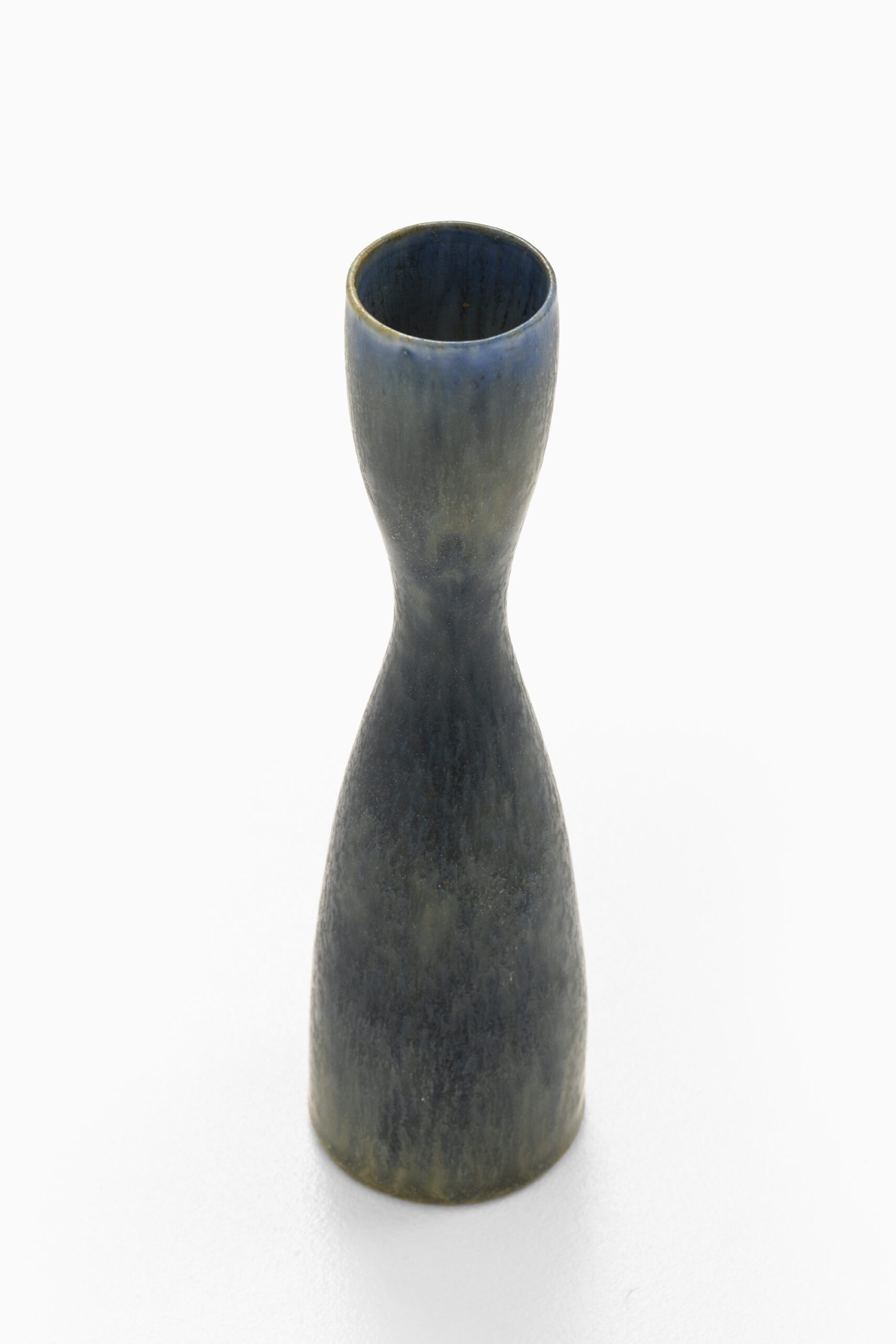 The vase features a slender, hourglass-shaped silhouette, narrowing gracefully at the center before widening toward both the top and bottom. Its surface is coated with a semi-matte glaze exhibiting a rich blend of blue and green hues. The glaze creates a subtle, flowing texture that suggests movement and depth, characteristic of Stålhane’s later explorations into dynamic ceramic surfaces.