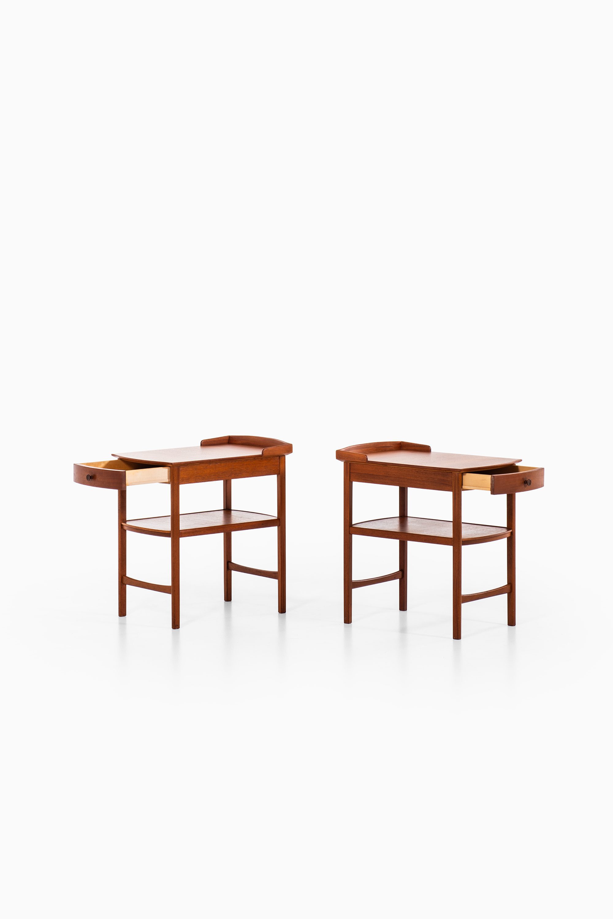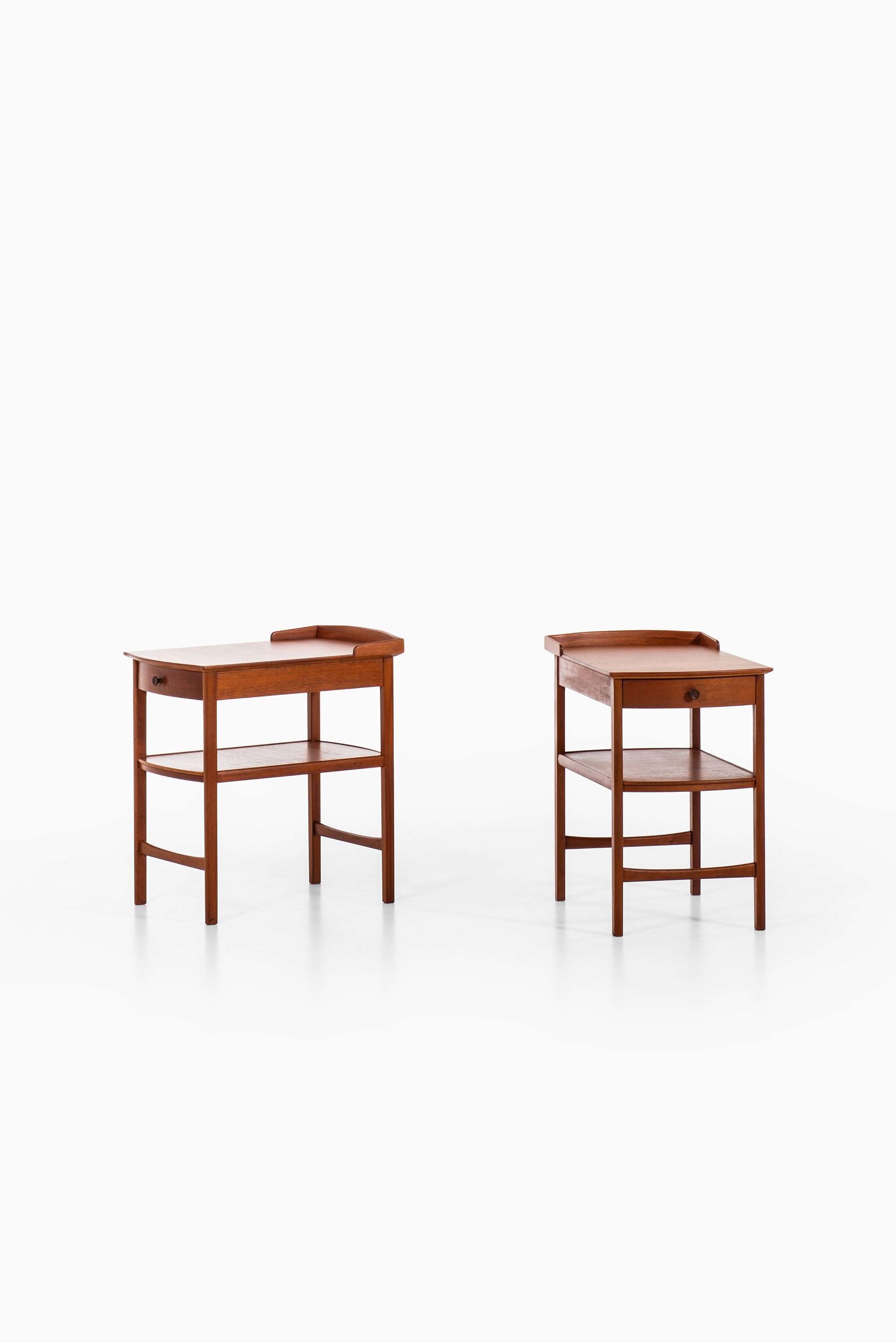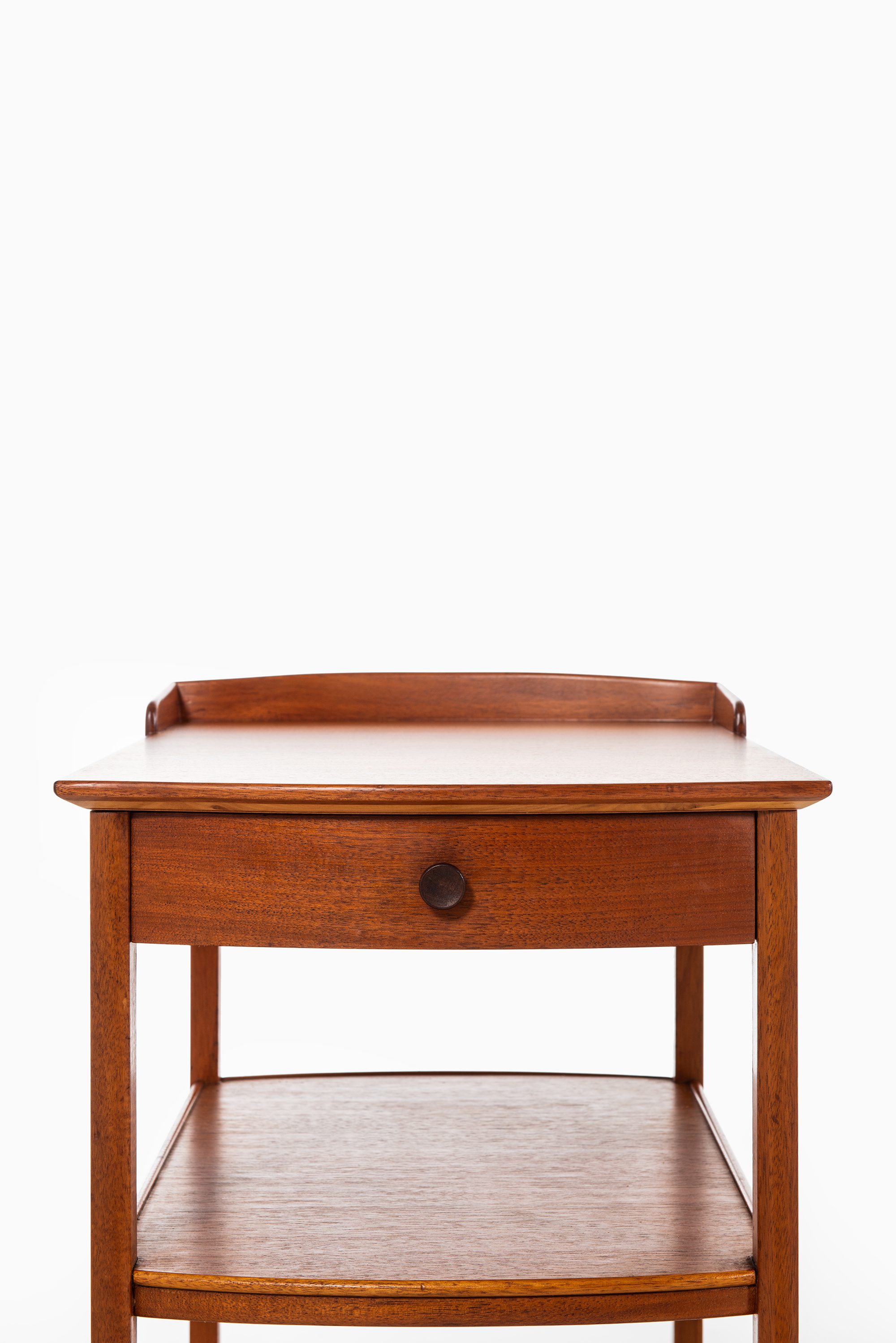 This pair of freestanding bedside or side tables was designed by Carl Malmsten and produced by Bodafors in Sweden during the 1950s. Executed in mahogany, the pieces demonstrate the refined craftsmanship and sense of proportion that characterizes Malmsten’s work. Both tables feature a rectangular top with softly rounded corners and a raised back edge, lending a subtle sculptural quality to the otherwise restrained form. Beneath the top, each table includes a shallow drawer with a simple round wooden pull, paired with a lower open shelf supported by four slender legs connected by stretchers.