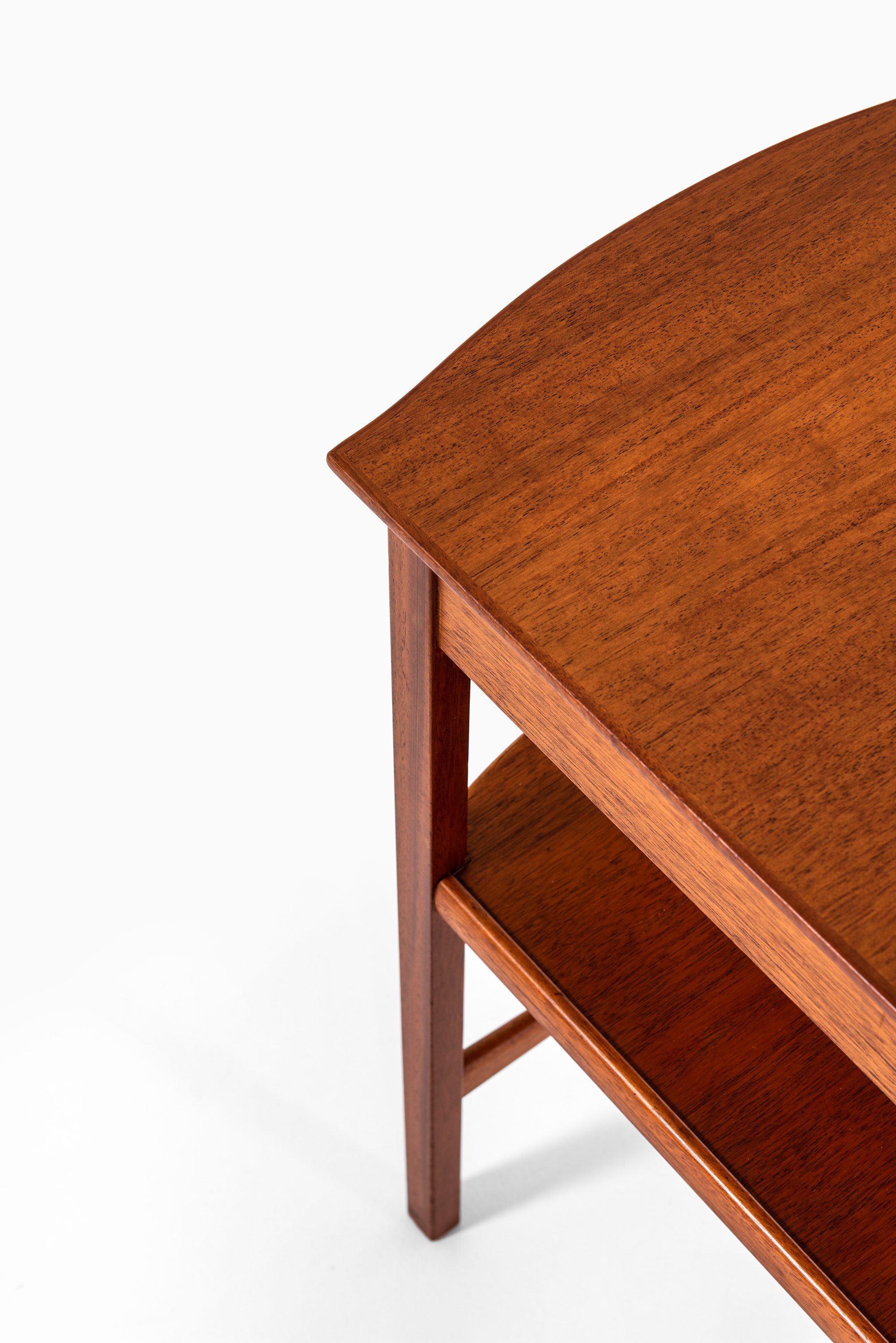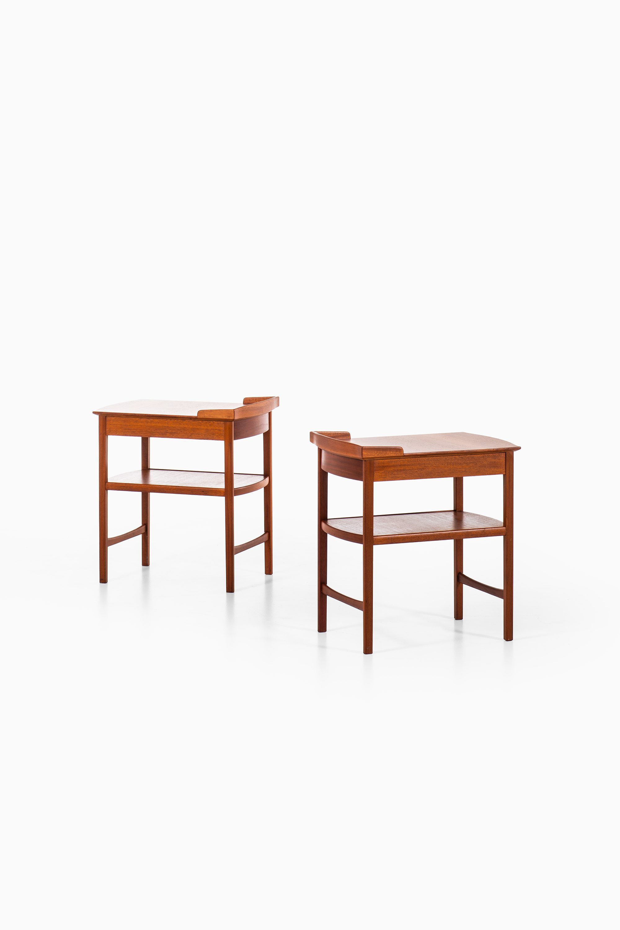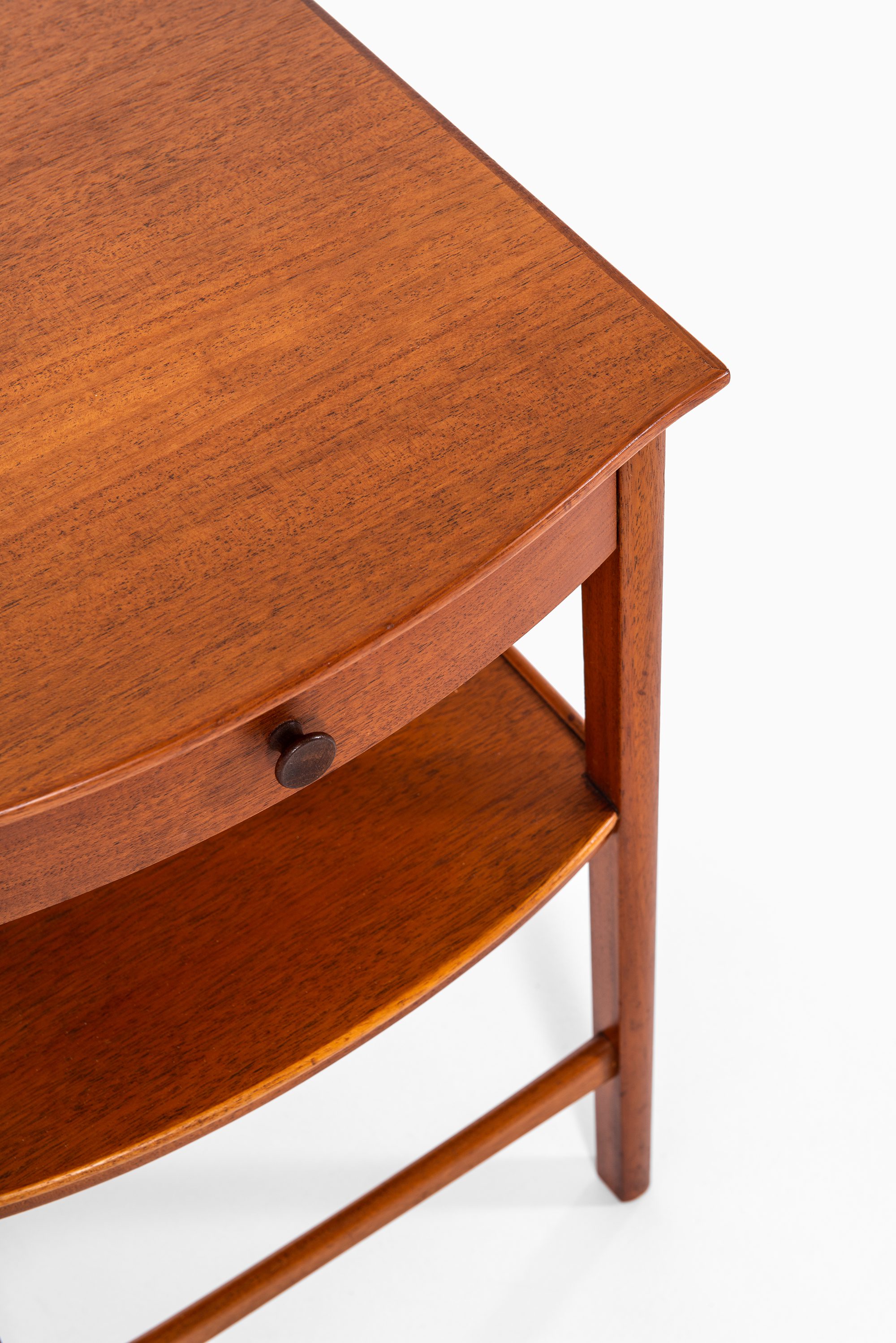 This pair of freestanding bedside or side tables was designed by Carl Malmsten and produced by Bodafors in Sweden during the 1950s. Executed in mahogany, the pieces demonstrate the refined craftsmanship and sense of proportion that characterizes Malmsten’s work. Both tables feature a rectangular top with softly rounded corners and a raised back edge, lending a subtle sculptural quality to the otherwise restrained form. Beneath the top, each table includes a shallow drawer with a simple round wooden pull, paired with a lower open shelf supported by four slender legs connected by stretchers.
